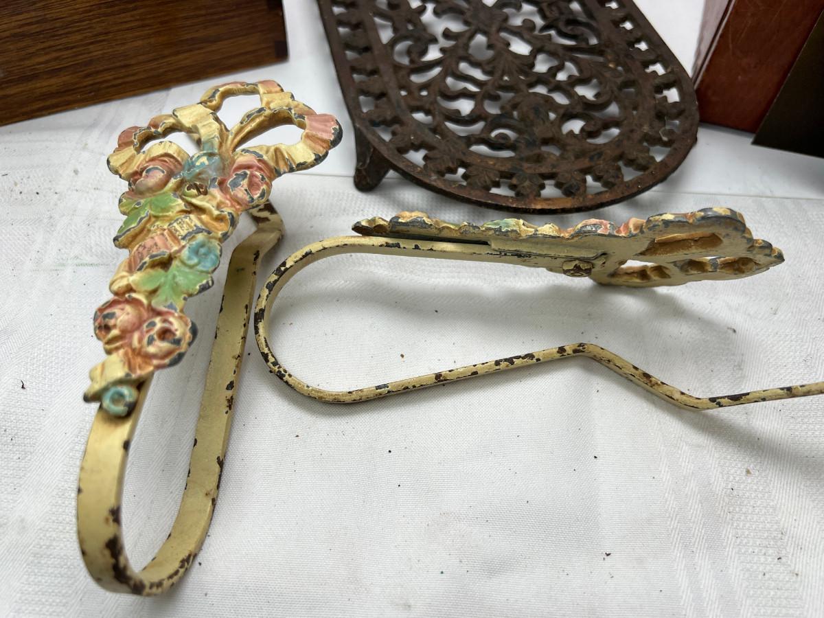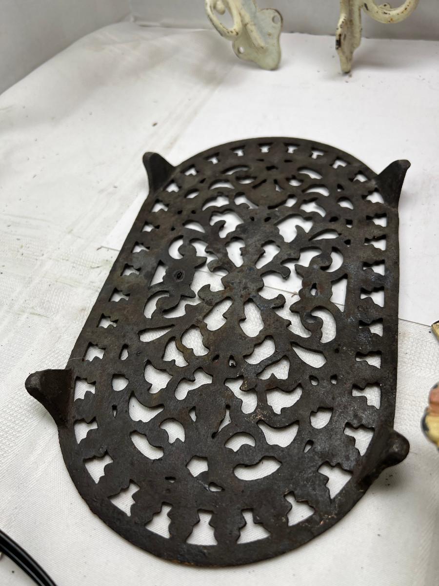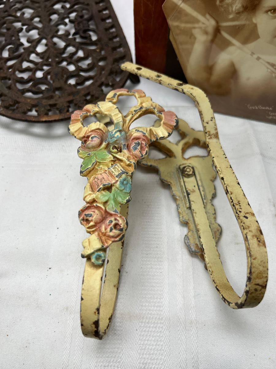 Corner 1950s scroll supports, metal trivet, Victorian enamel flower hooks
