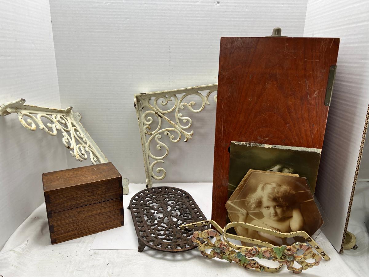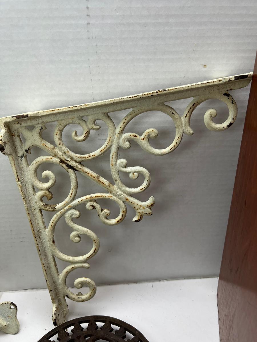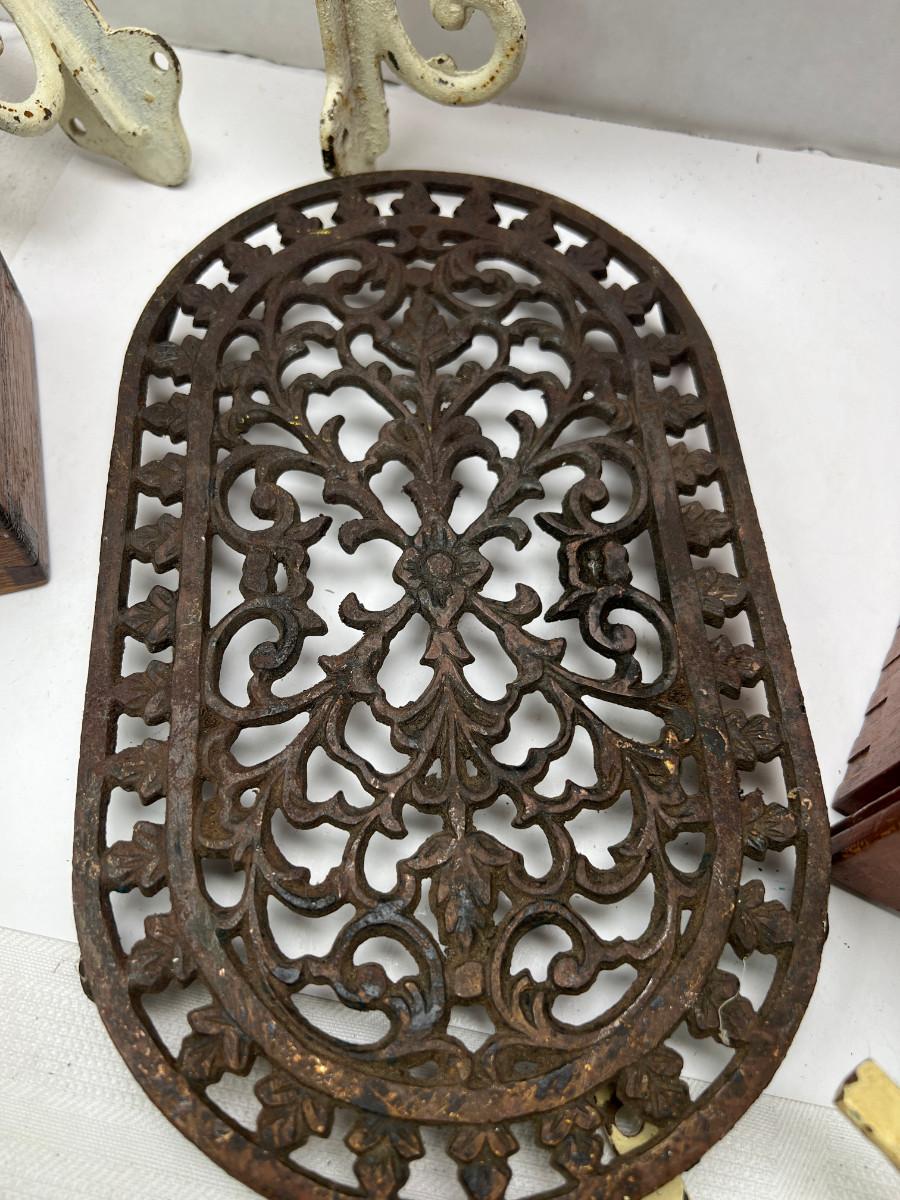 Corner 1950s scroll supports, metal trivet, Victorian enamel flower hooks