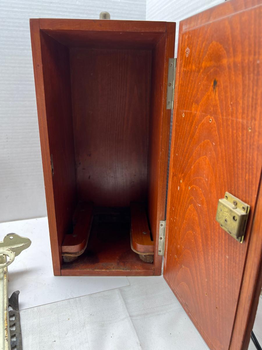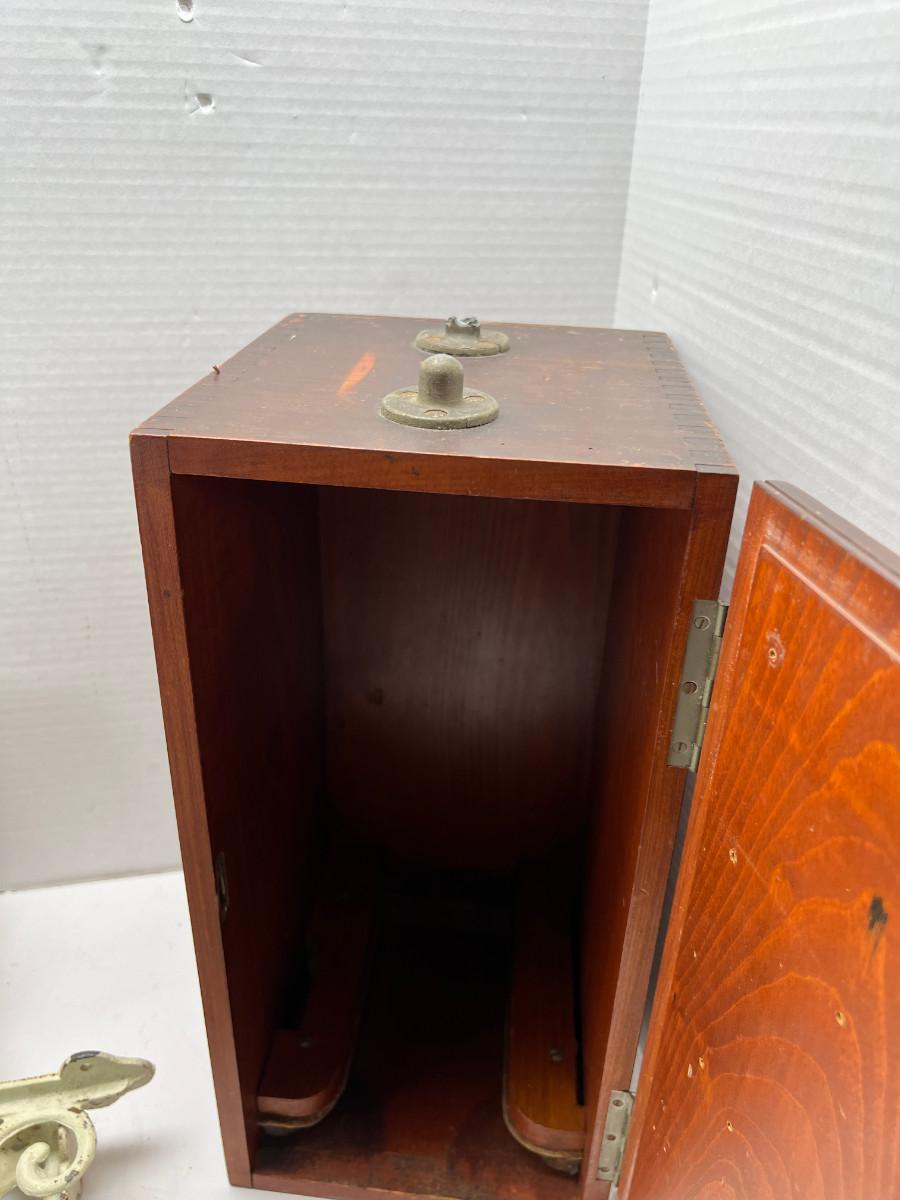 This is a unique box in very good condition, probably for some piece of equipment since it is dovetail joint and has a slip in piece inside. Wooden recipe box, hooks and shelf holders. Can ship, heavy.