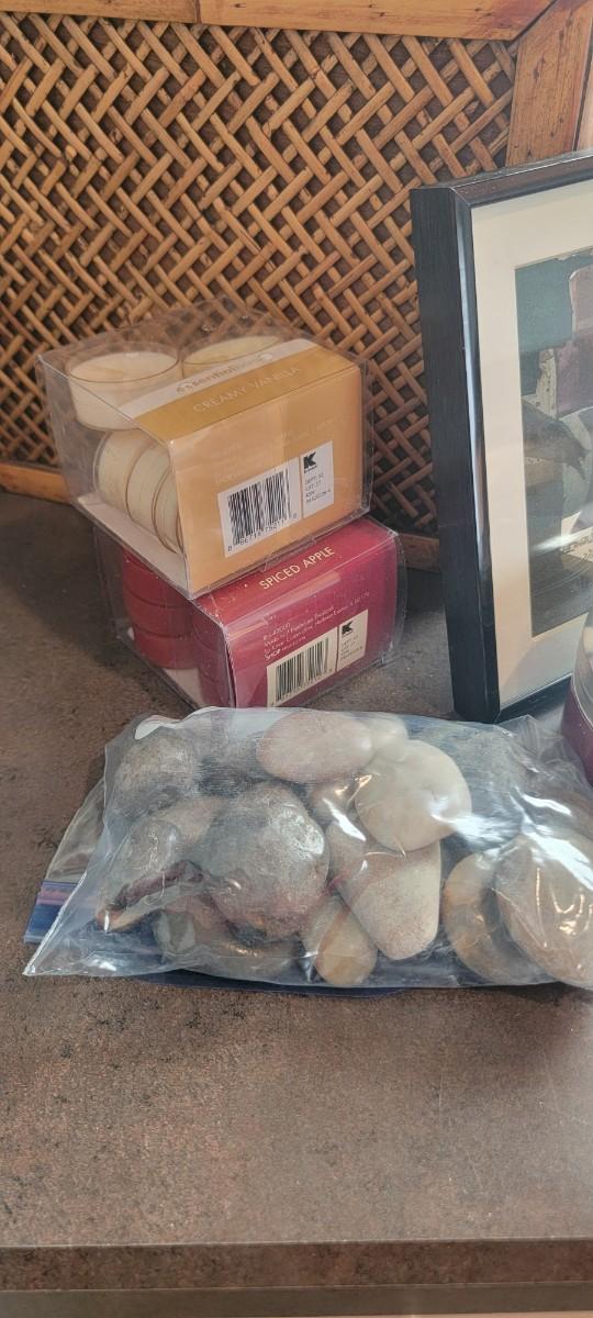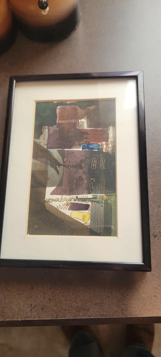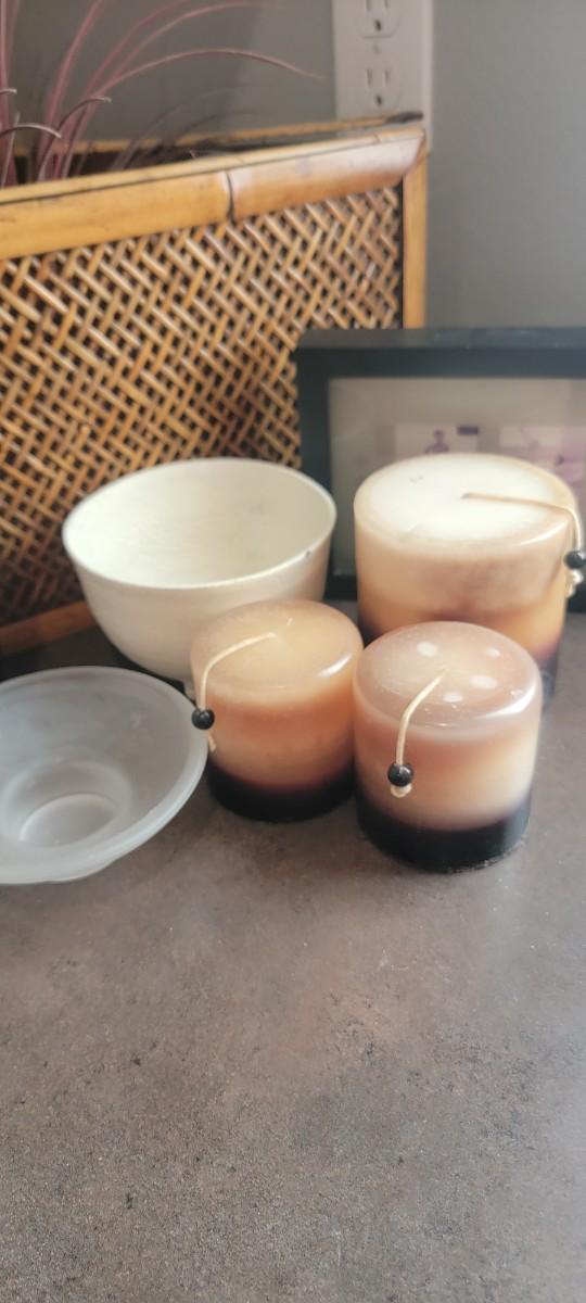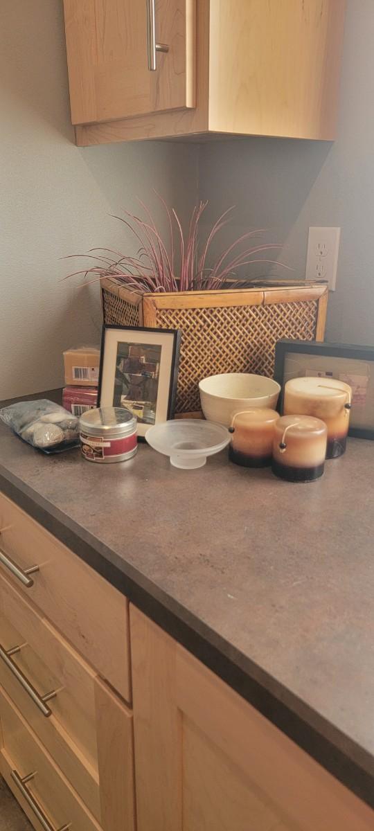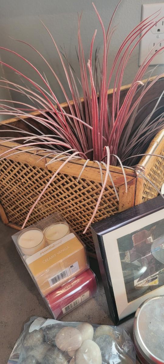Signed art and signed ceramic vessel. Candles, corner basket.