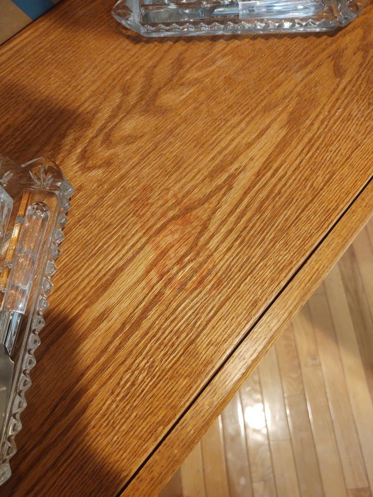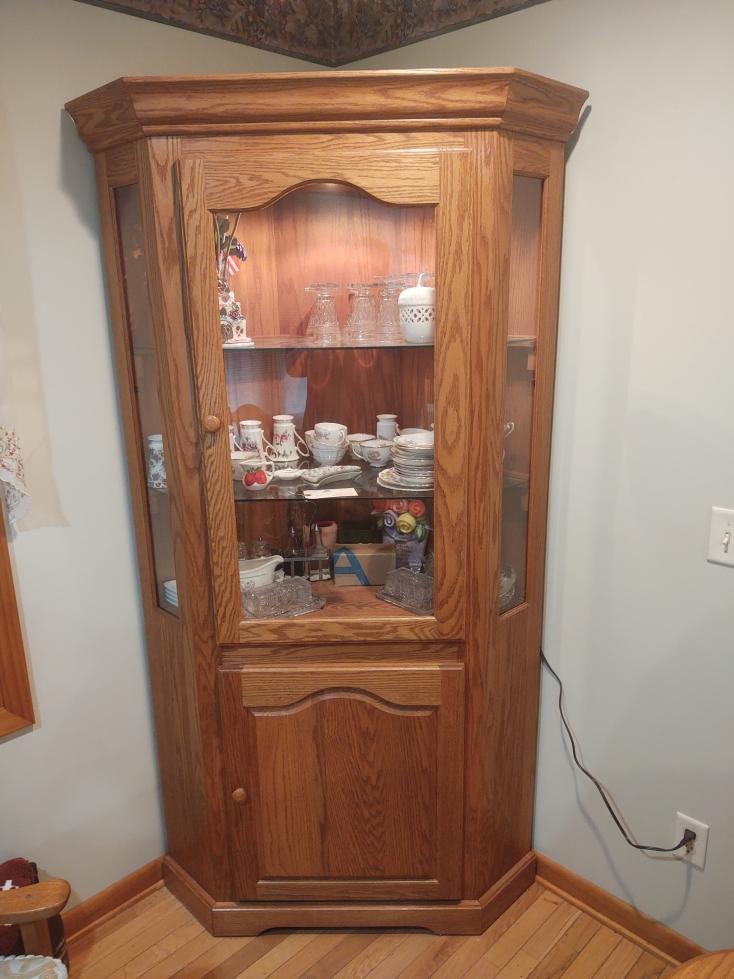 Corner lighted display cabinet. 32.5"x32.5"x79". Small stain on the bottom wood shelf (possibly wax).
