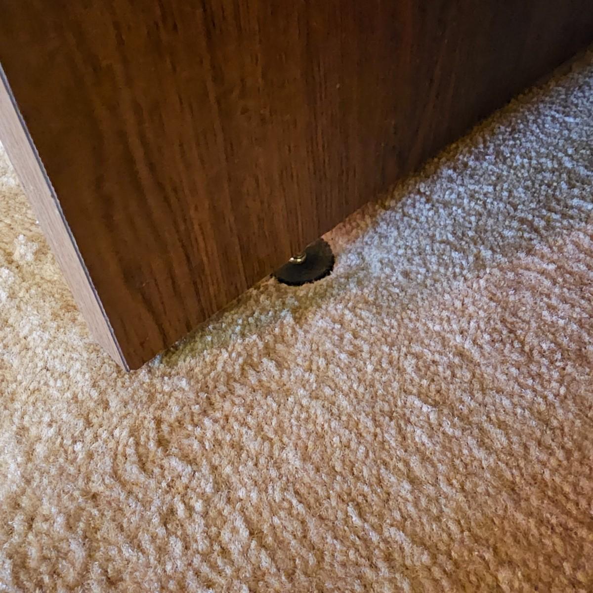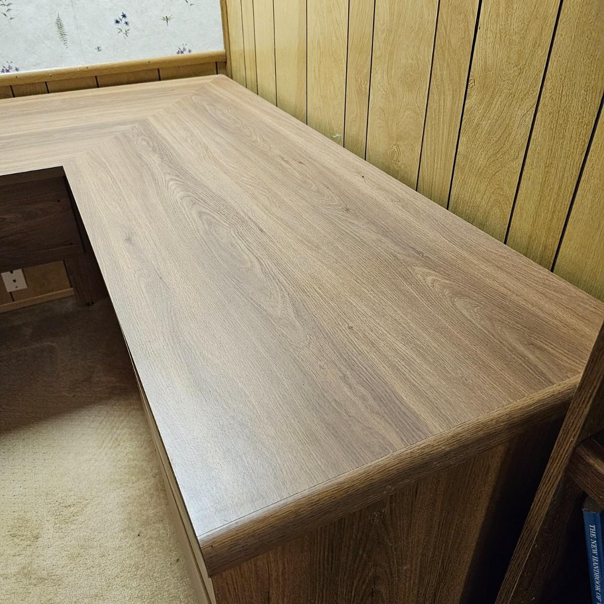 Basic corner desk with single file drawer, pull out keyboard tray and more. Vinyl over particle board, this desk is a medium brown color and measures 66" x 66" x 24” x 28"H. Right front trim strip is loose and there are a couple small scratches on the top, see photos for details. Buyer will need to bring tools to disassemble, specifically a Phillips head screwdriver. Local pickup only. Winning bidder must bring assistance to help move and load this item due to its weight and/or size.