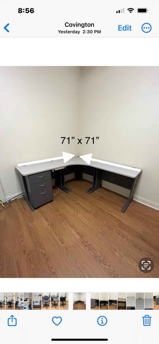 29.5” H ~ 71” x 71” W x 38” D ~ 4 pieces total ~ 3 piece sectional desk with 3-drawer filing cabinet
