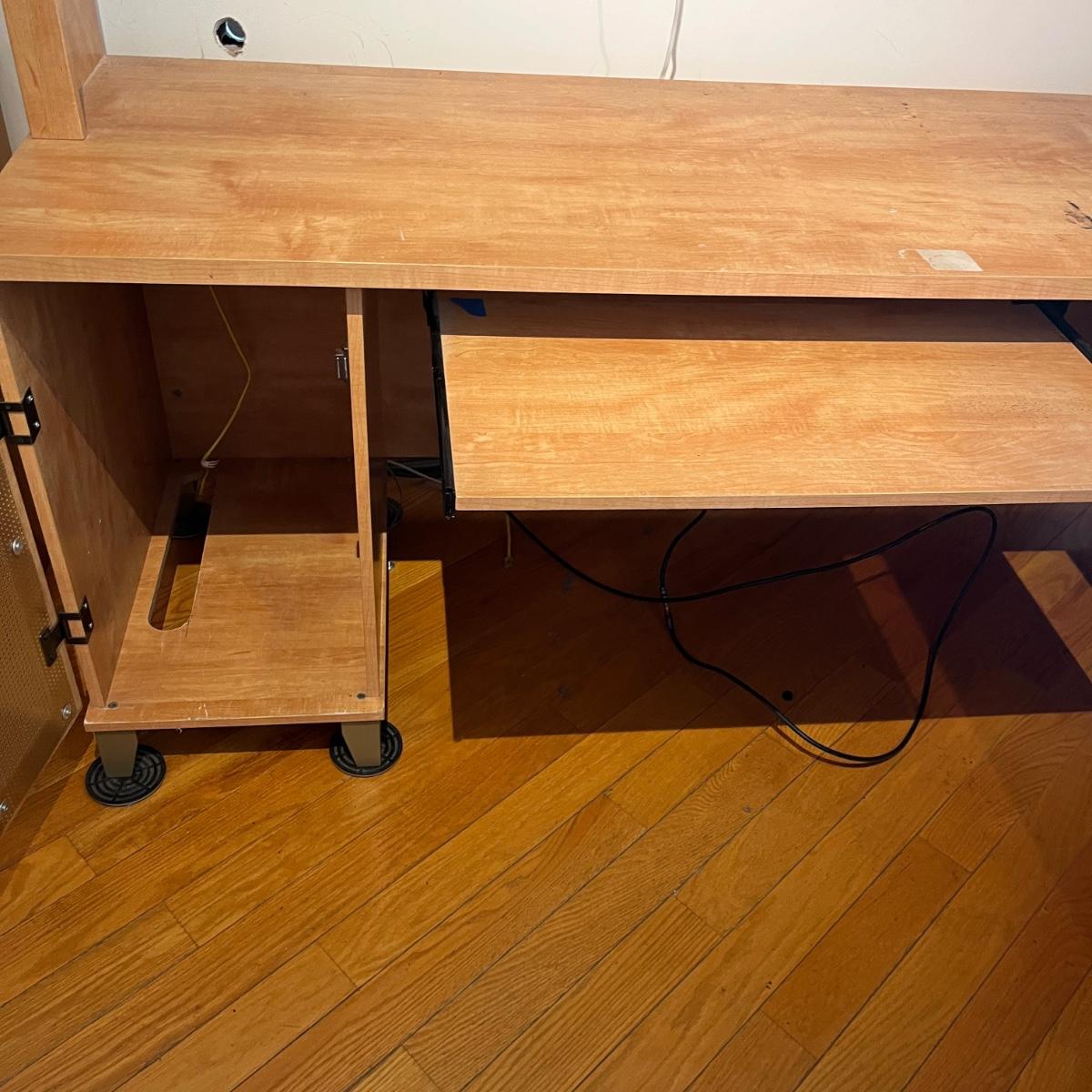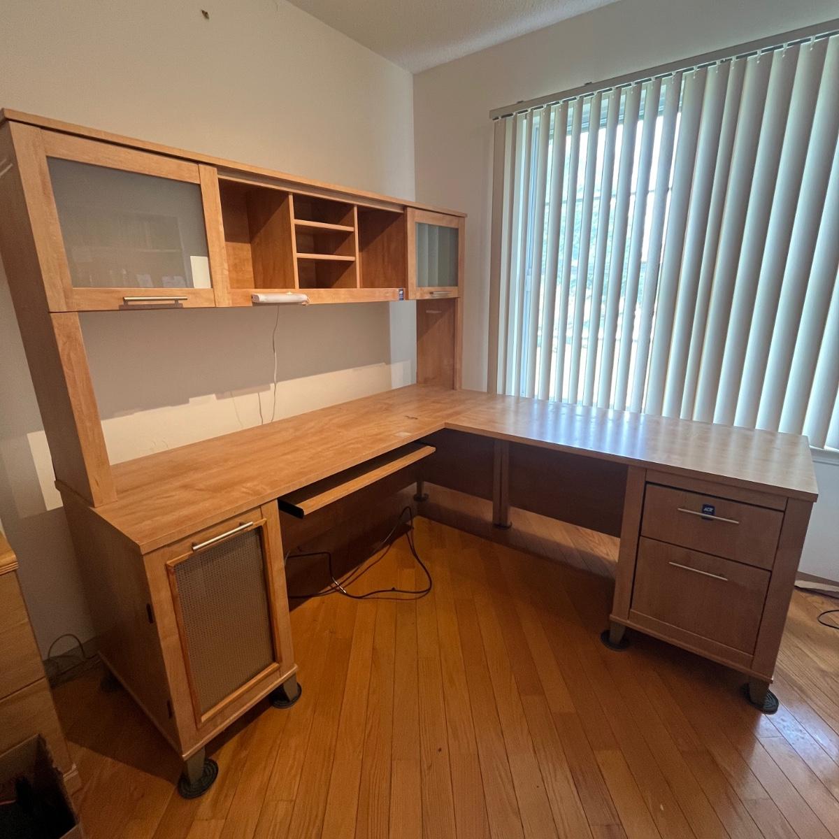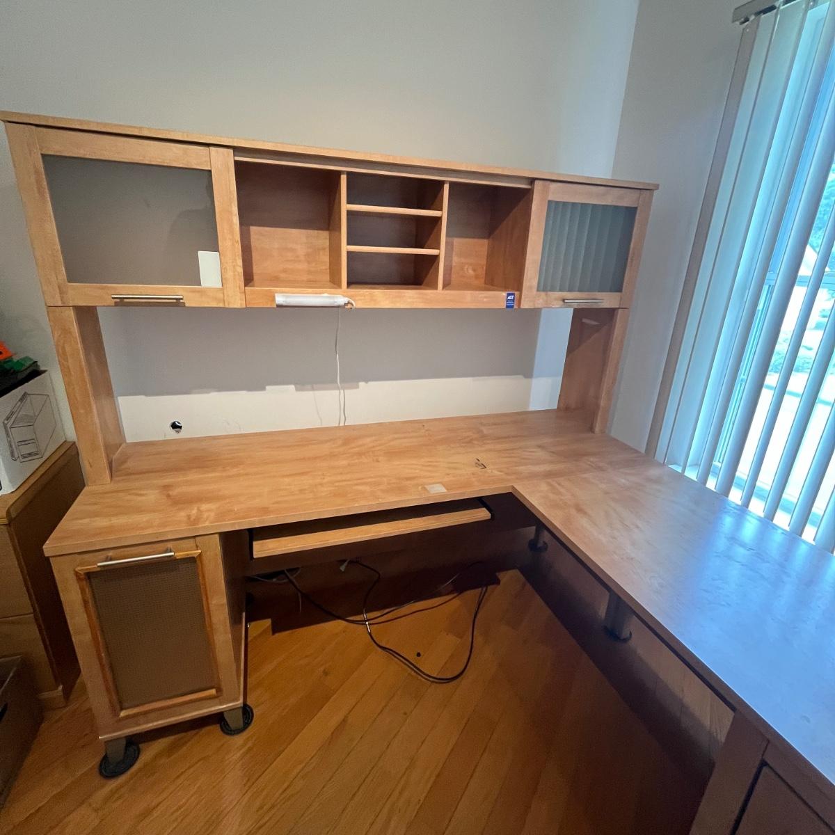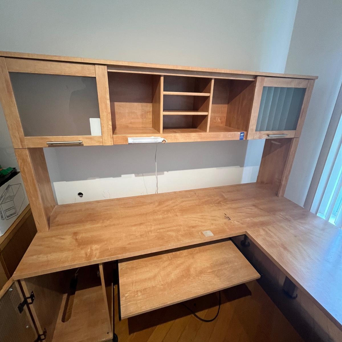 Lot includes a corner computer desk that has a keyboard drawer, CPU cabinet, file drawer, two frosted glass cabinets on hutch. Desk measures 71” x 24” x 65”H and the corner part measures 48” x 24” x 29”H. The desk is pressed wood and has some scratches and residue on top and will need to be taken apart by winning bidder.