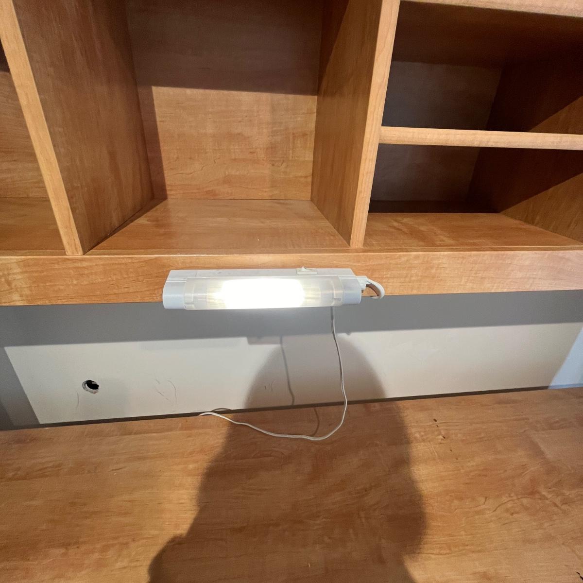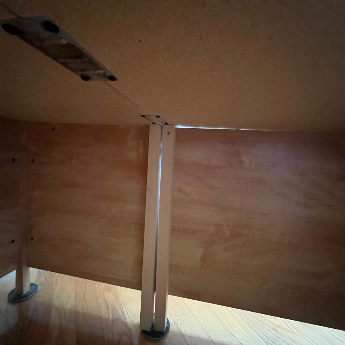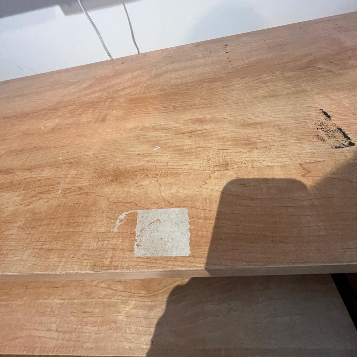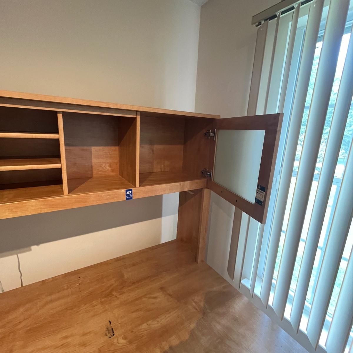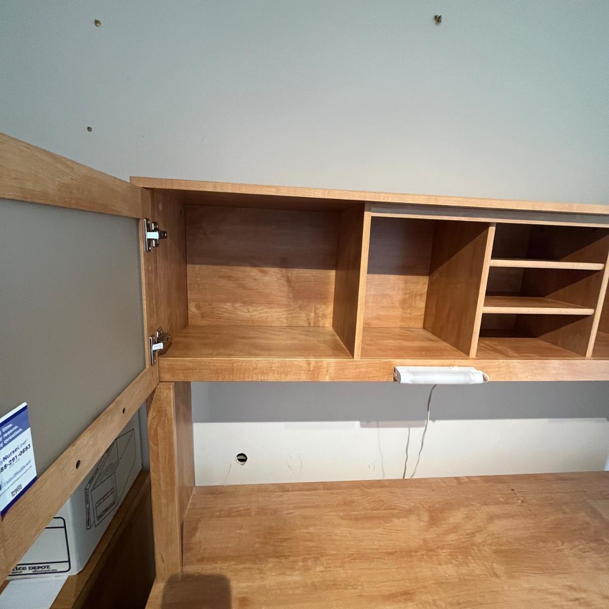 Lot includes a corner computer desk that has a keyboard drawer, CPU cabinet, file drawer, two frosted glass cabinets on hutch. Desk measures 71” x 24” x 65”H and the corner part measures 48” x 24” x 29”H. The desk is pressed wood and has some scratches and residue on top and will need to be taken apart by winning bidder.
