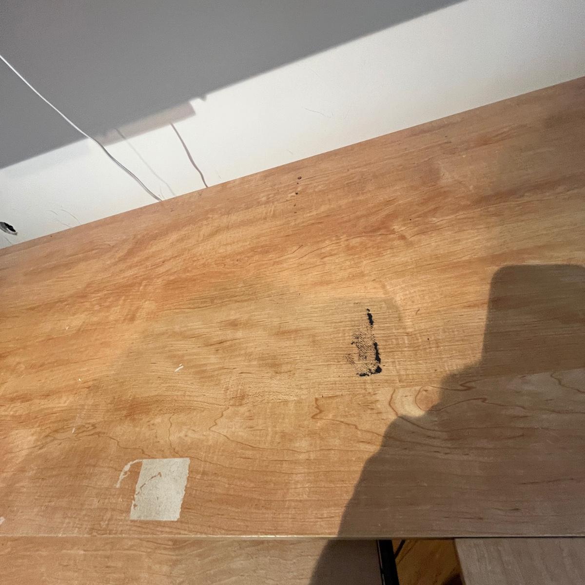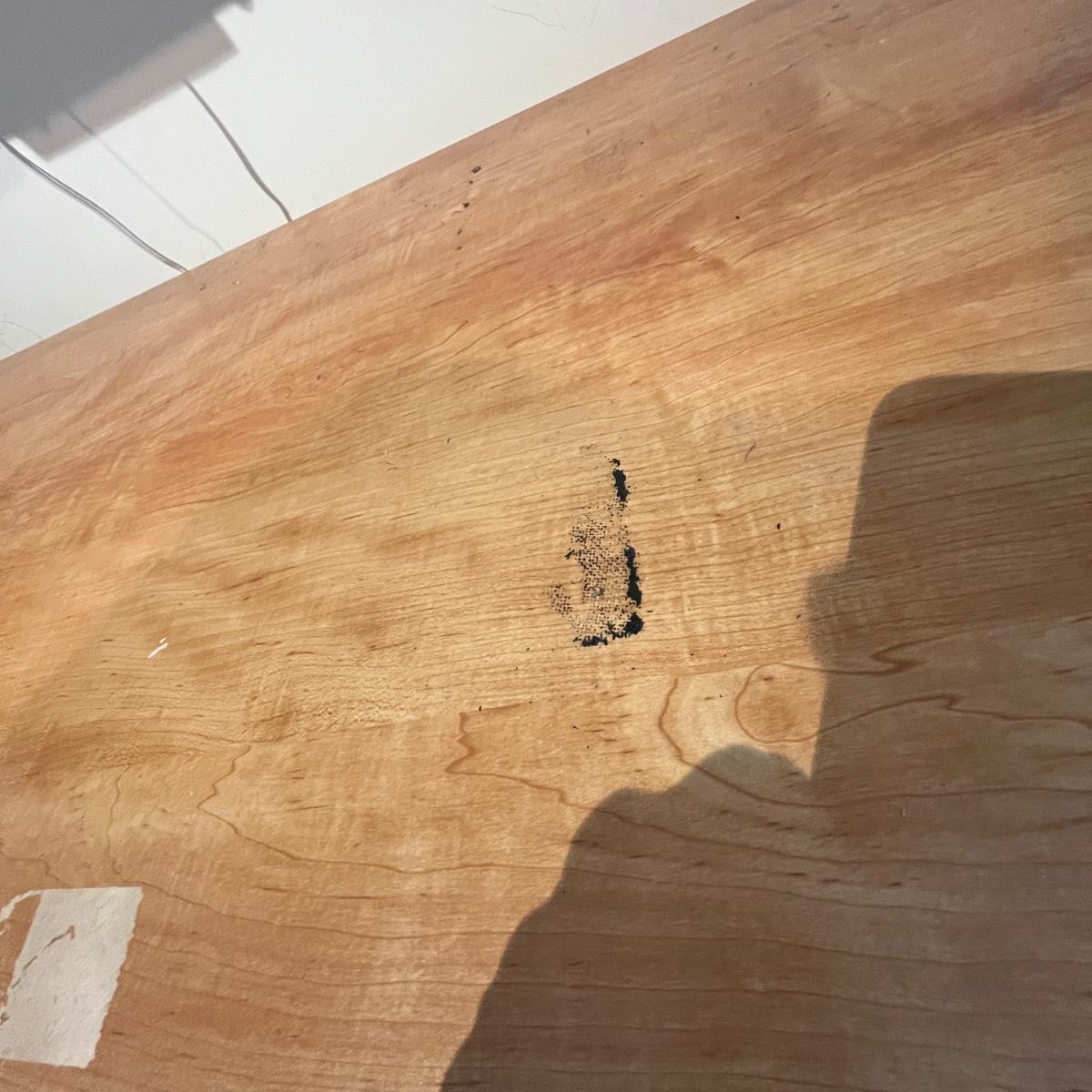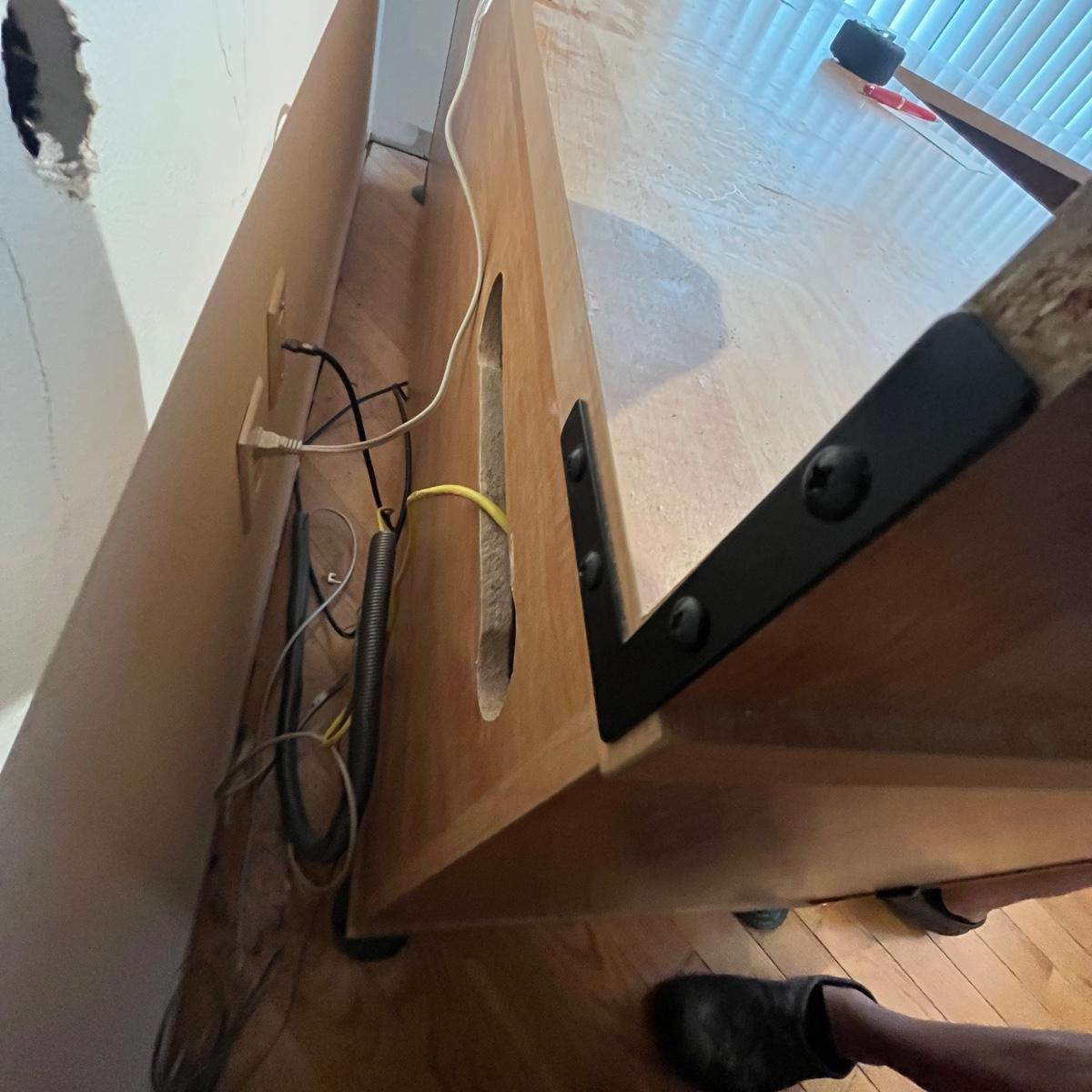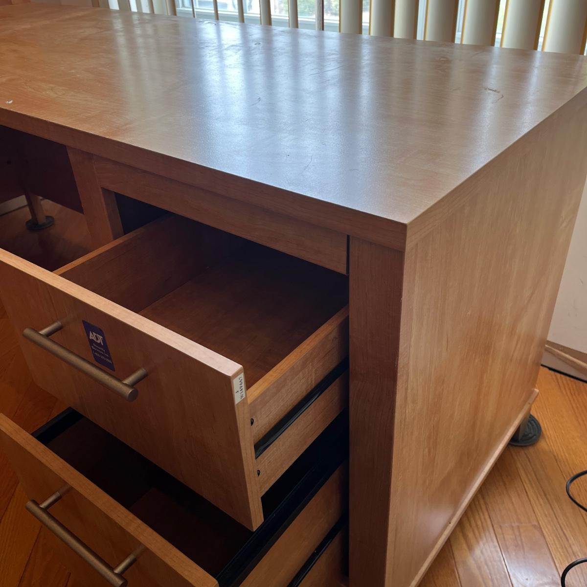 Lot includes a corner computer desk that has a keyboard drawer, CPU cabinet, file drawer, two frosted glass cabinets on hutch. Desk measures 71” x 24” x 65”H and the corner part measures 48” x 24” x 29”H. The desk is pressed wood and has some scratches and residue on top and will need to be taken apart by winning bidder.