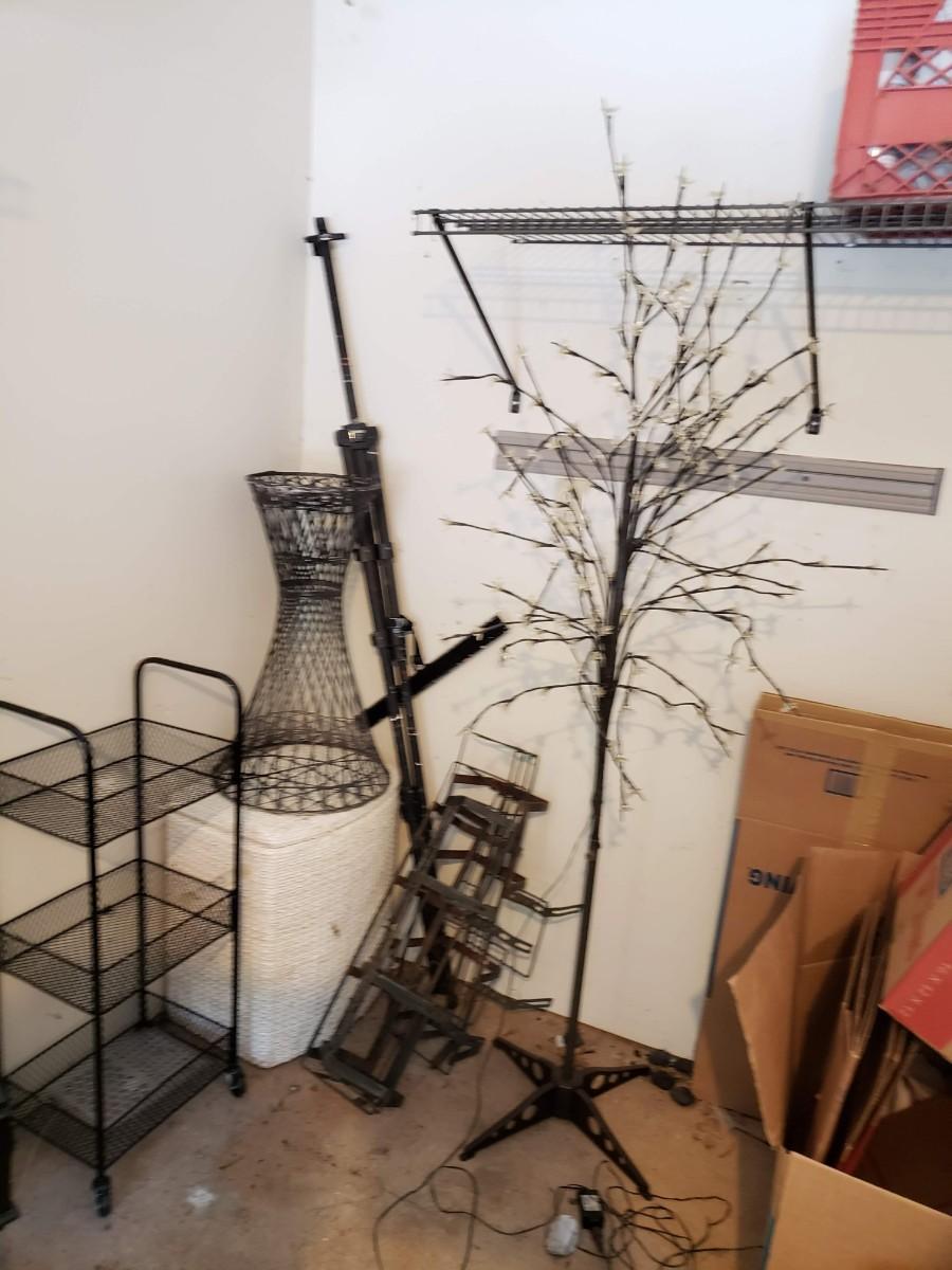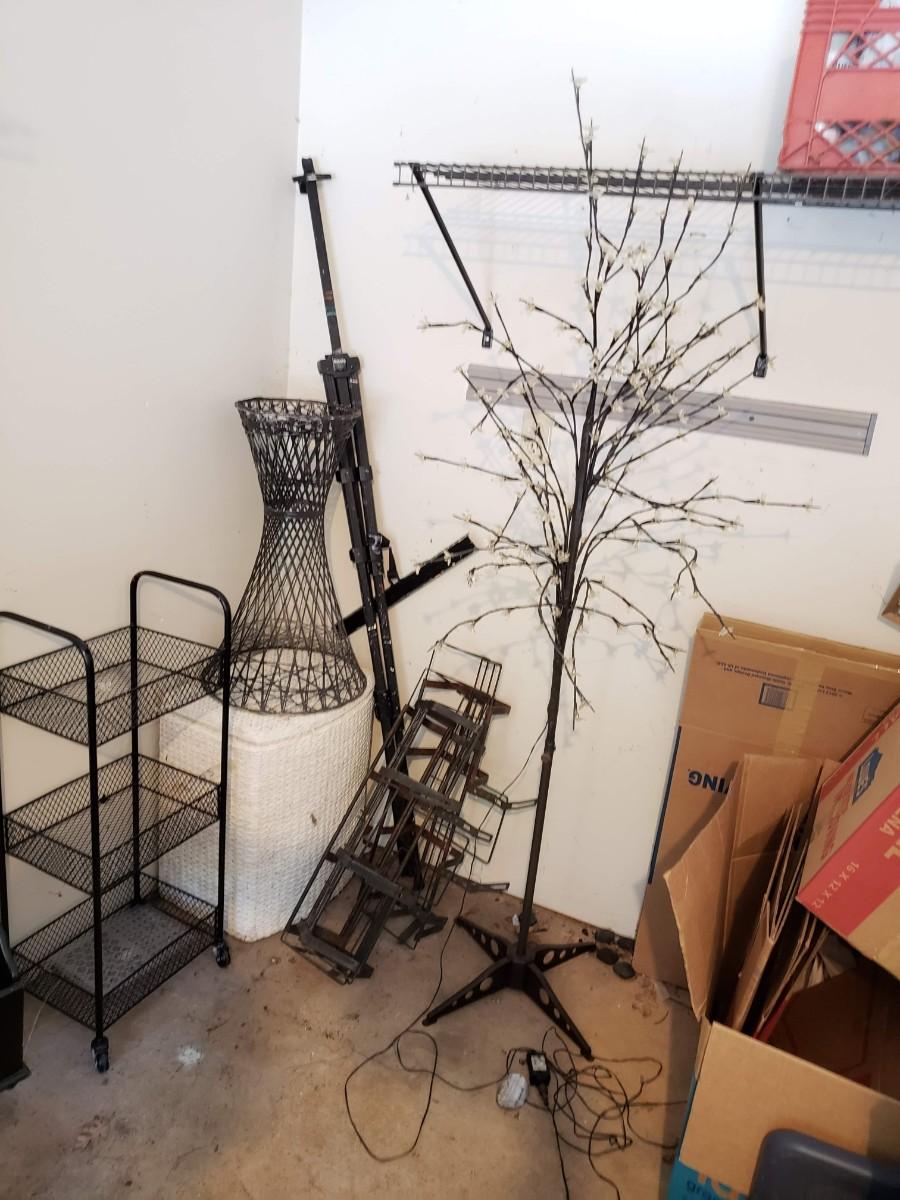 Artificial tree with flower lights, plant hangers, and rolling cart