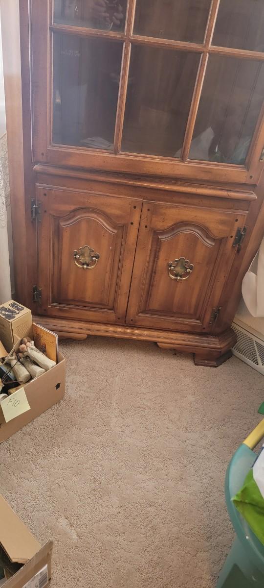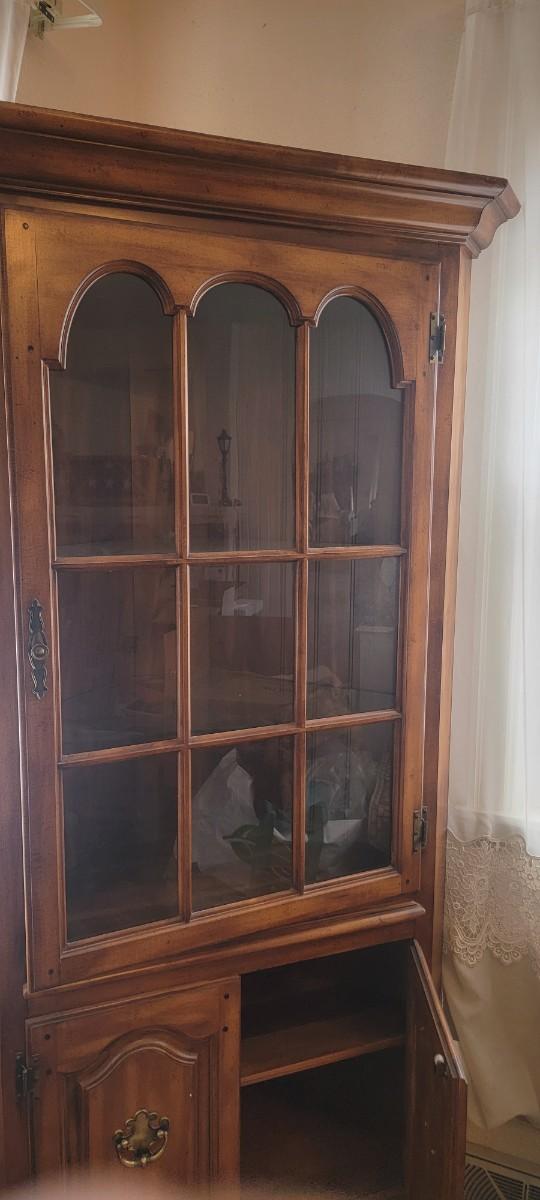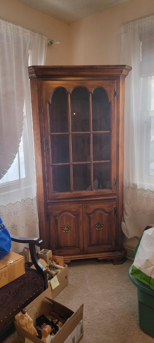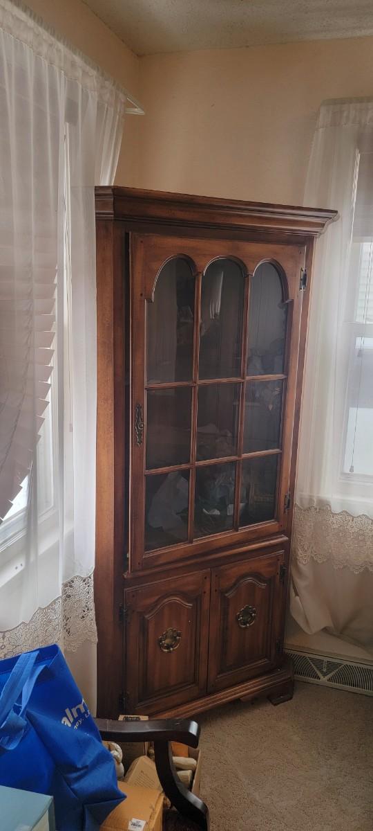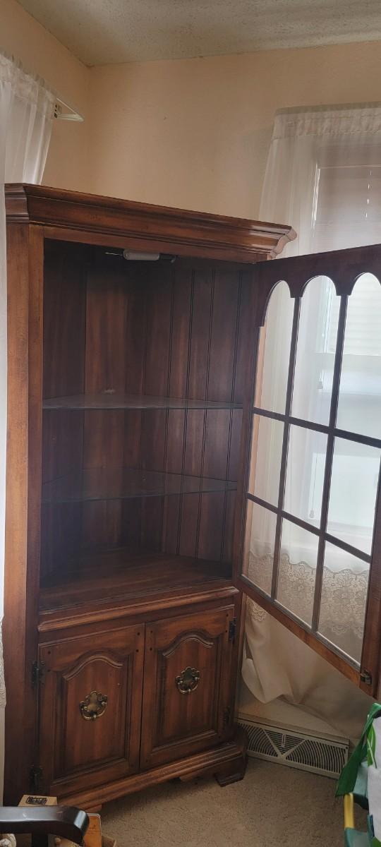 Corner curio, lighted, two glass shelves, doors. 34" W 74" H 22" D