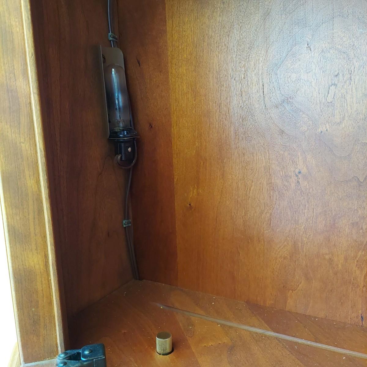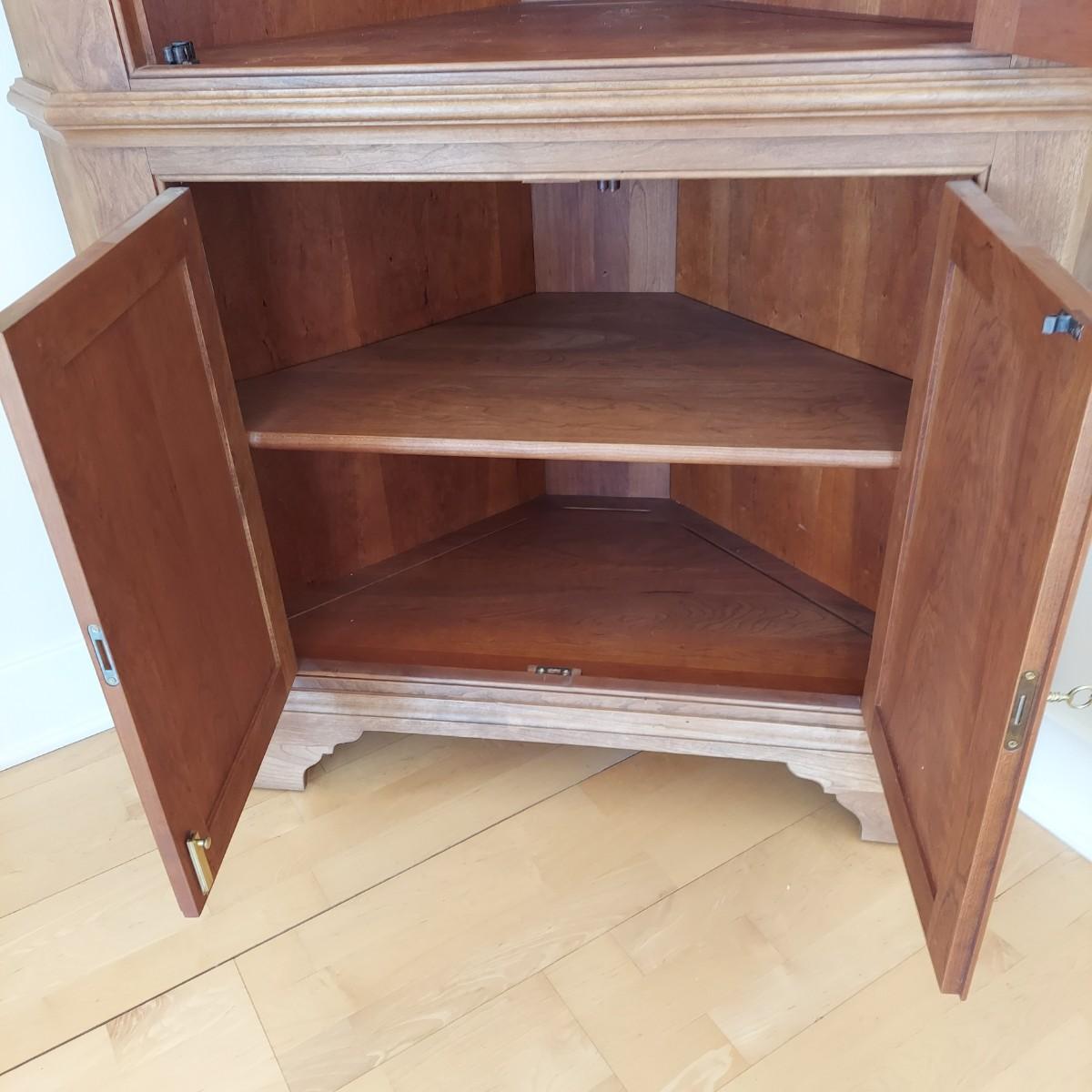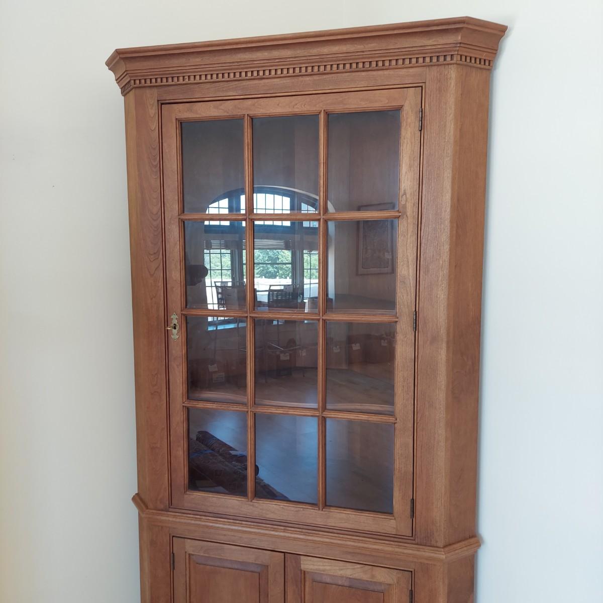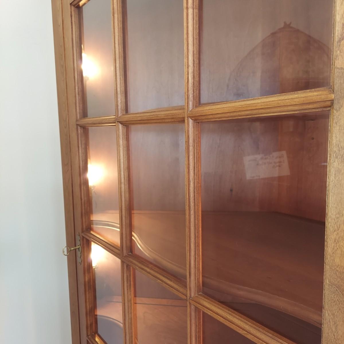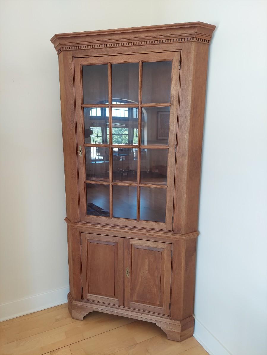 Solid wood corner cabinet with glass front door. Has two skeleton keys for the locks. Piece measures 42” x 20” x 83"H. The top portion is wired with lights. Please see photos for details.