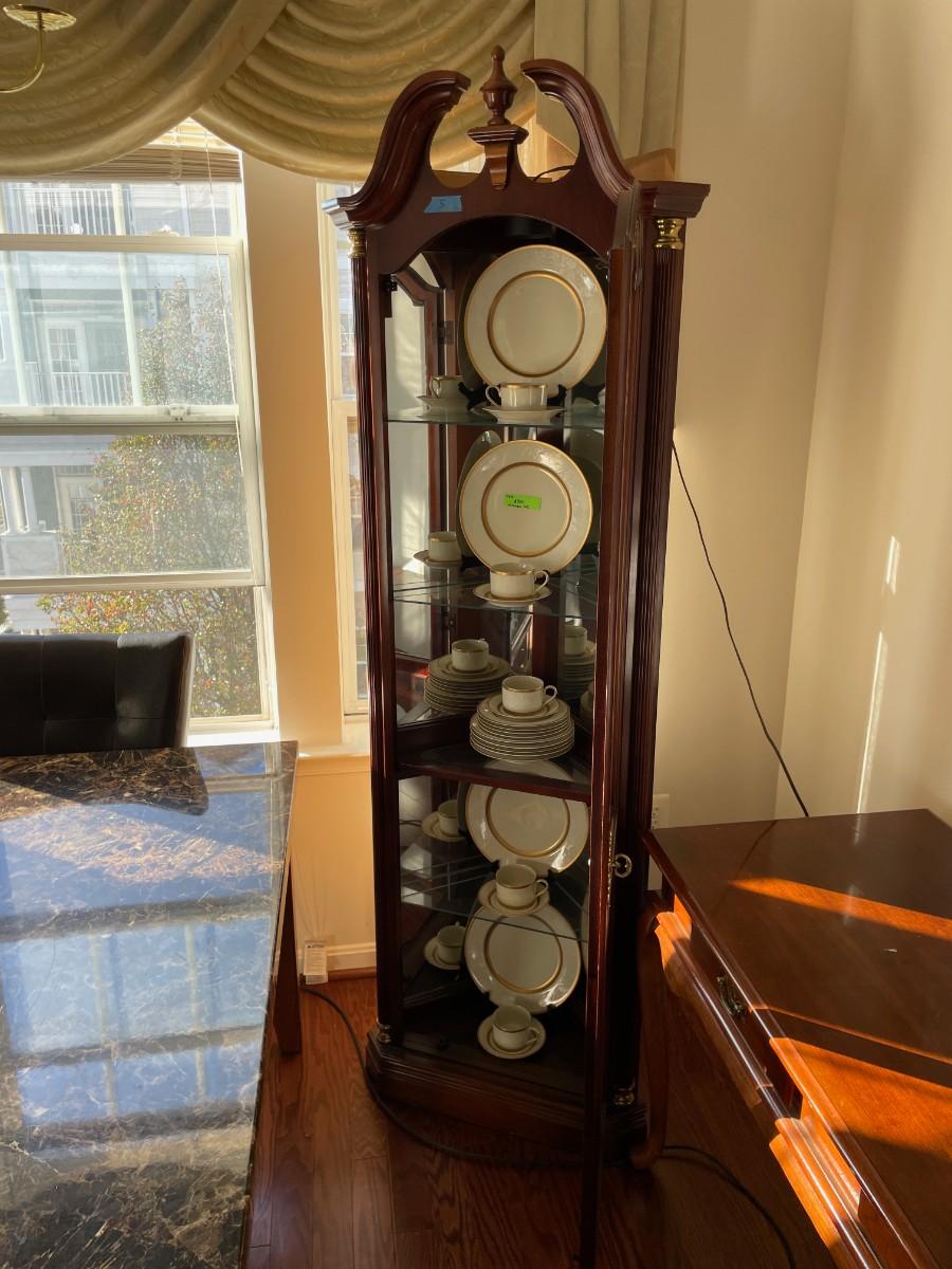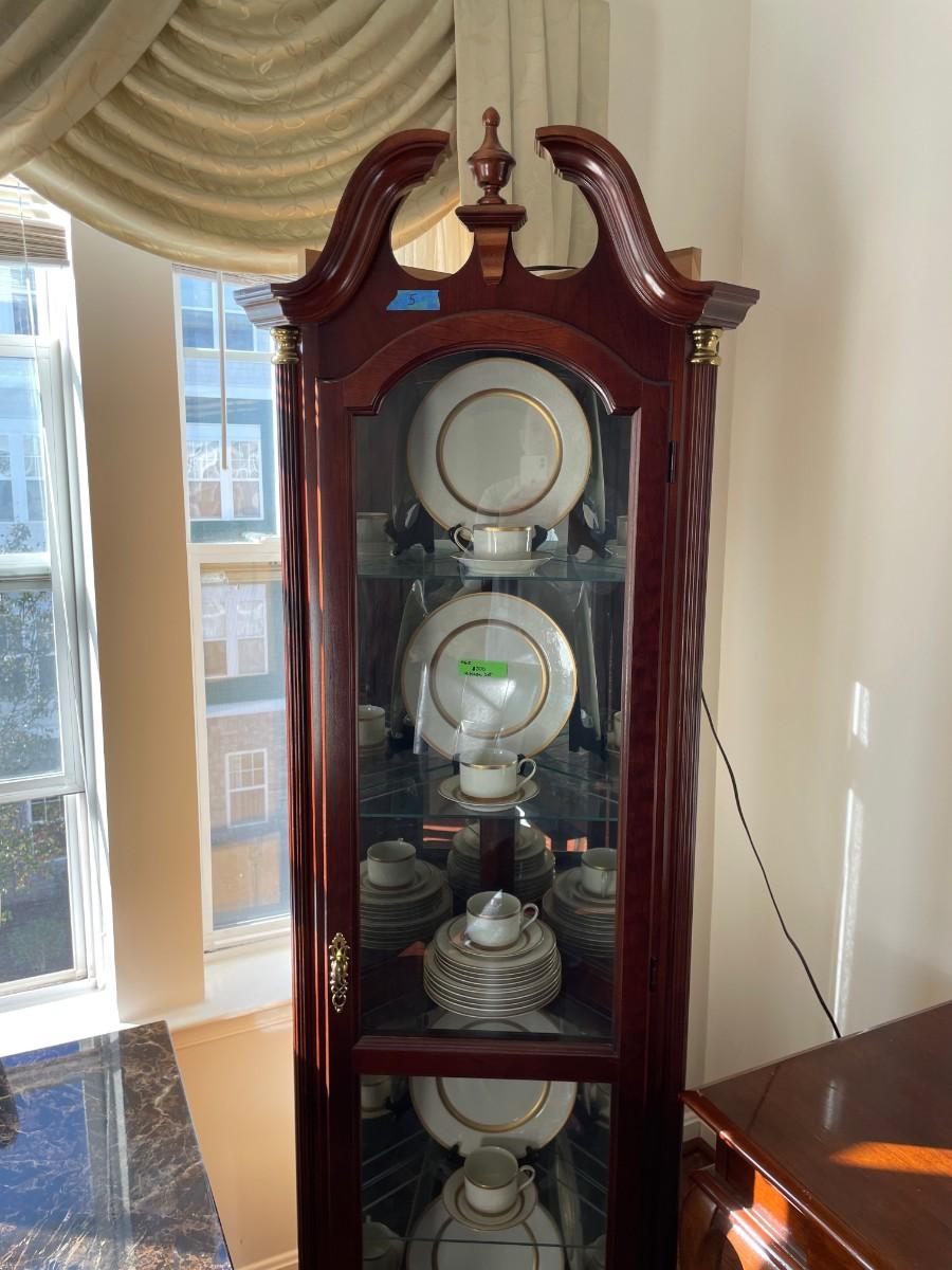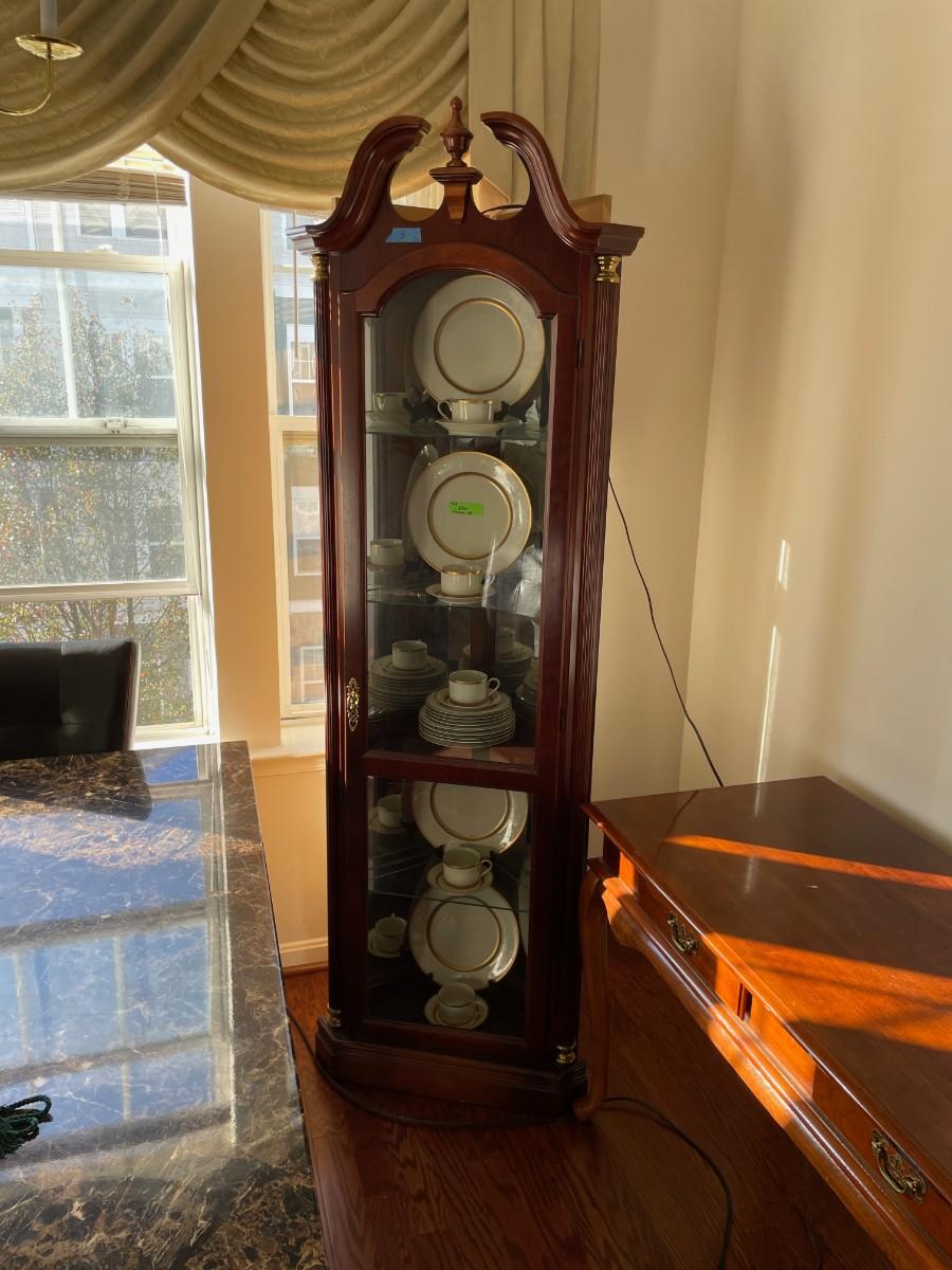 This beautiful cabinet has 4 glass shelves of which 3 are adjustable. It features a mirrored interior finish and illuminates beautifully with the light on or natural sunlight. Measures- 80"h x 23" W x 12" D