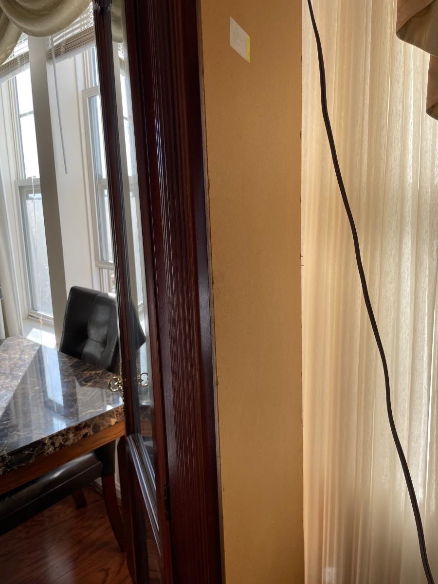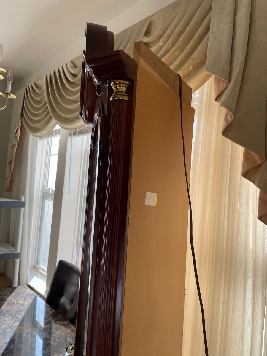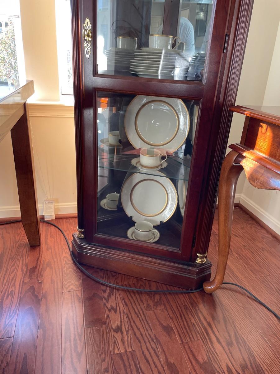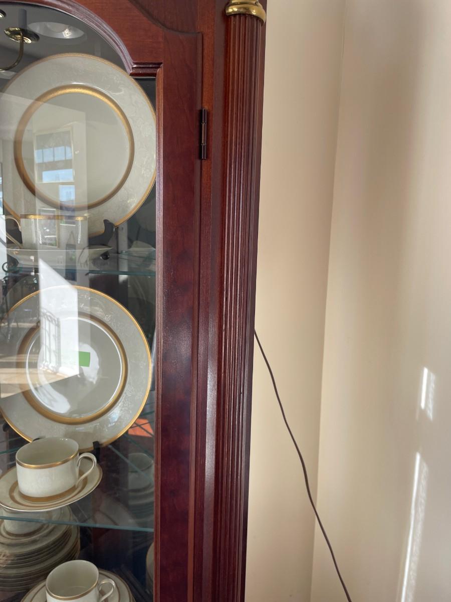 This beautiful cabinet has 4 glass shelves of which 3 are adjustable. It features a mirrored interior finish and illuminates beautifully with the light on or natural sunlight. Measures- 80"h x 23" W x 12" D