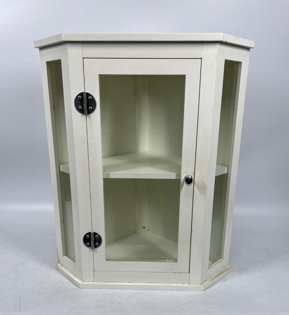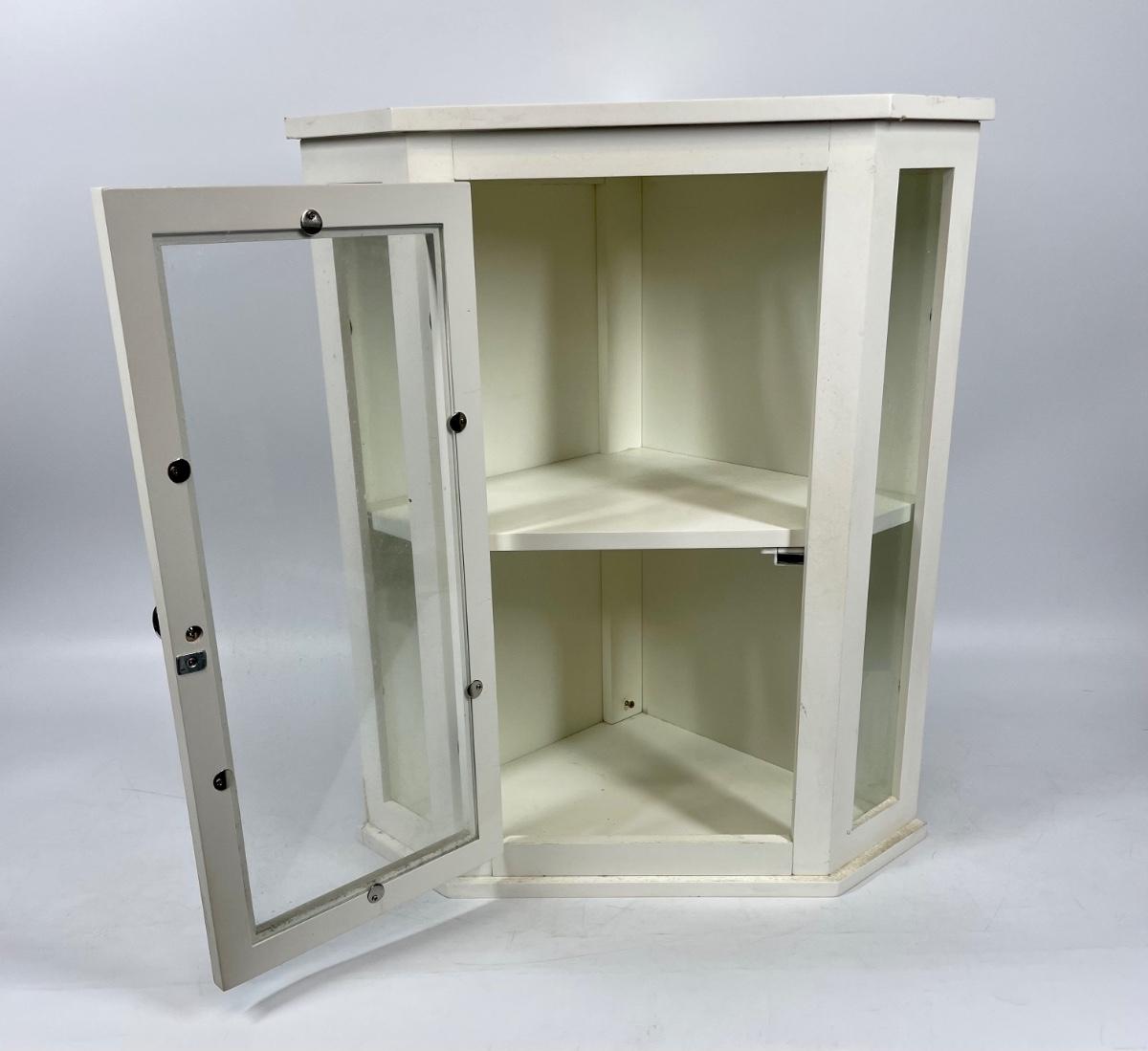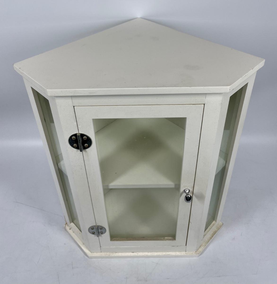White wood hanging wall cabinet, ideal for corners. Single door with glass panel in front.