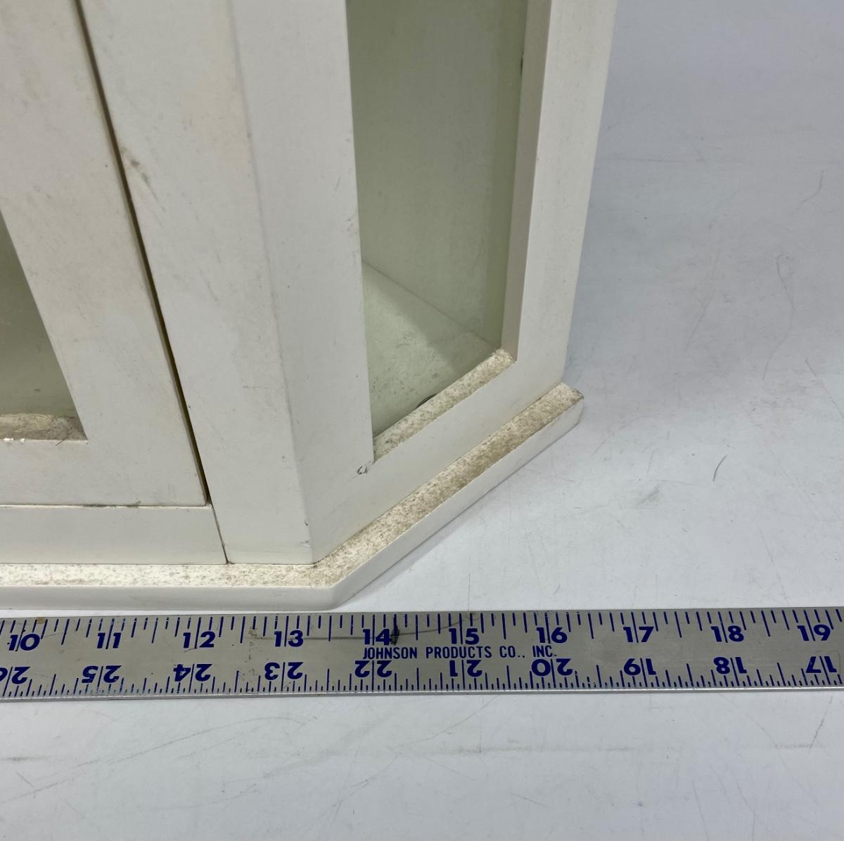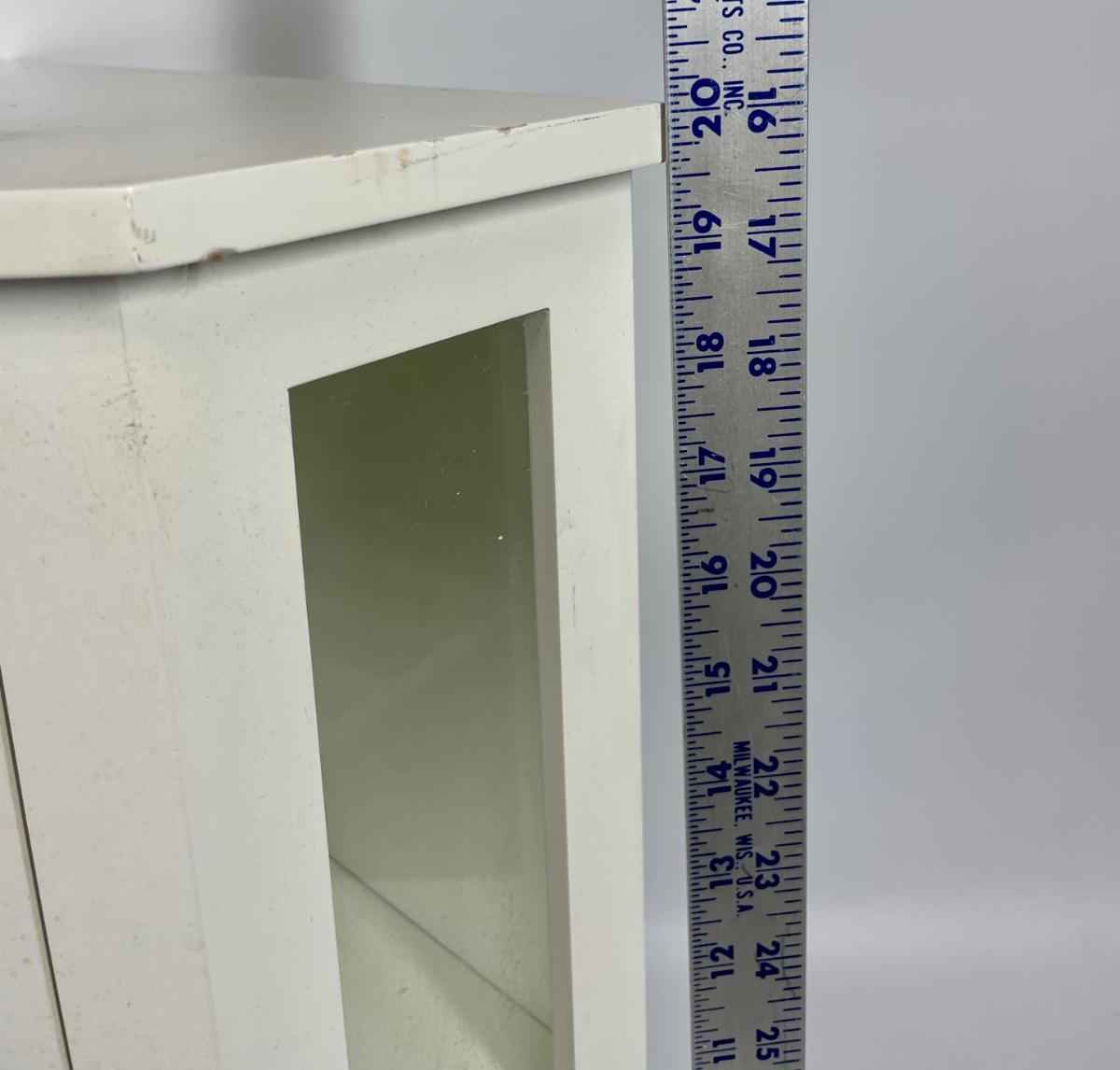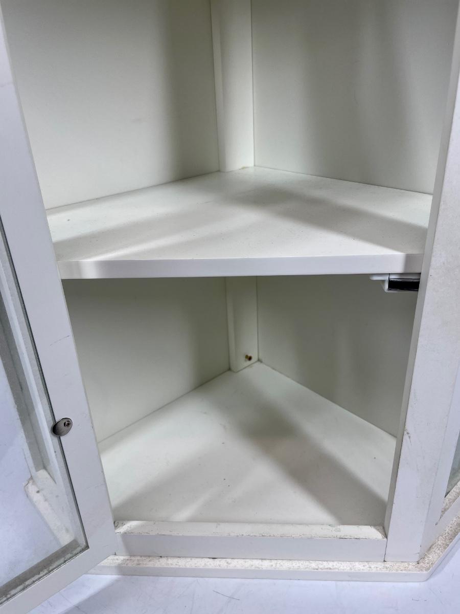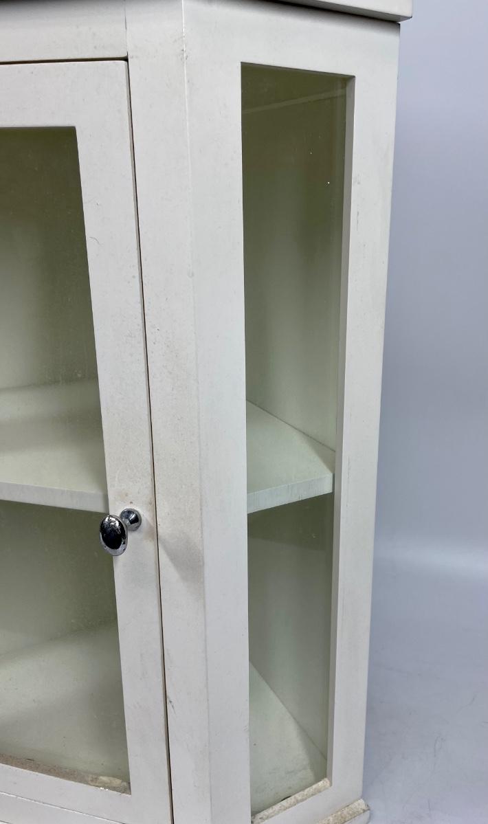 White wood hanging wall cabinet, ideal for corners. Single door with glass panel in front.