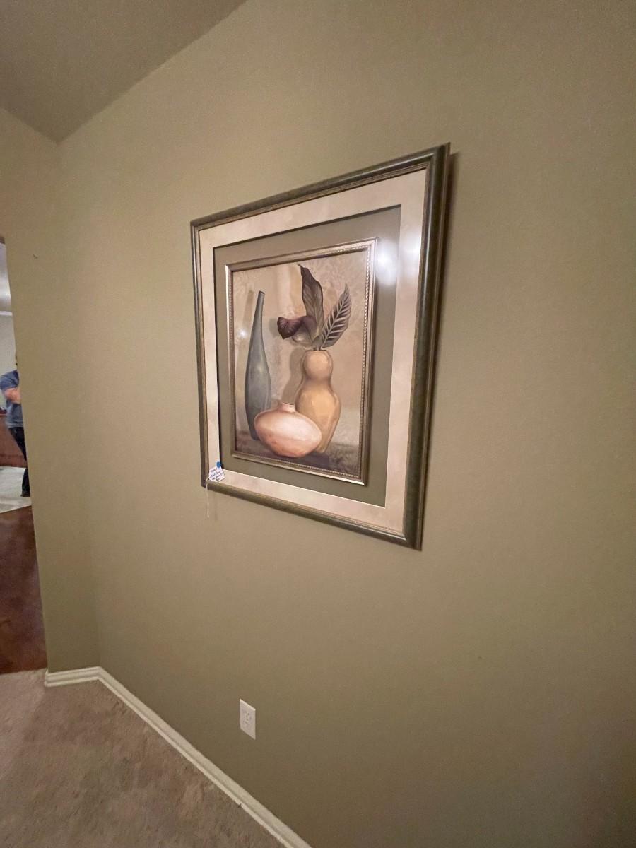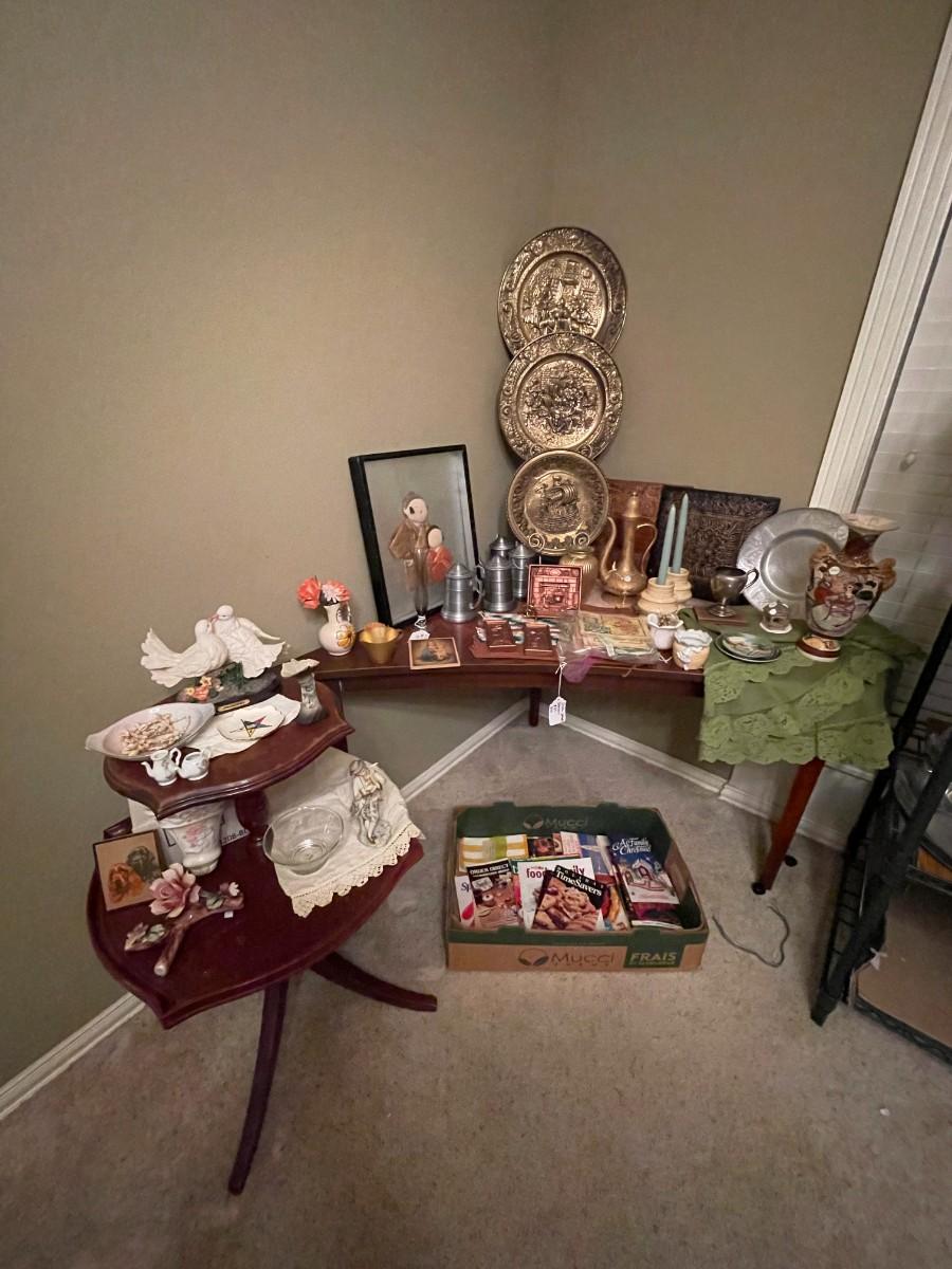 This lot includes a corner table and a two-tiered table, as well as the figurines and the decor, the candlesticks, and the copper plates. Includes artwork on wall.