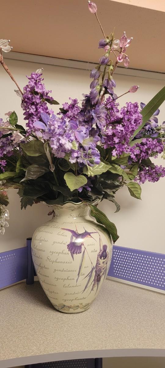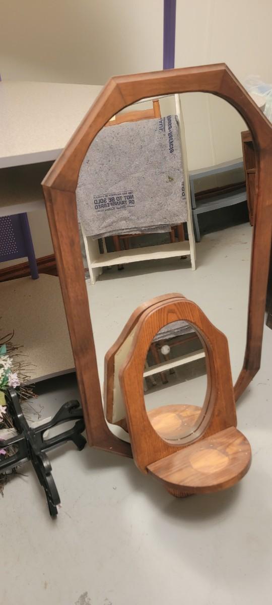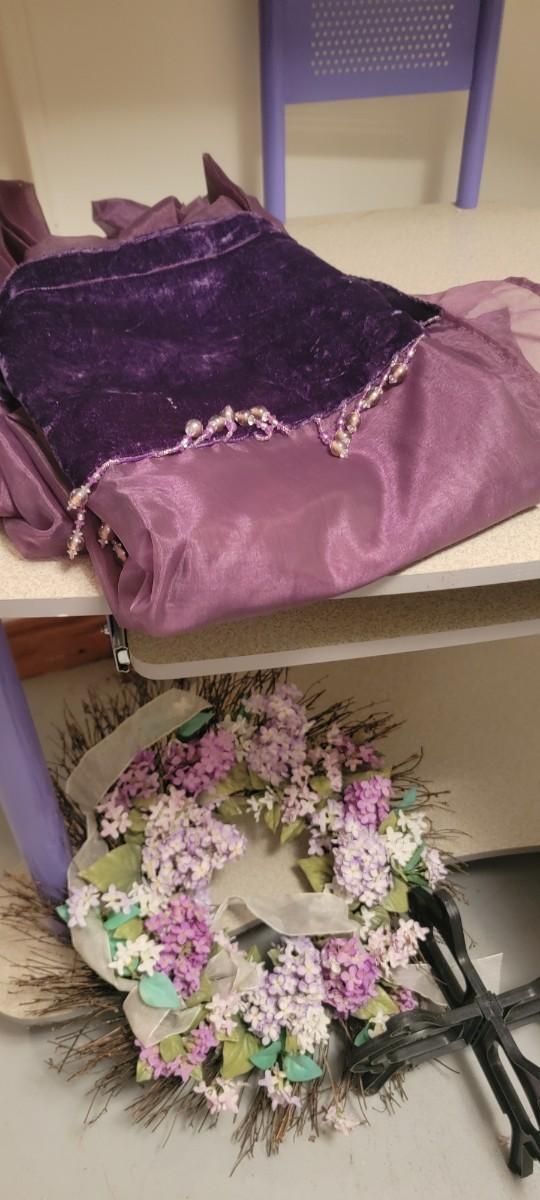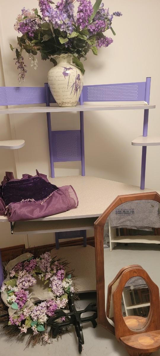 Cute corner desk, purple trim. 45" W 27" D 53" H Lot includes floral, mirrors