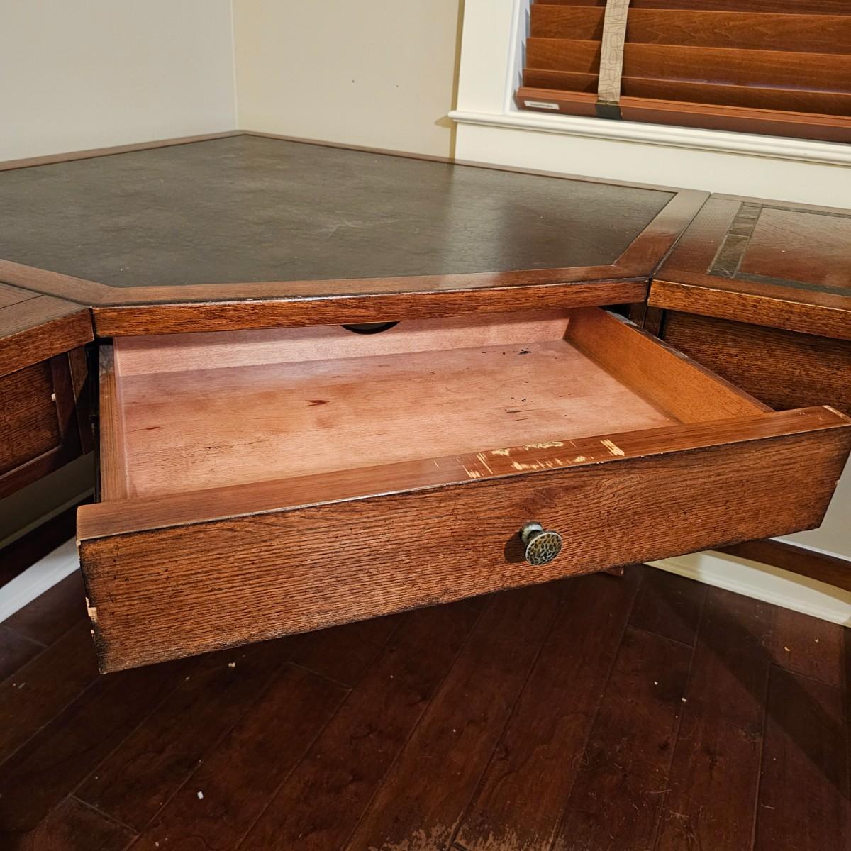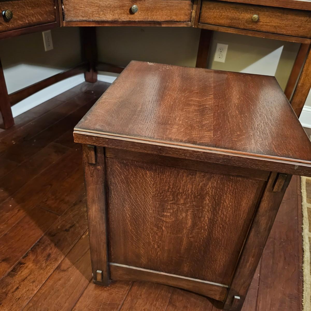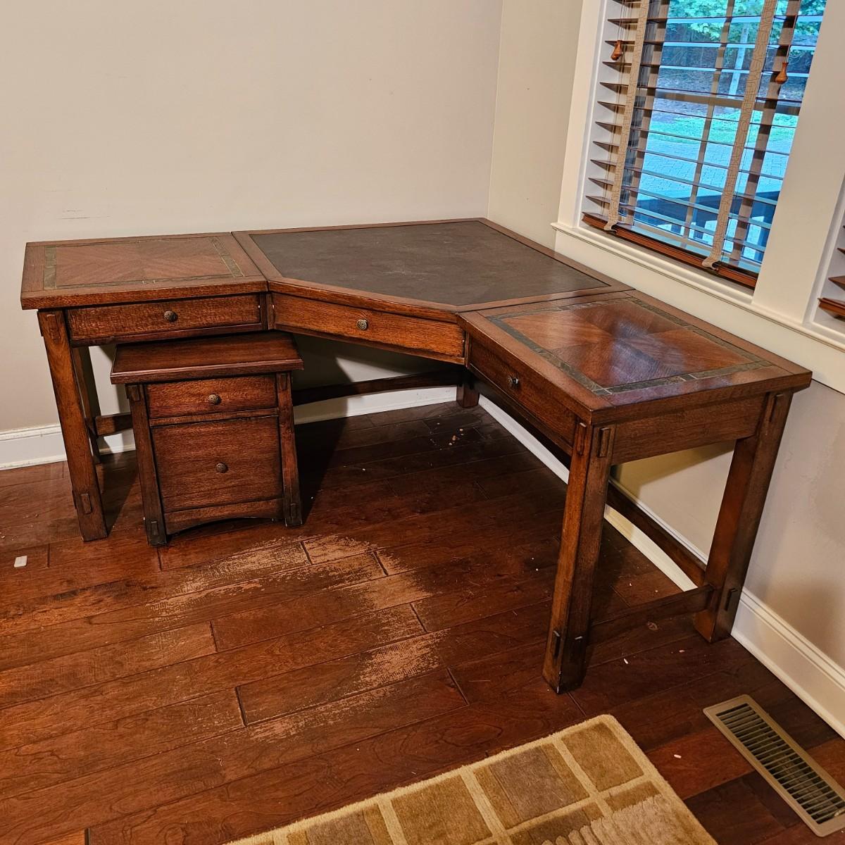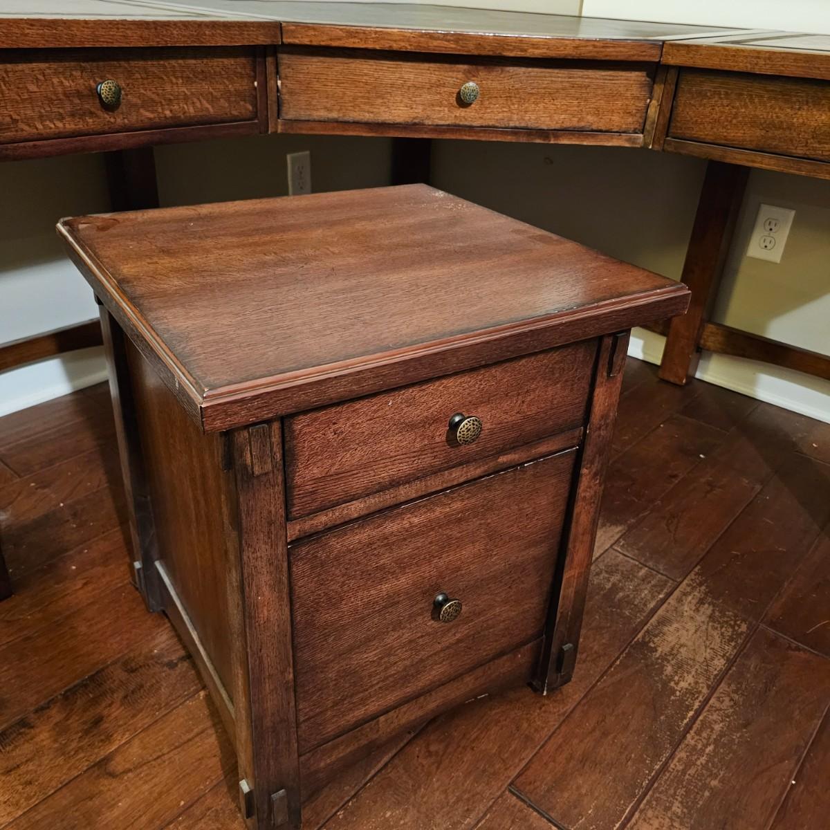 Nice dark wood corner desk with an under table file cabinet. Three drawers, dovetail corners. File unit has rolling wheels. Desk measures 62" x 62" x 30.5" H, file is 19.5" x 18.5" x 23"H. Middle drawer in desk drops down for keyboard access. Some small blemishes on drawer fronts and tops. Desk breaks down into three pieces with removal of four allen head bolts on each side. See photos for details. Local pickup only, winning bidder will need to bring tools to dismantle.