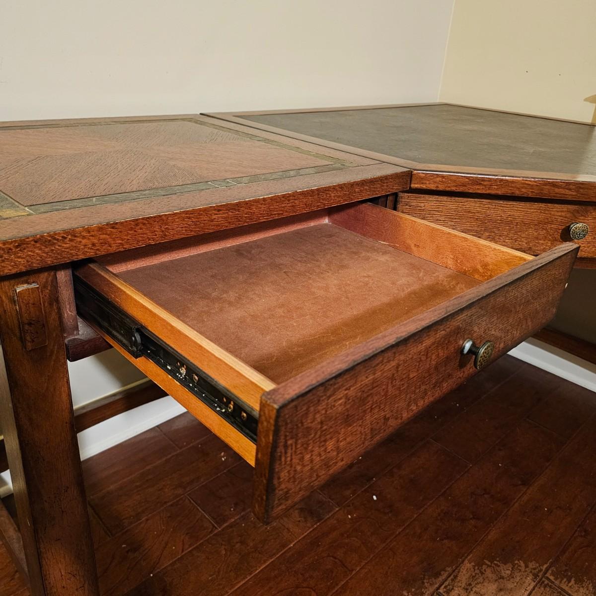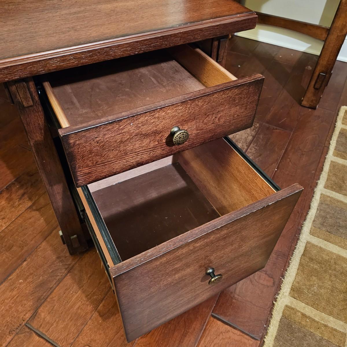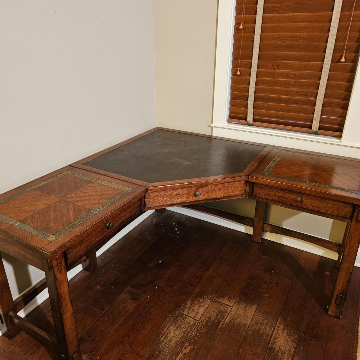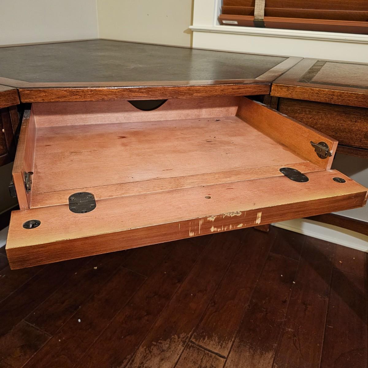 Nice dark wood corner desk with an under table file cabinet. Three drawers, dovetail corners. File unit has rolling wheels. Desk measures 62" x 62" x 30.5" H, file is 19.5" x 18.5" x 23"H. Middle drawer in desk drops down for keyboard access. Some small blemishes on drawer fronts and tops. Desk breaks down into three pieces with removal of four allen head bolts on each side. See photos for details. Local pickup only, winning bidder will need to bring tools to dismantle.