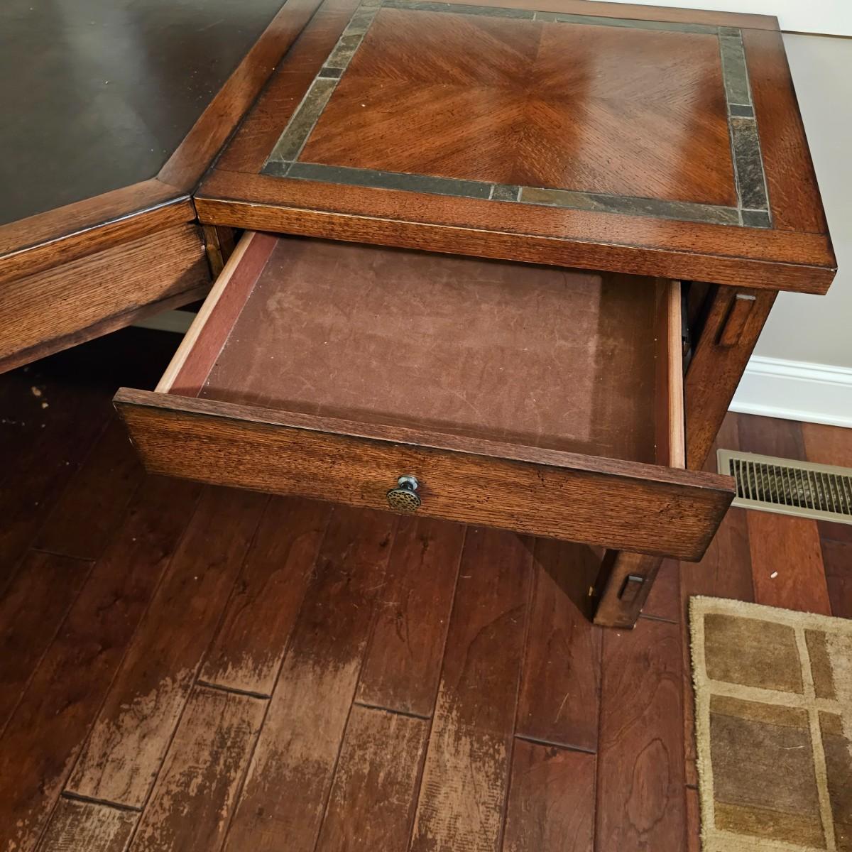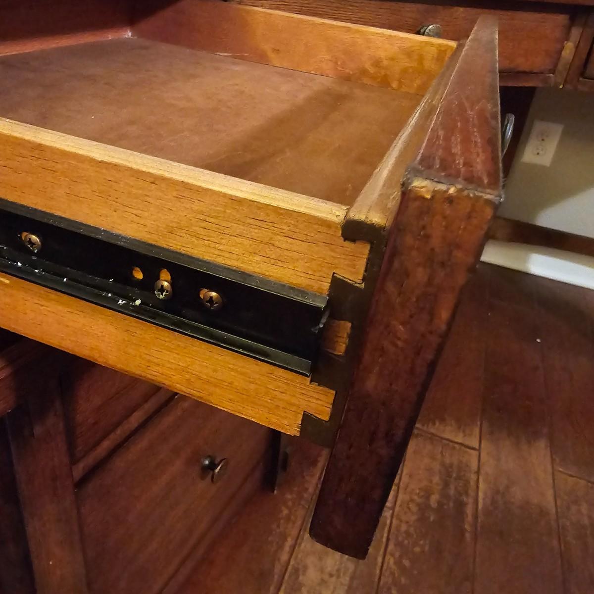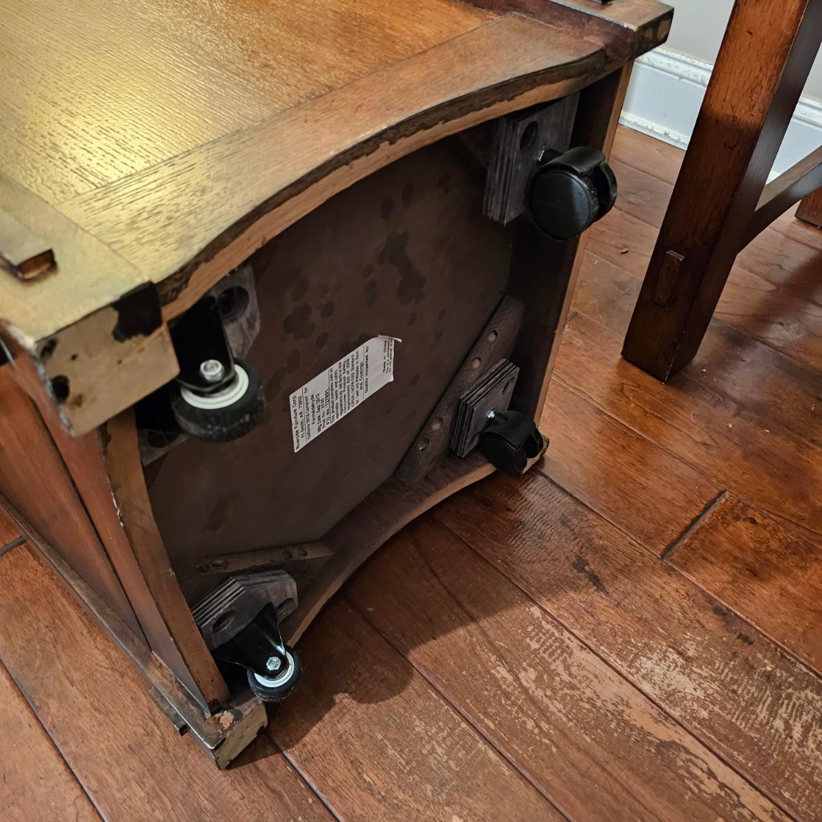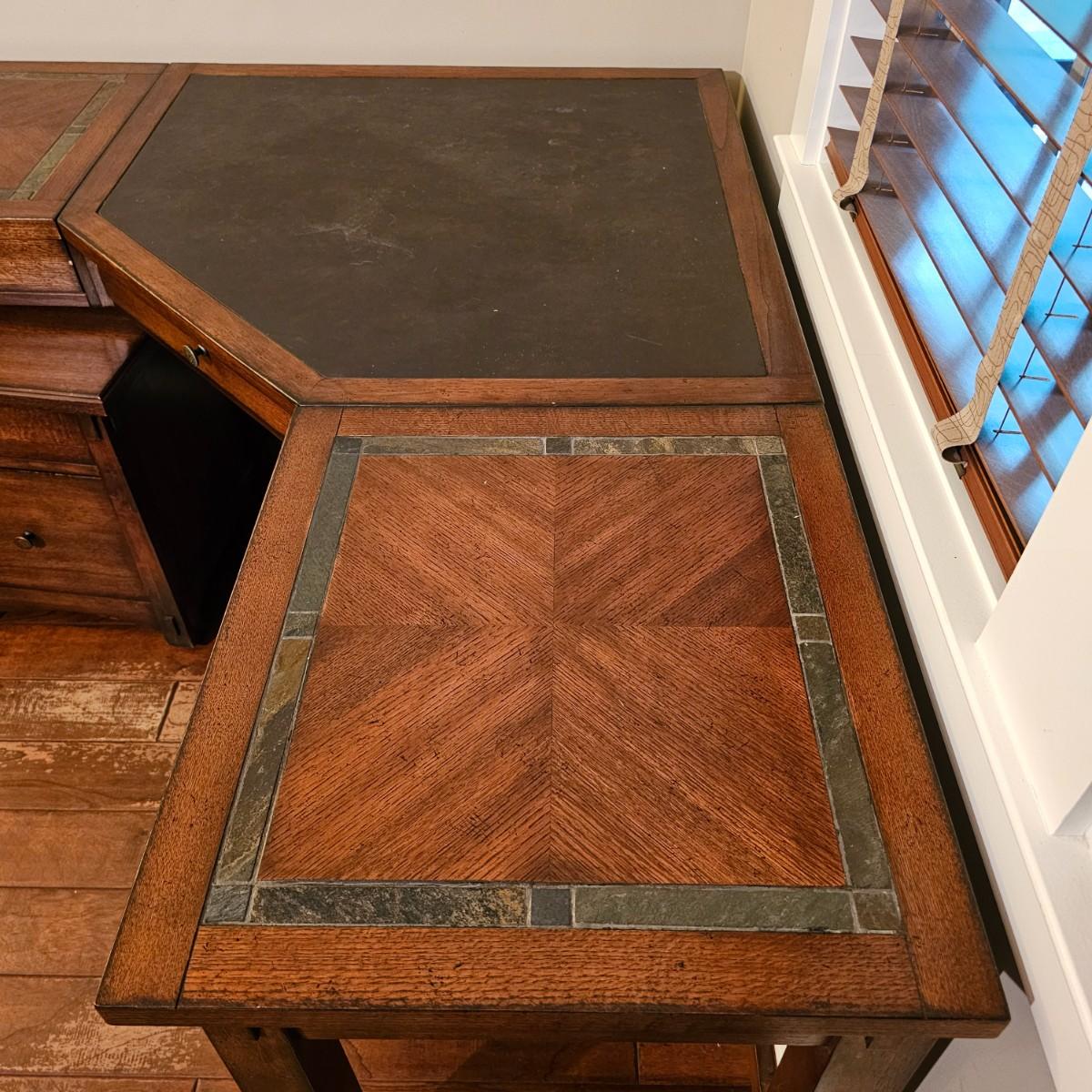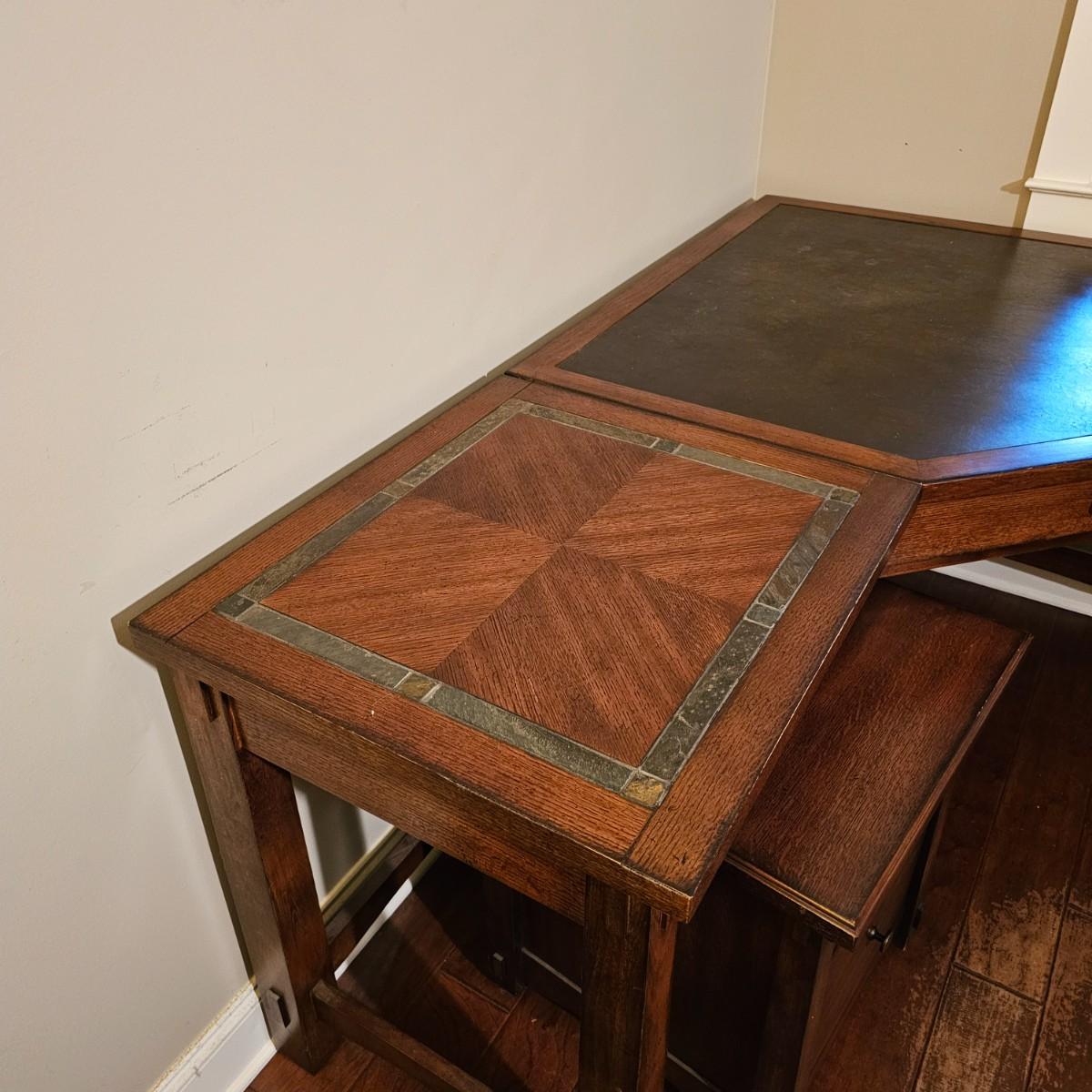 Nice dark wood corner desk with an under table file cabinet. Three drawers, dovetail corners. File unit has rolling wheels. Desk measures 62" x 62" x 30.5" H, file is 19.5" x 18.5" x 23"H. Middle drawer in desk drops down for keyboard access. Some small blemishes on drawer fronts and tops. Desk breaks down into three pieces with removal of four allen head bolts on each side. See photos for details. Local pickup only, winning bidder will need to bring tools to dismantle.