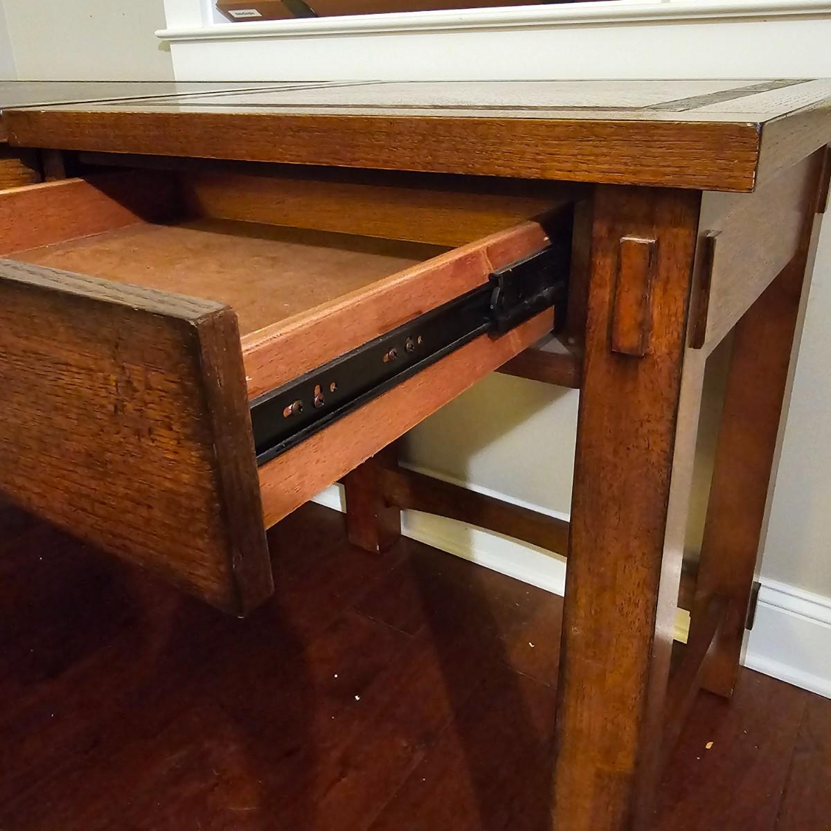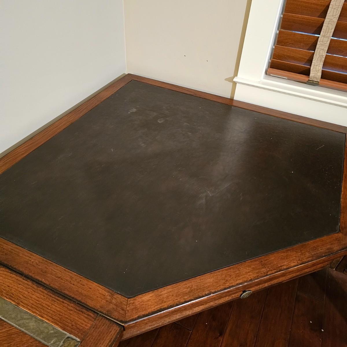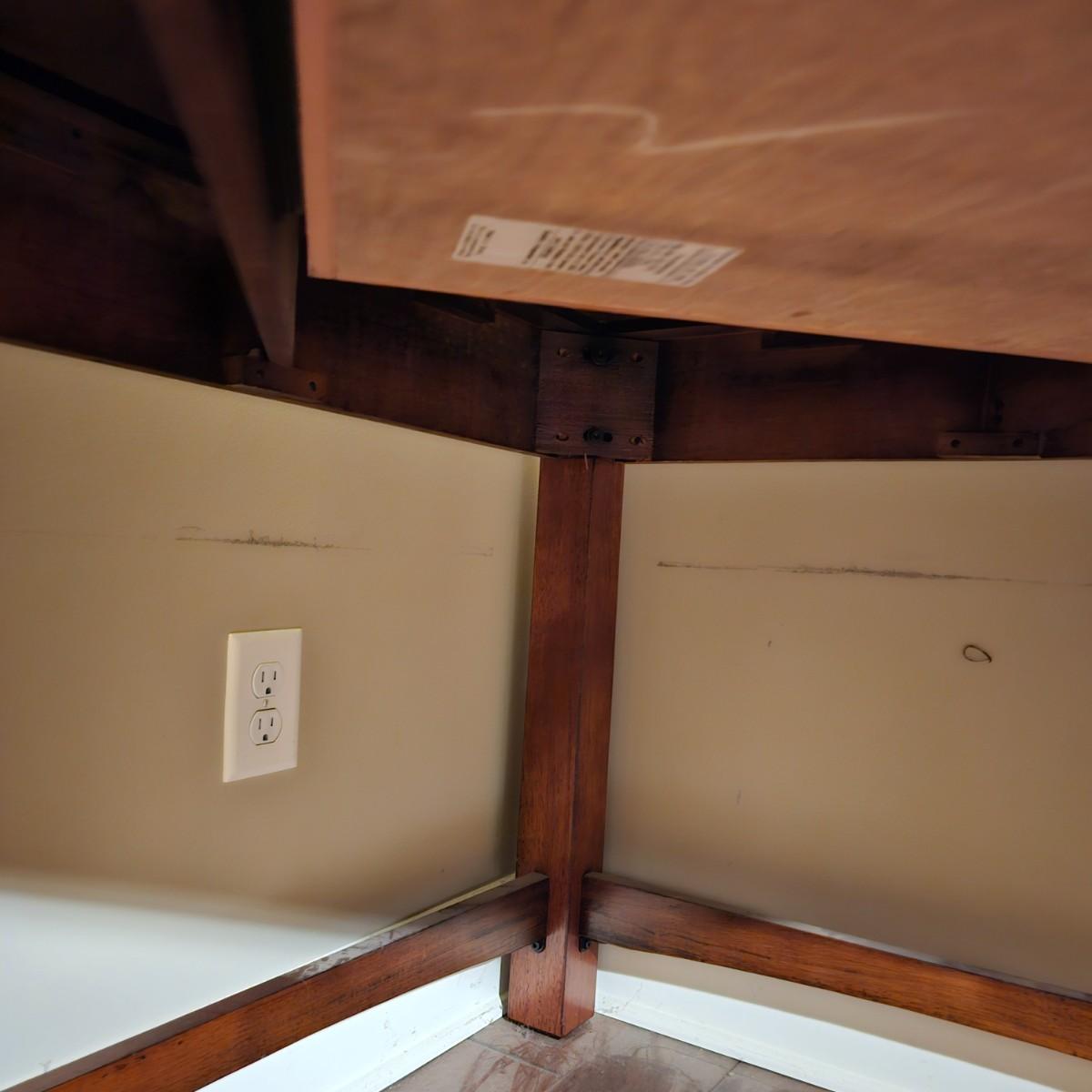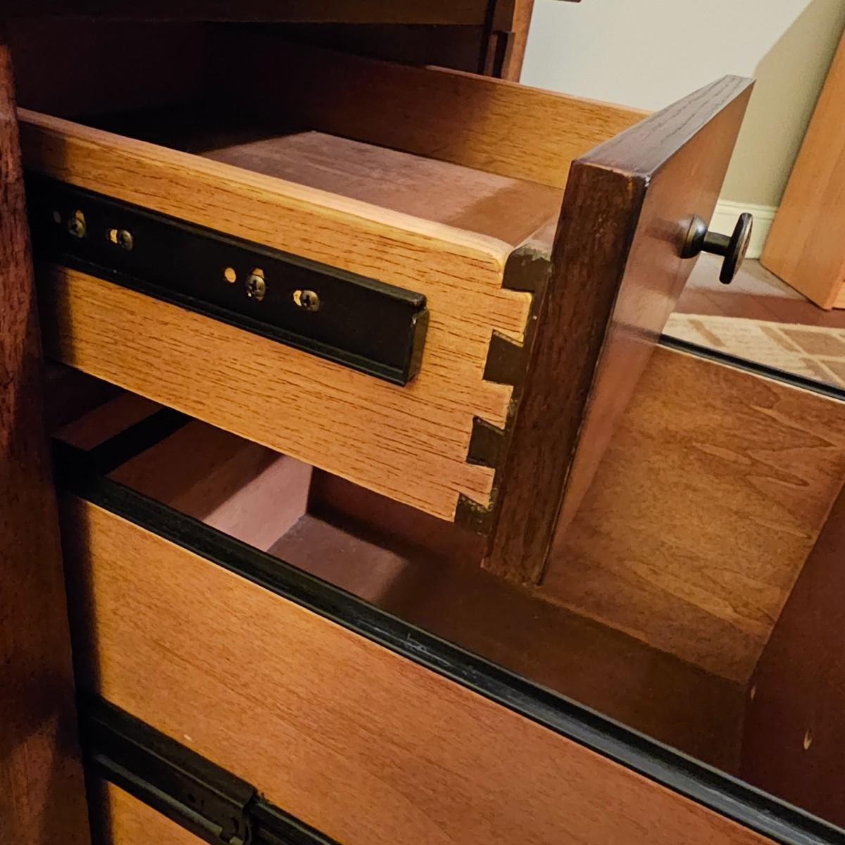 Nice dark wood corner desk with an under table file cabinet. Three drawers, dovetail corners. File unit has rolling wheels. Desk measures 62" x 62" x 30.5" H, file is 19.5" x 18.5" x 23"H. Middle drawer in desk drops down for keyboard access. Some small blemishes on drawer fronts and tops. Desk breaks down into three pieces with removal of four allen head bolts on each side. See photos for details. Local pickup only, winning bidder will need to bring tools to dismantle.