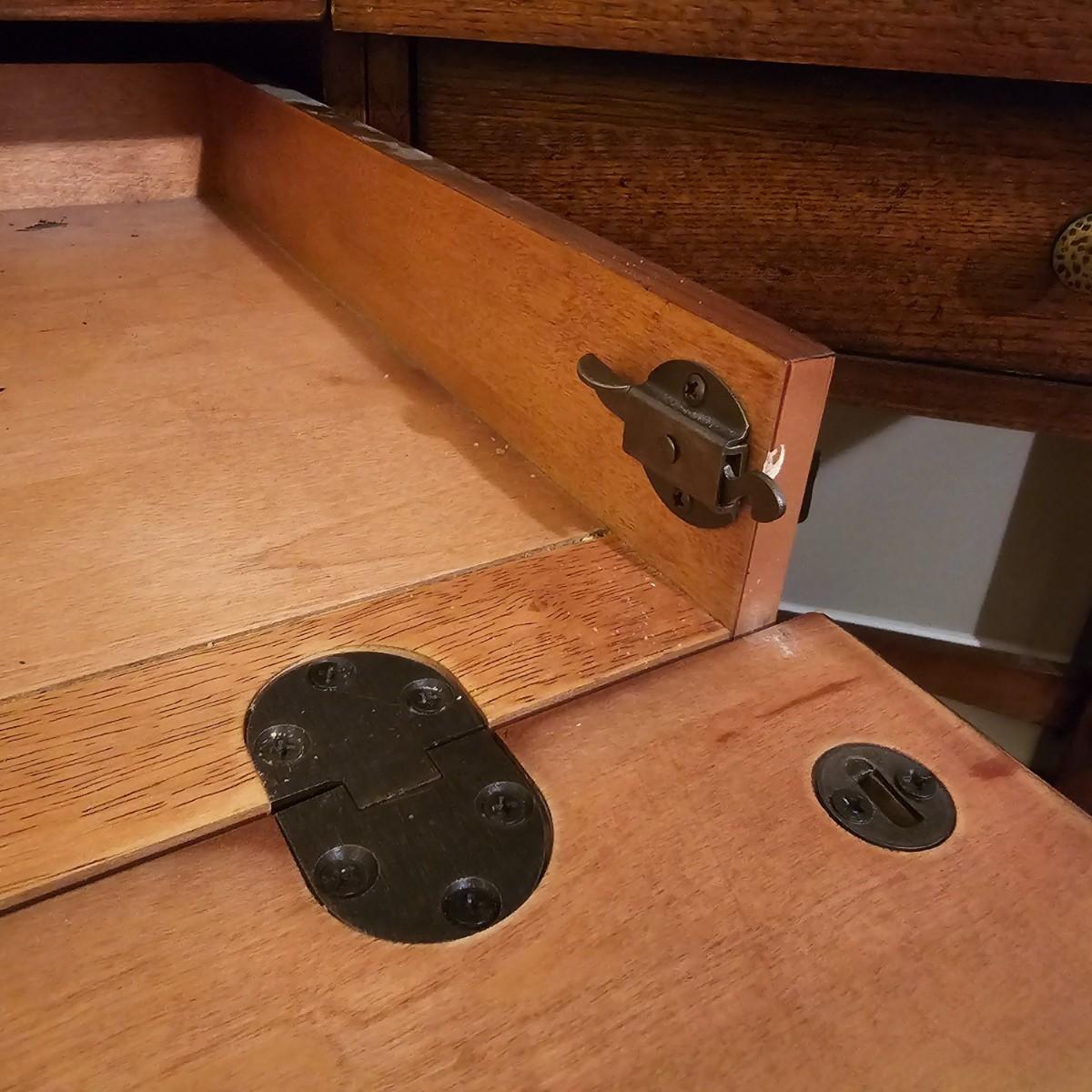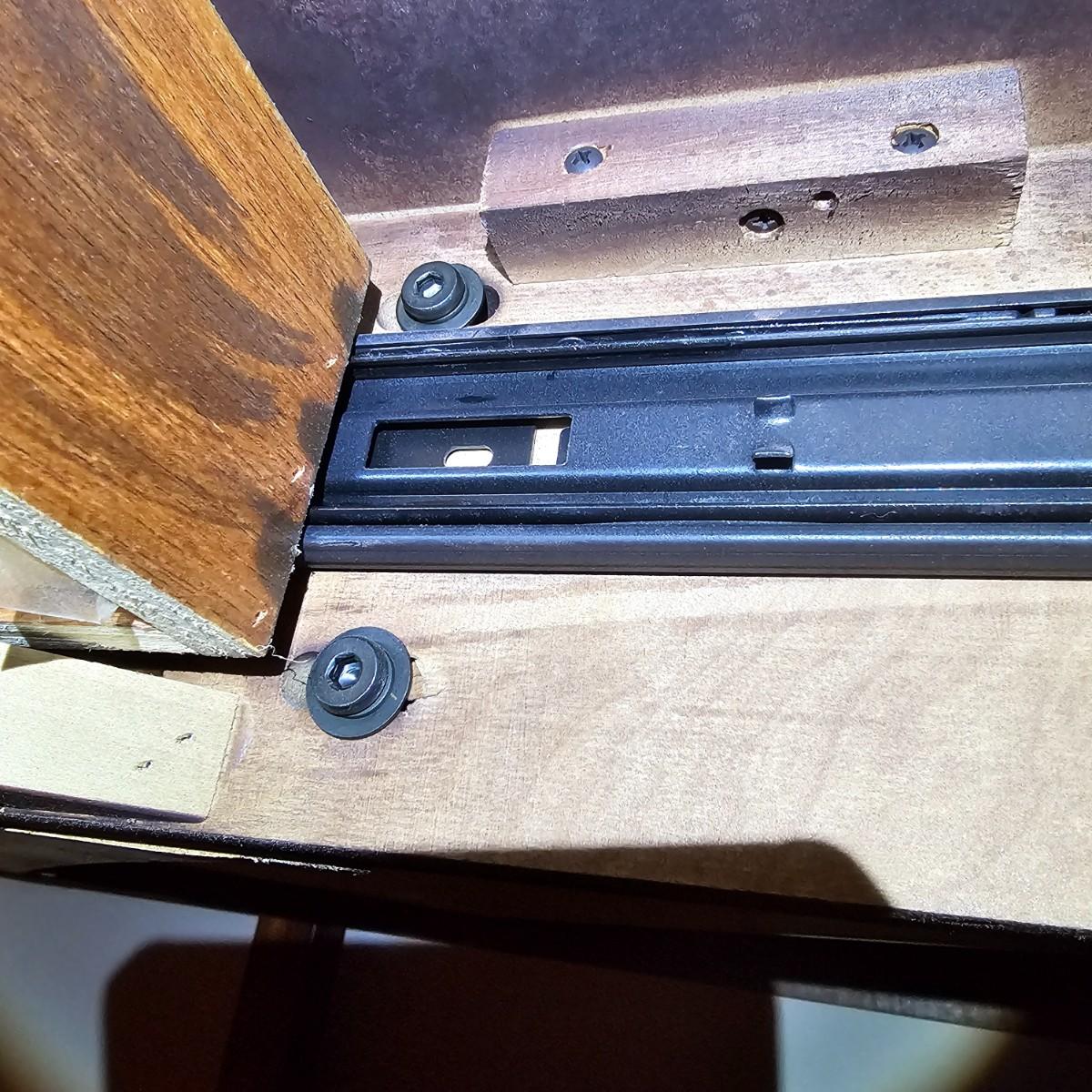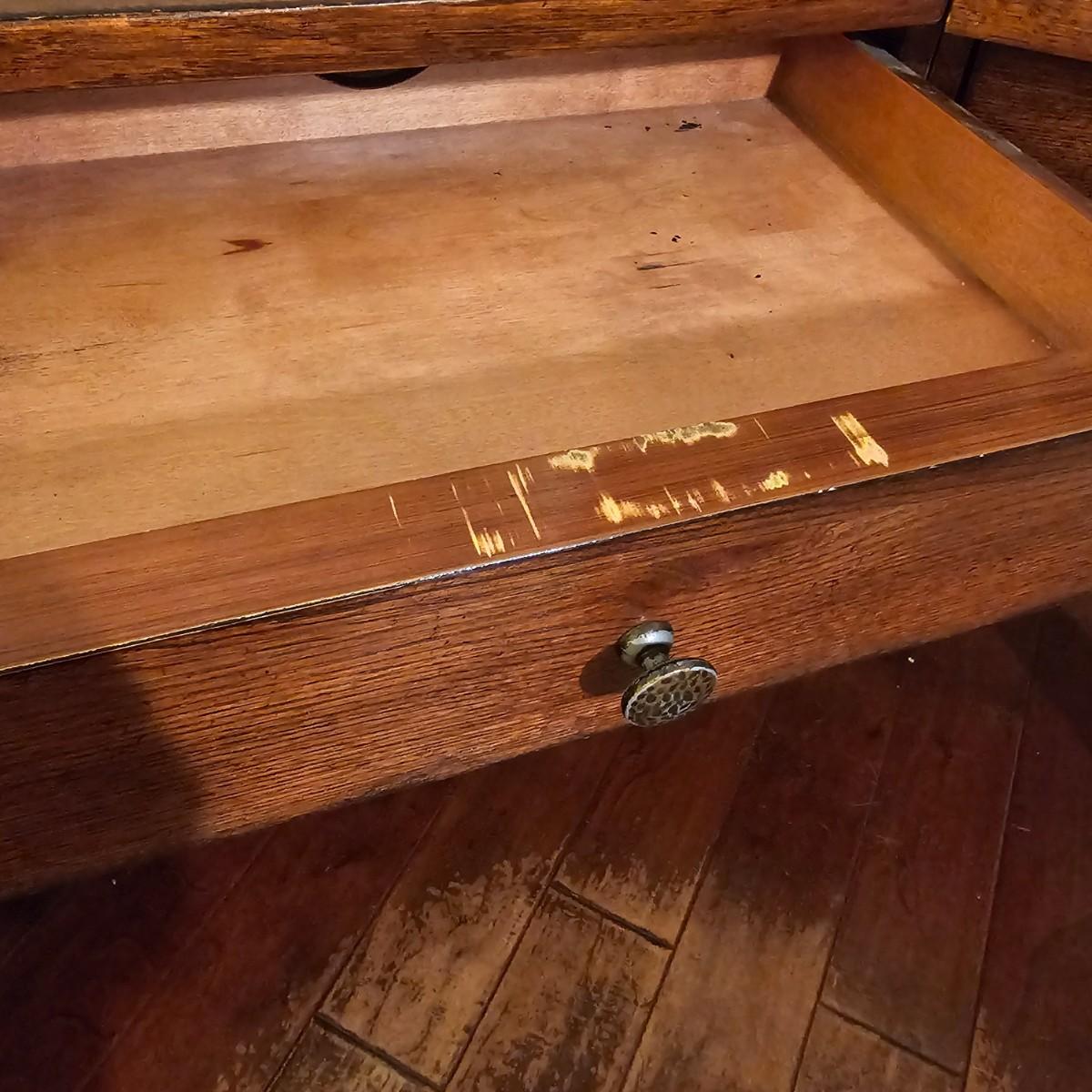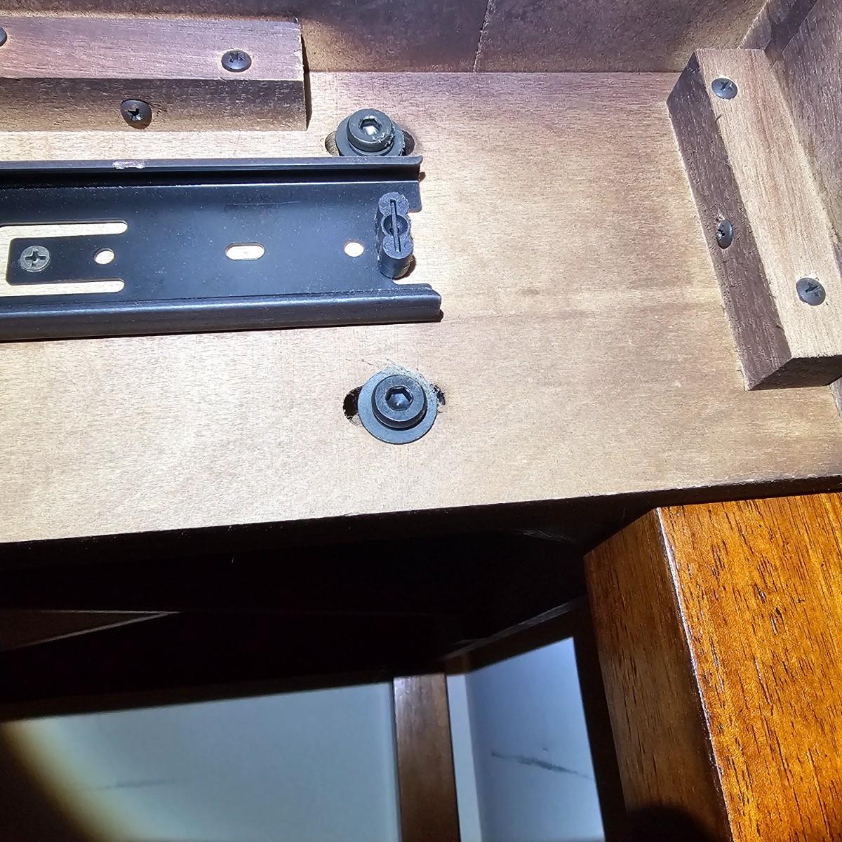 Nice dark wood corner desk with an under table file cabinet. Three drawers, dovetail corners. File unit has rolling wheels. Desk measures 62" x 62" x 30.5" H, file is 19.5" x 18.5" x 23"H. Middle drawer in desk drops down for keyboard access. Some small blemishes on drawer fronts and tops. Desk breaks down into three pieces with removal of four allen head bolts on each side. See photos for details. Local pickup only, winning bidder will need to bring tools to dismantle.