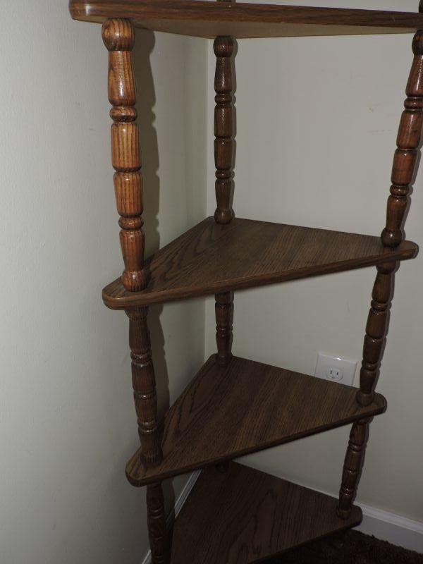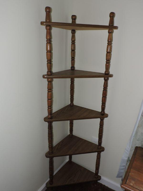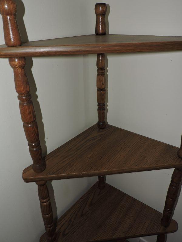 Wood corner display shelves. Stand 57" and comes out from all 15". **Please read Terms and Conditions before placing a bid. Pick up is Thursday, August 15, 2019 from 4pm to 7pm or Sunday, August 18 from 11am-2pm in Mullica Hill. All sales are final. All sales are as is, where is. Please review all photos. Any props included in photos are not included in listing. All measurements are approximate.