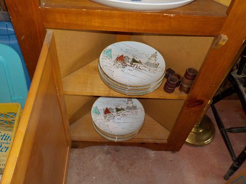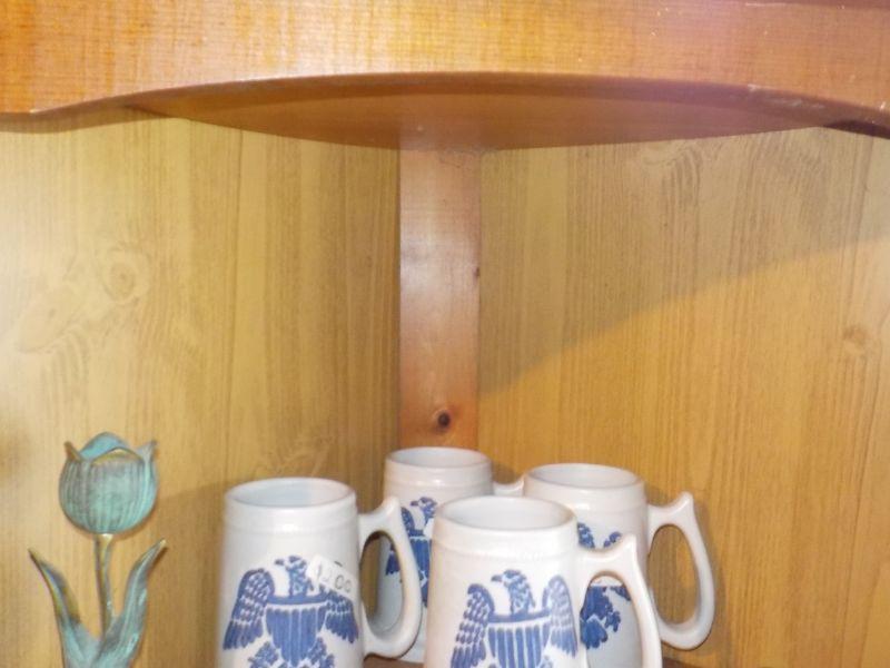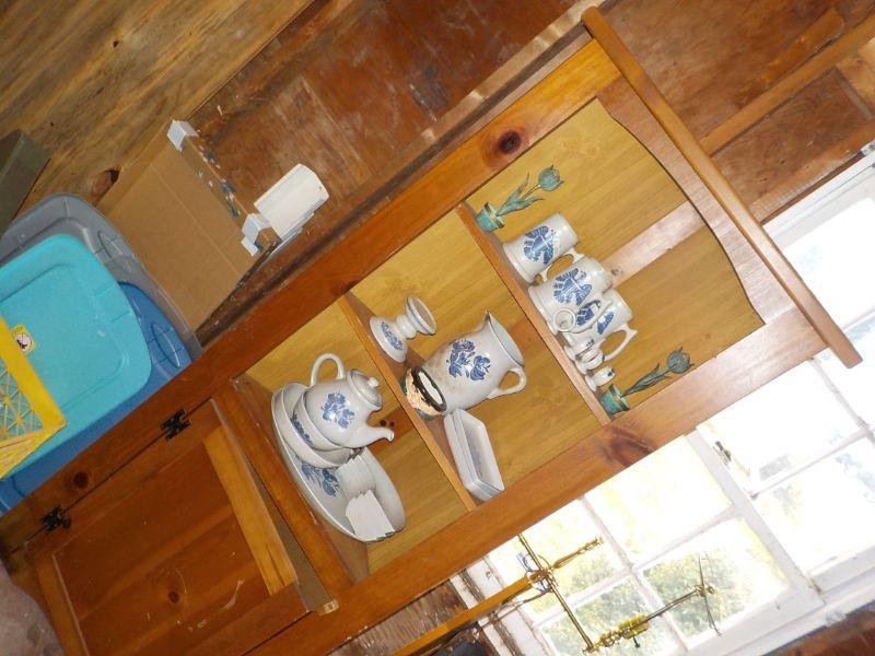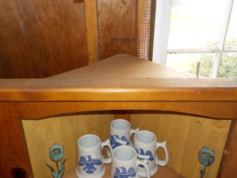 Very solid fits in corner of any living room. NO CONTAINS ON SHELVES COME WITH HUTCH.....