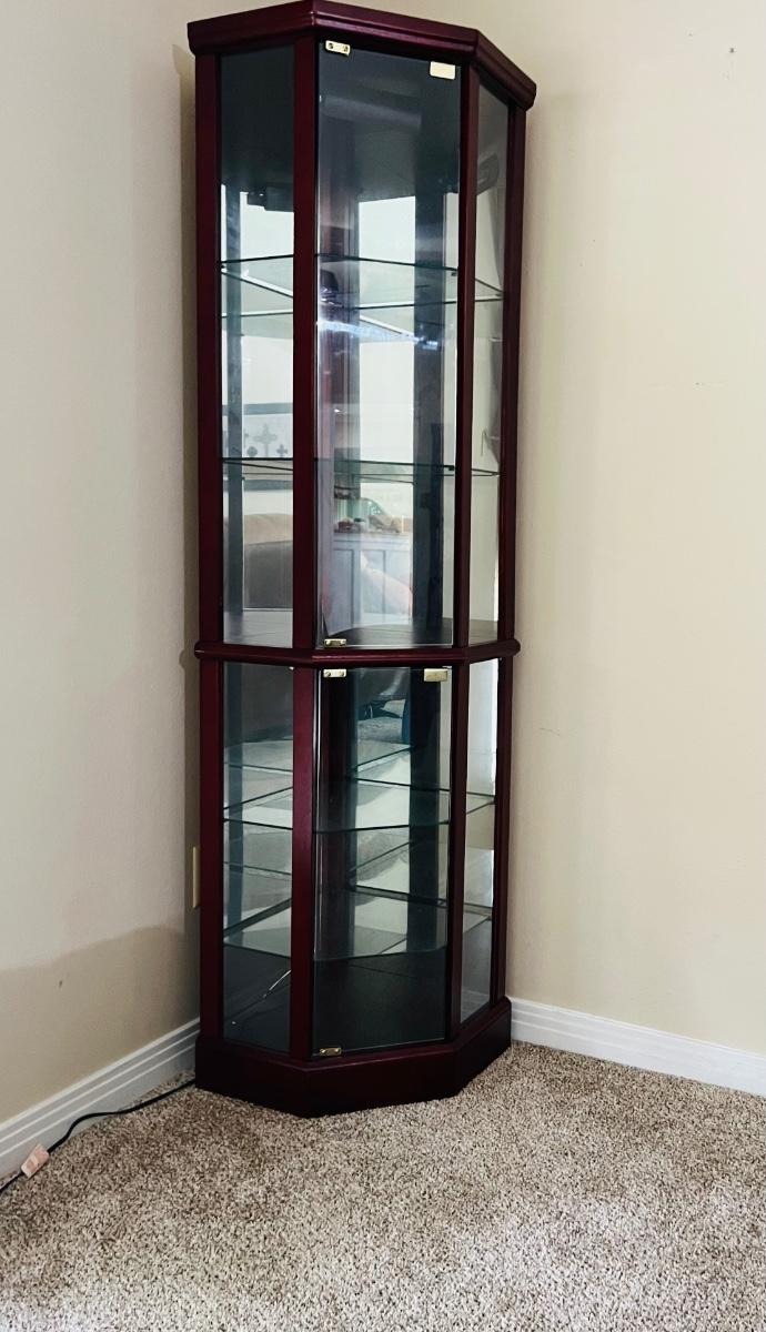 Back, left bottom mirror has a crack. Glass closes with magnet. Measures 70 inches tall, 19 inches deep and corner to corner measures at 16 inches