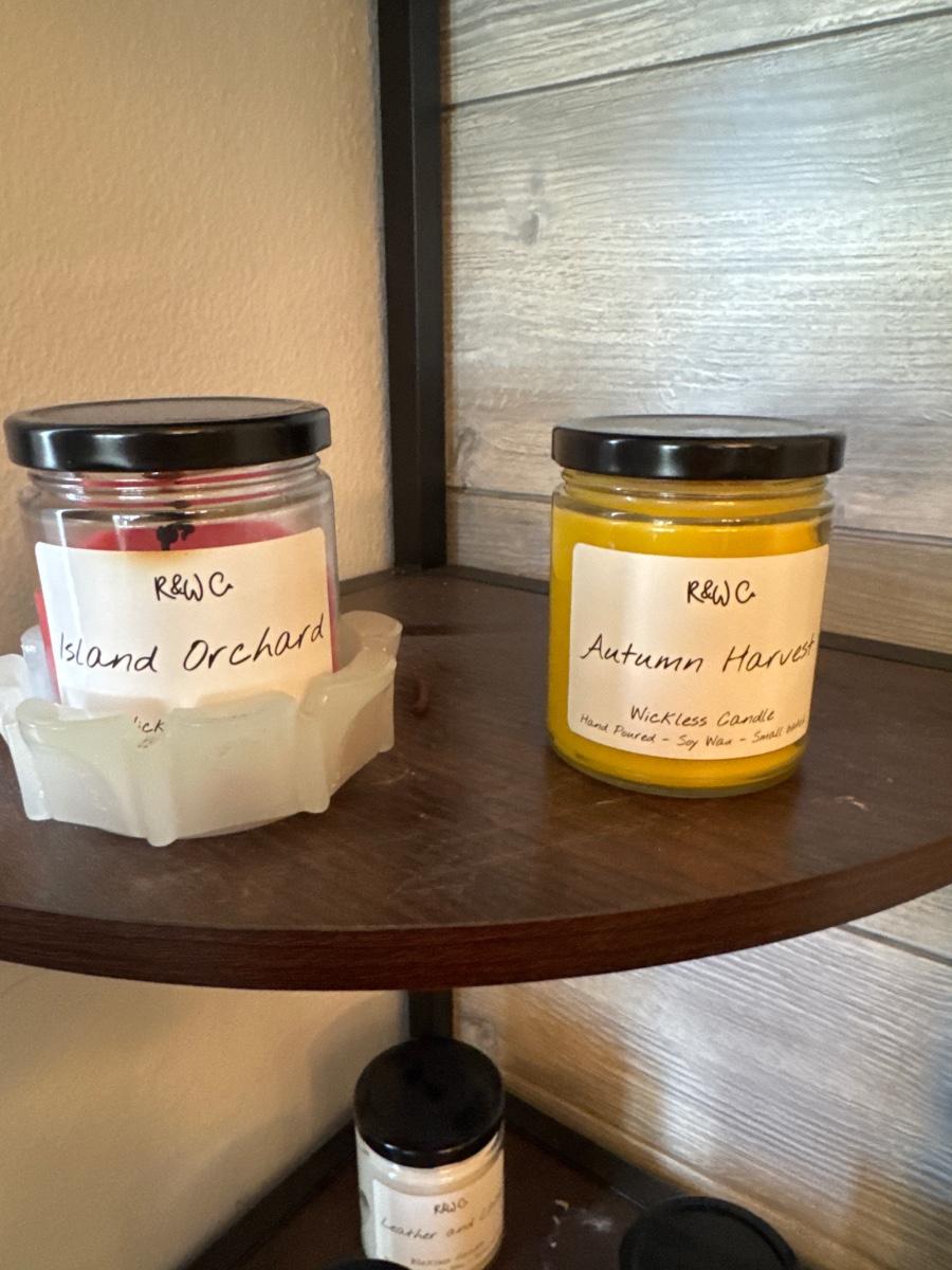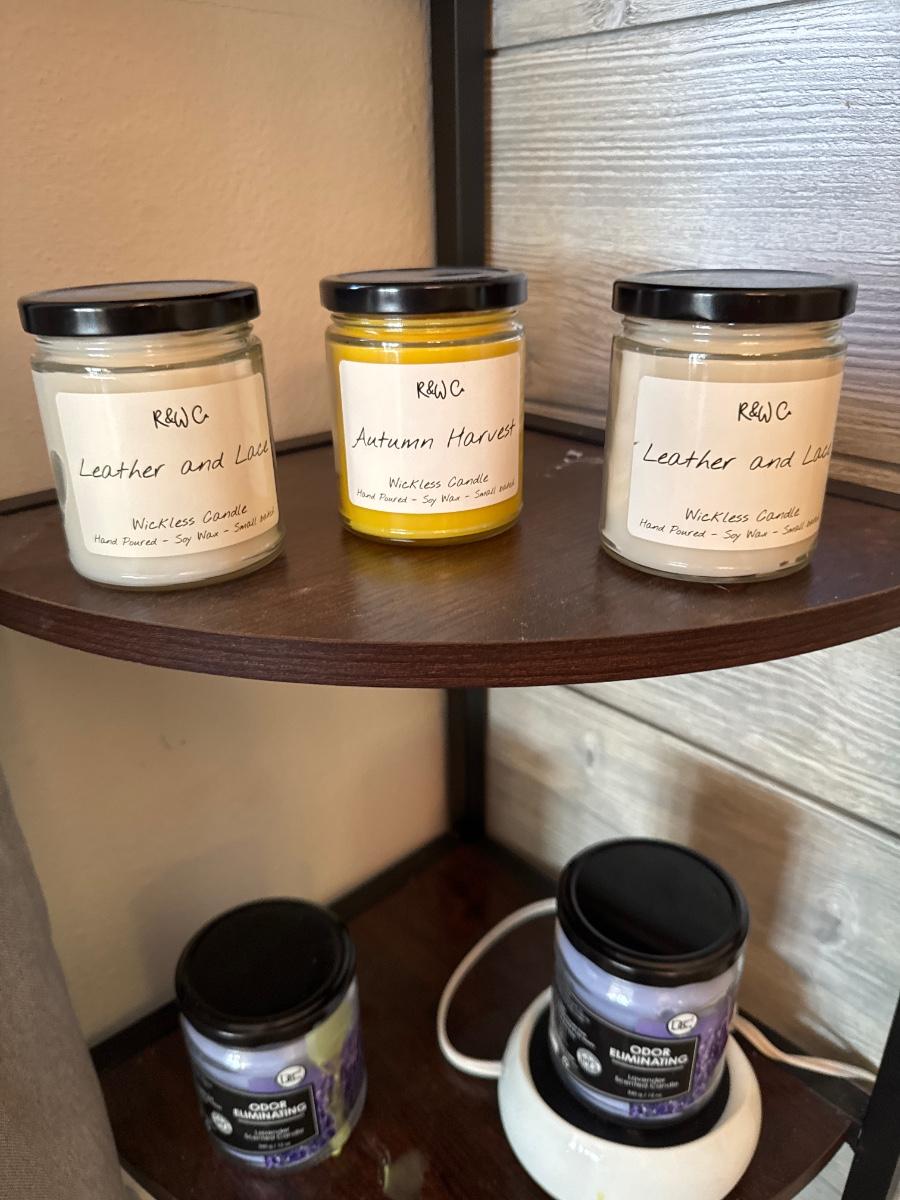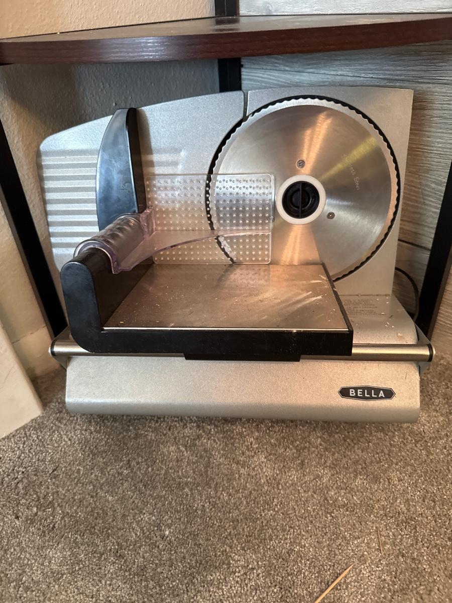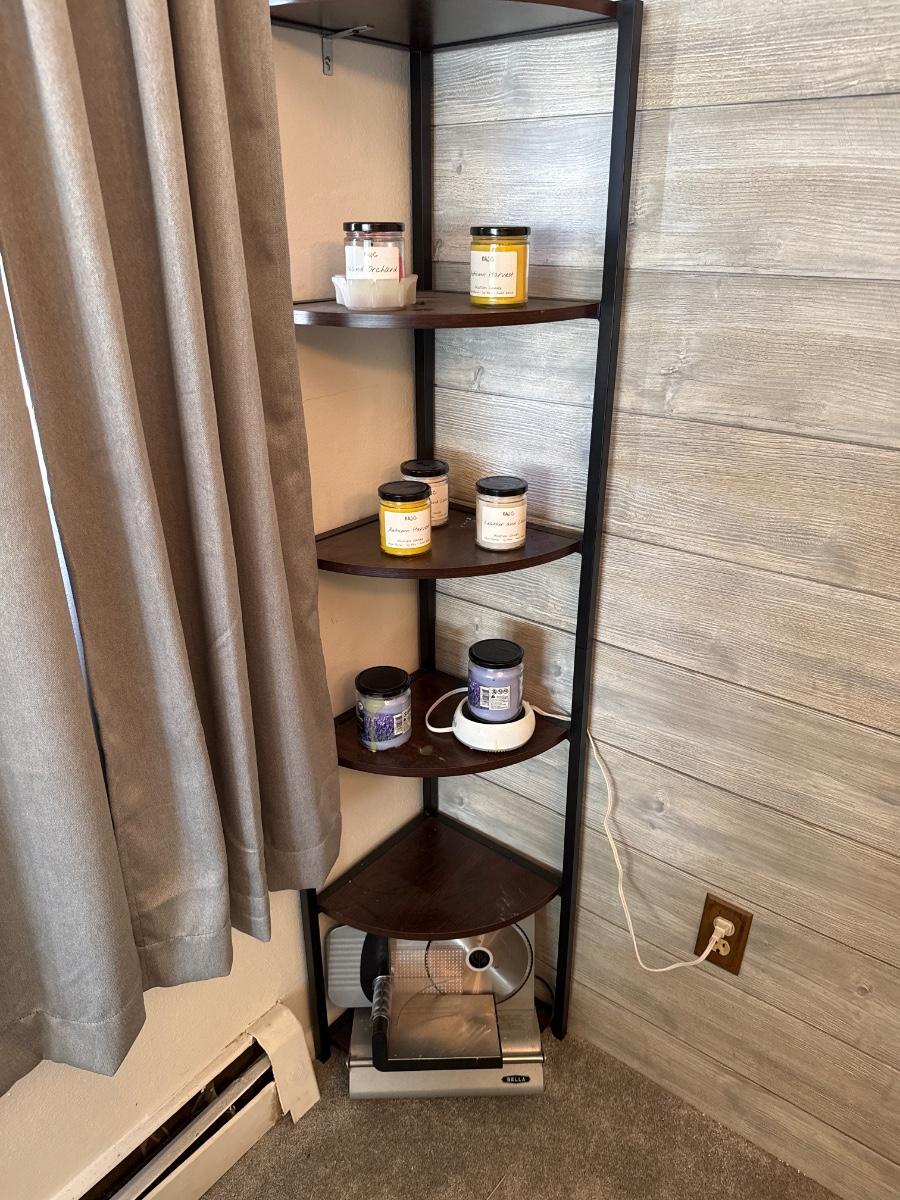 Corner shelf with candles and Bella meat slicer