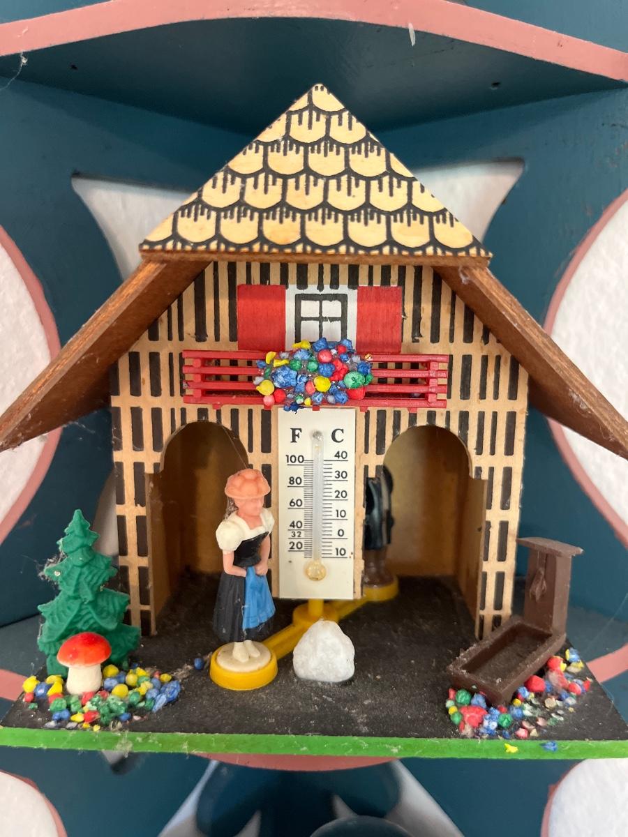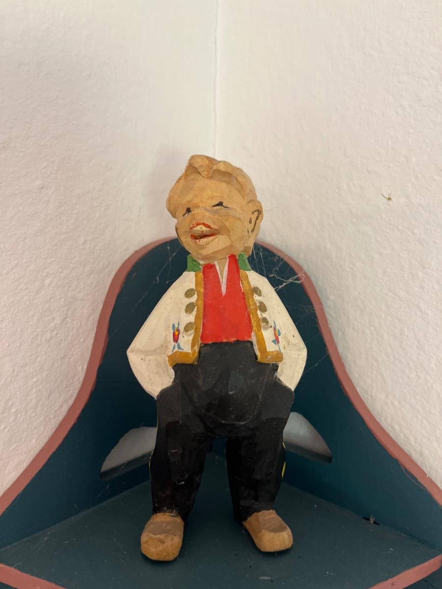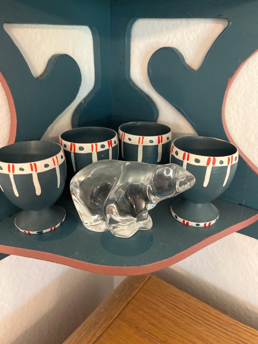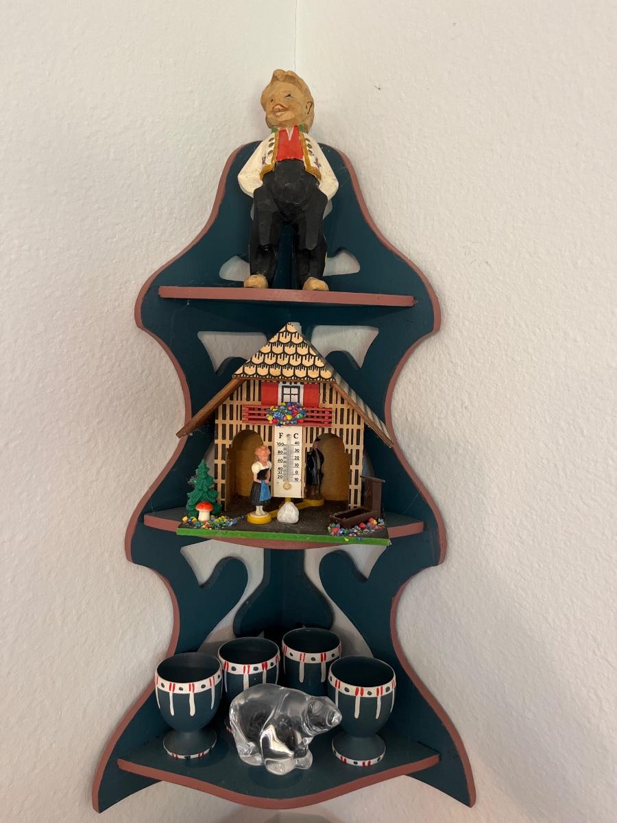 Corner shelf with carved man, egg cups, Crystal, bear and thermometer