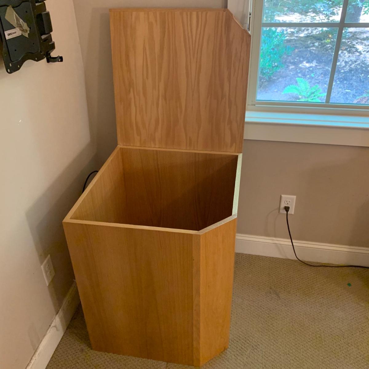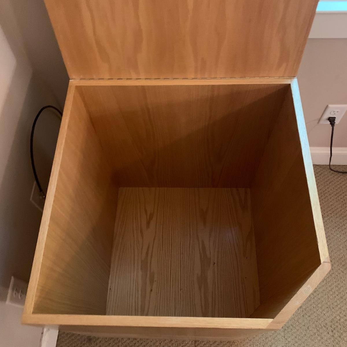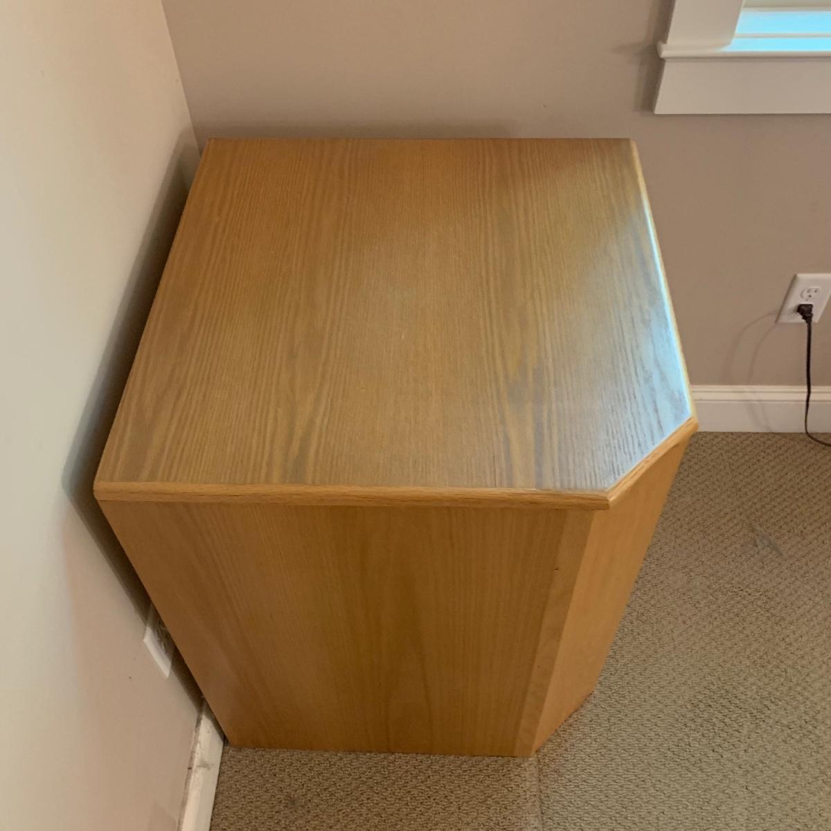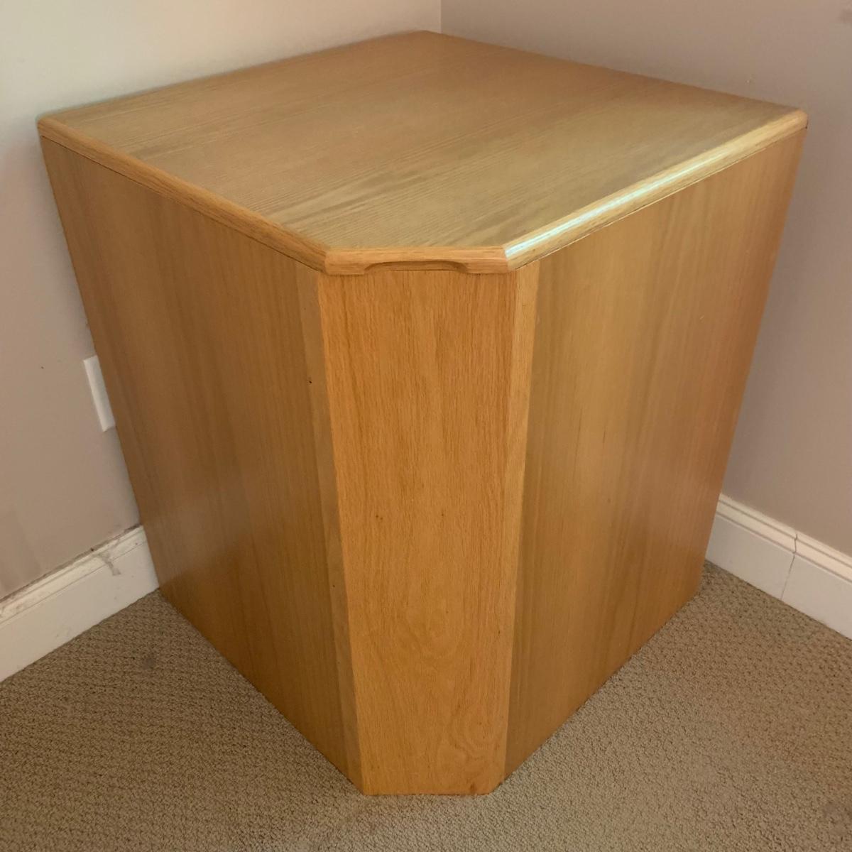 Wood corner storage cabinet has a hinged lid that covers one large compartment. Cabinet measures approximately 24”sq. x 30”H. There are some light scratches on the top surface of the lid; see photos.