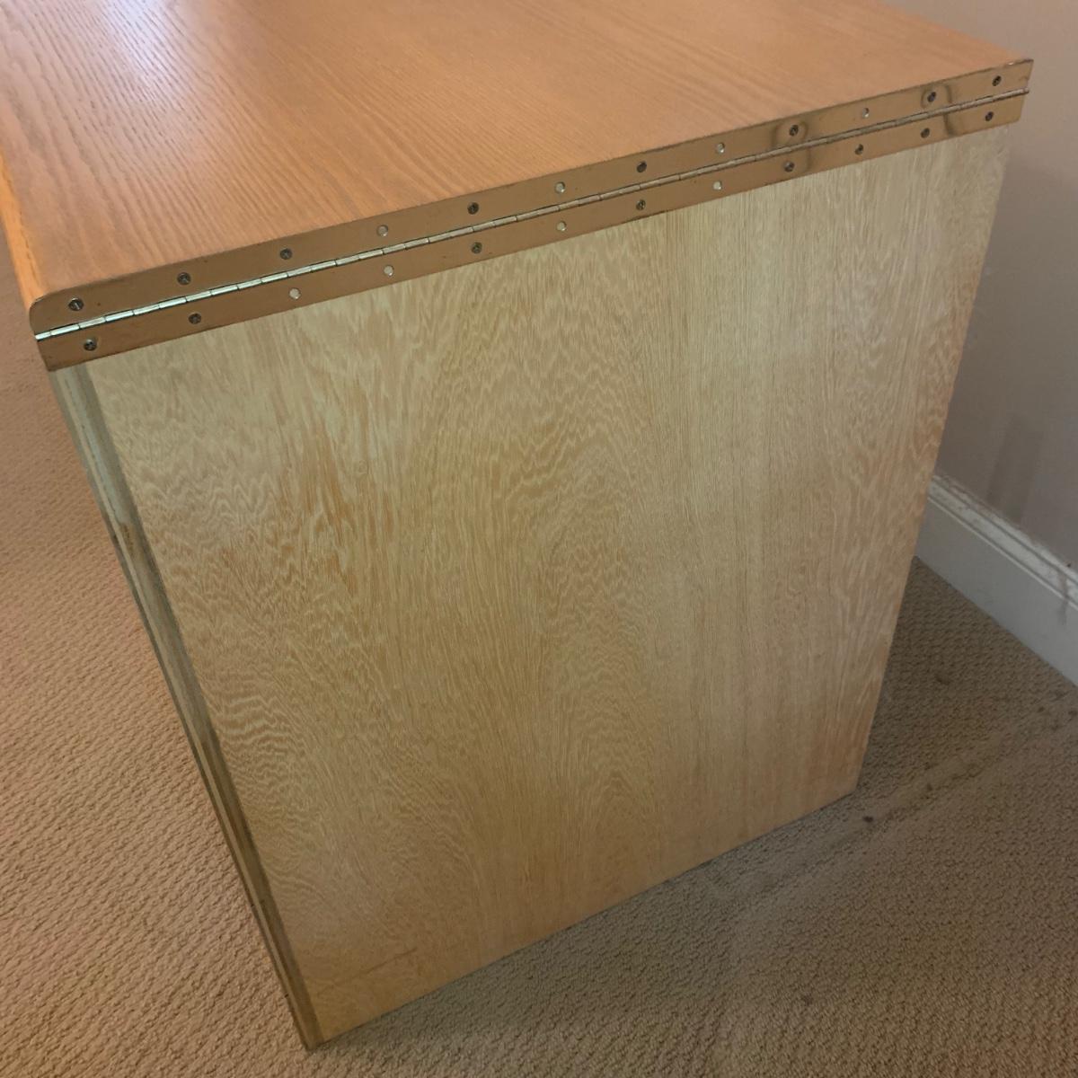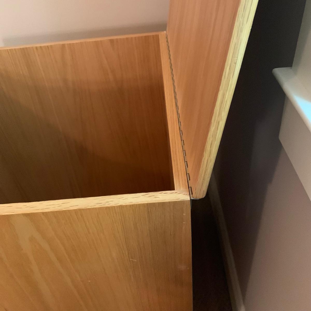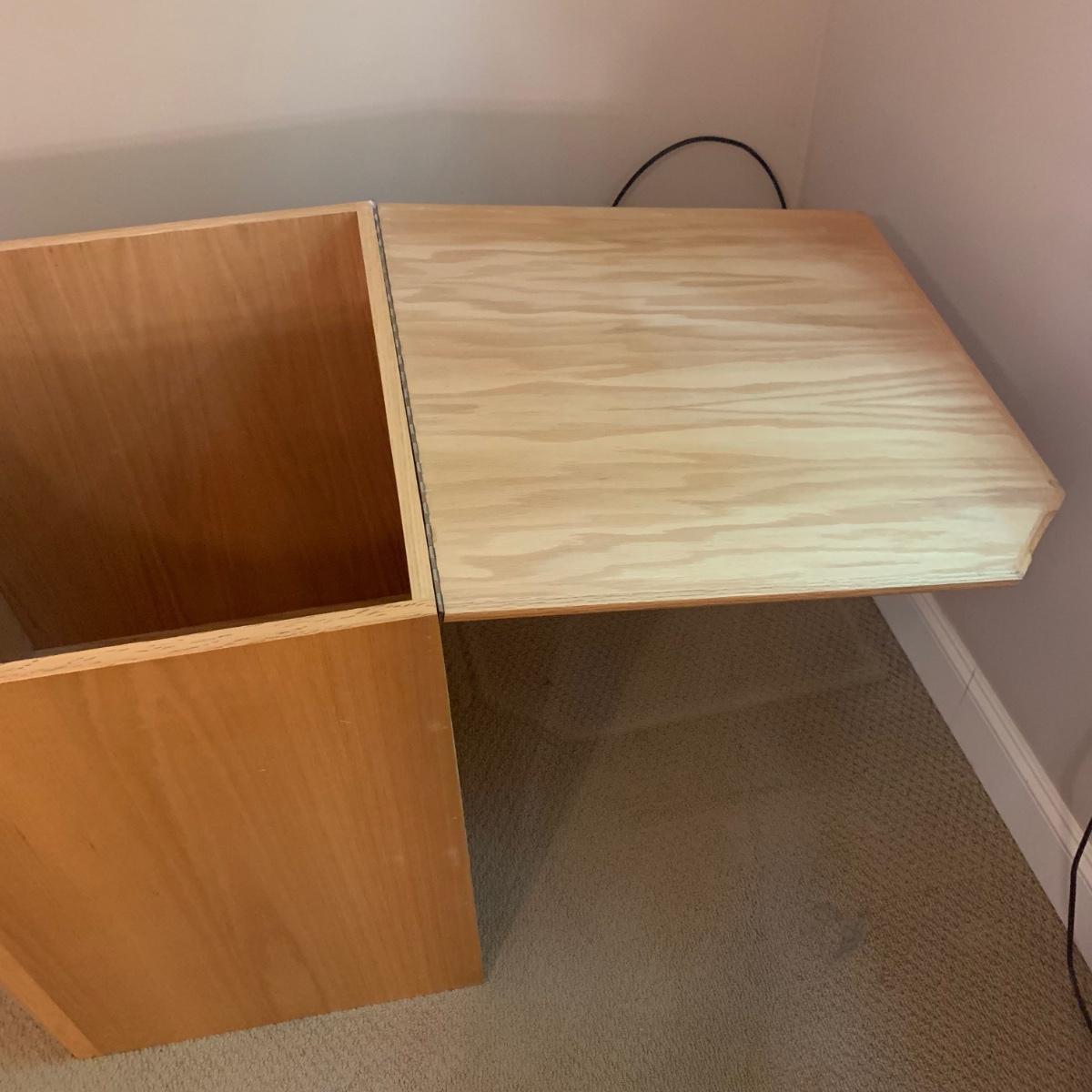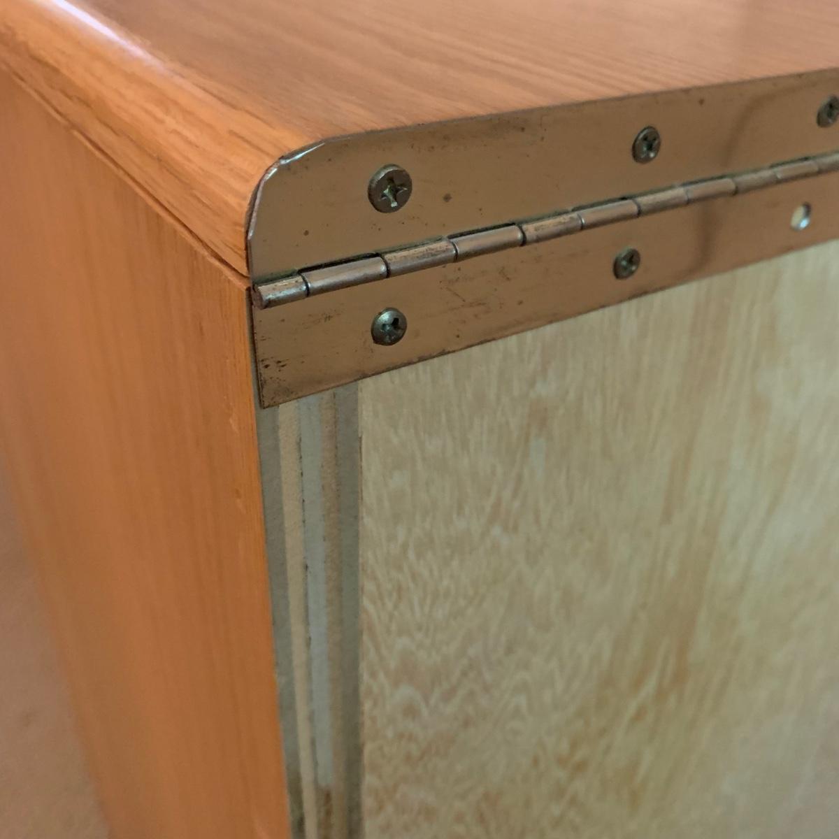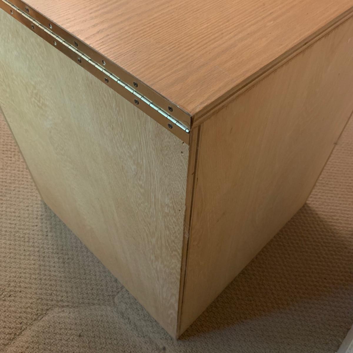 Wood corner storage cabinet has a hinged lid that covers one large compartment. Cabinet measures approximately 24”sq. x 30”H. There are some light scratches on the top surface of the lid; see photos.