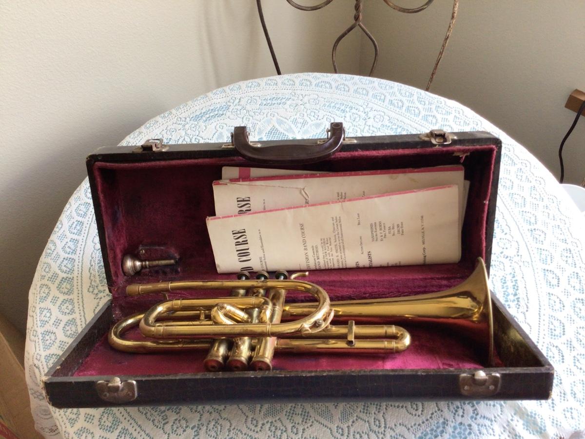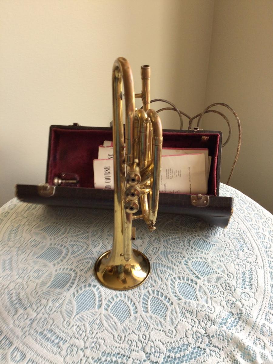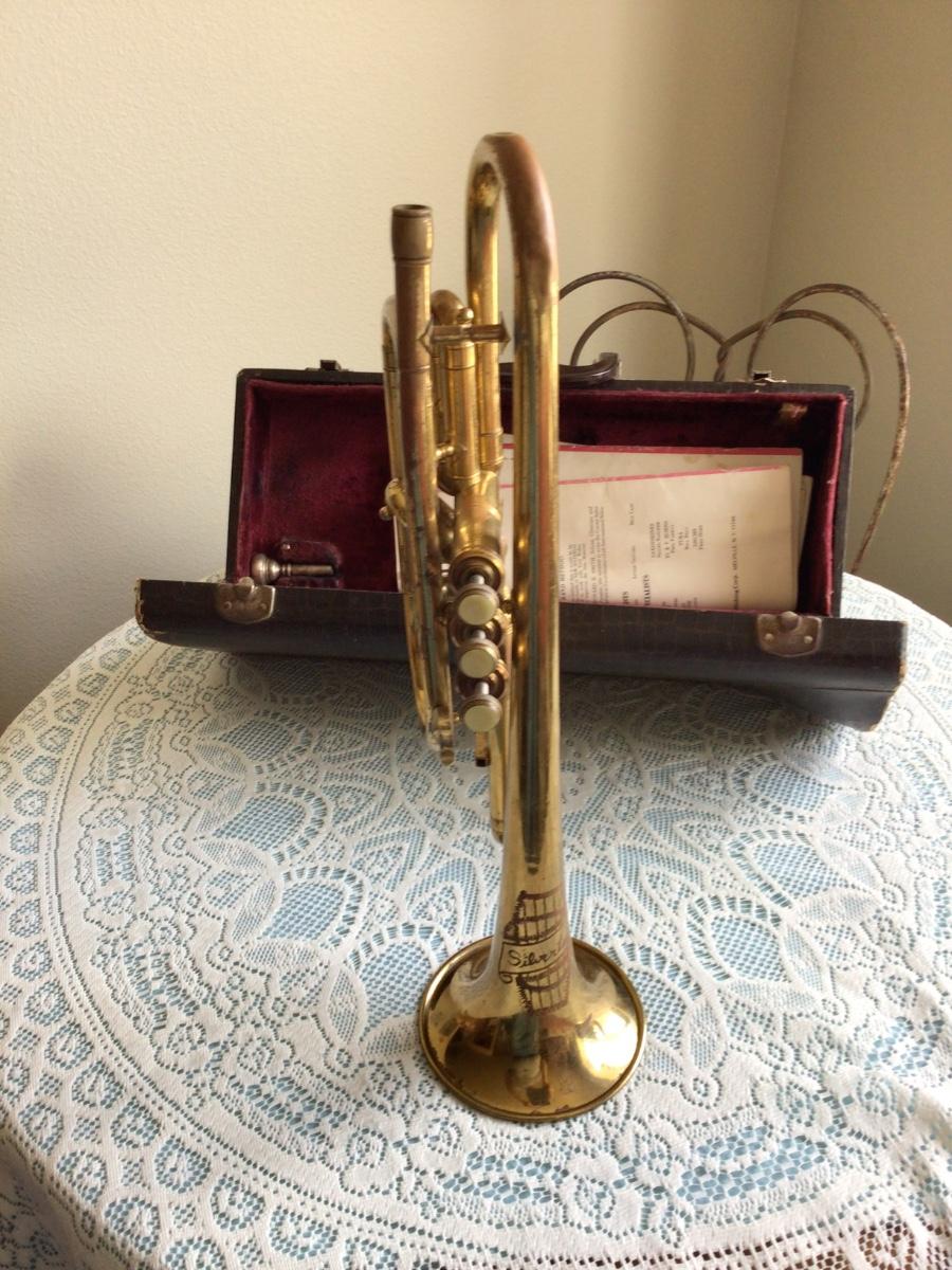 This is a great Silvertone Cornet music instrument with mouth piece. Comes with alligator case and two music books.