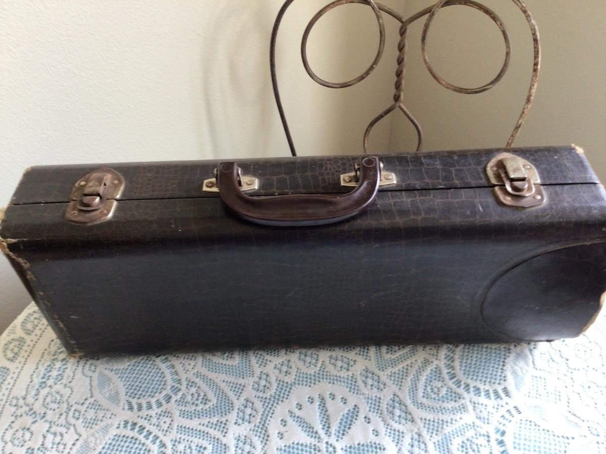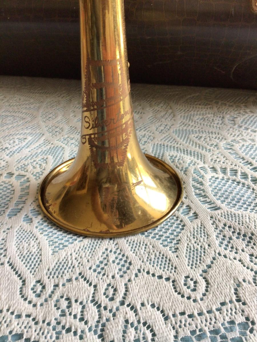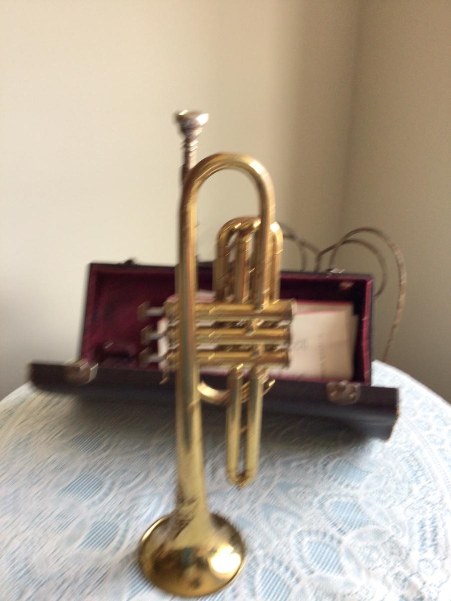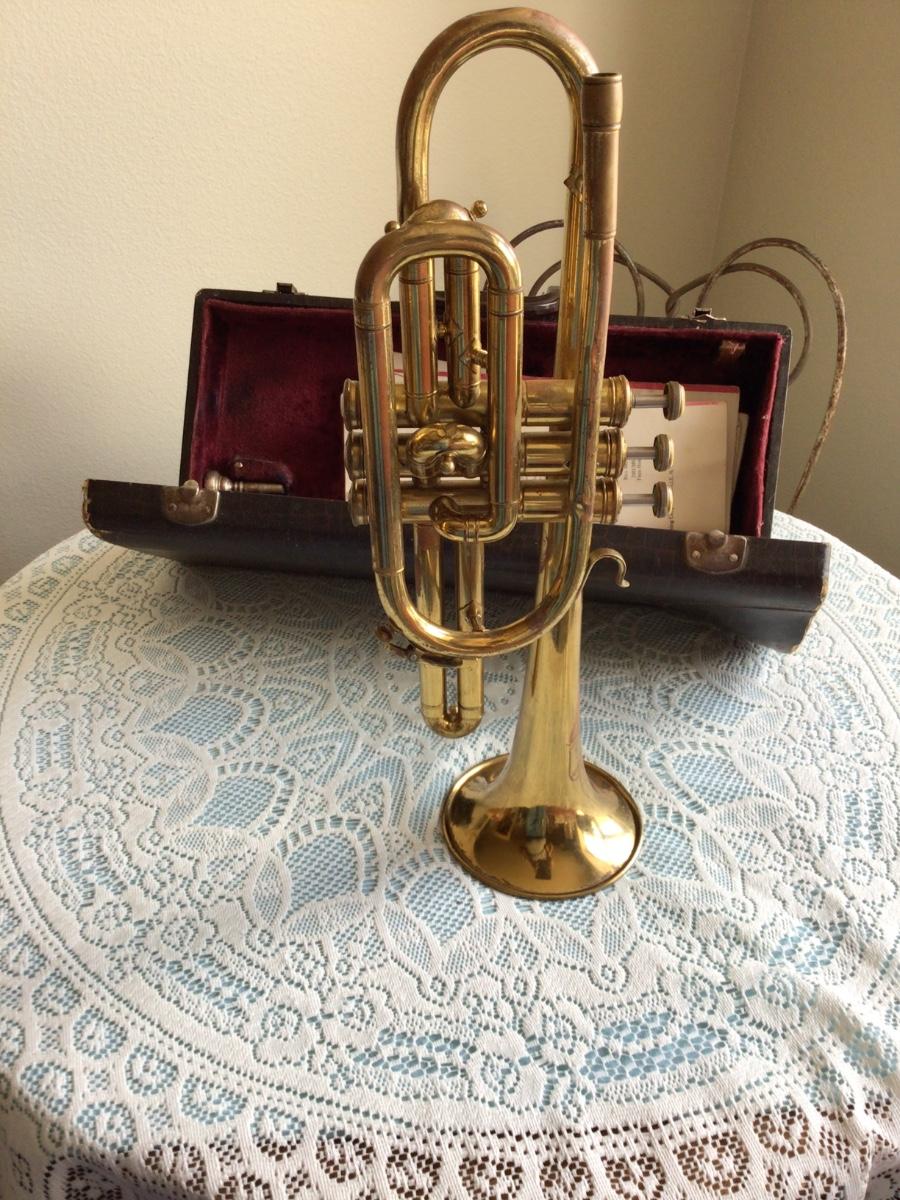 This is a great Silvertone Cornet music instrument with mouth piece. Comes with alligator case and two music books.