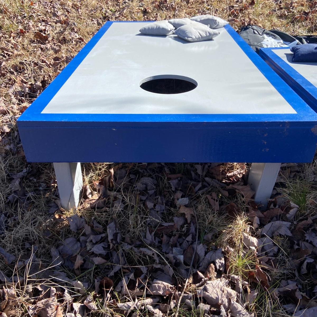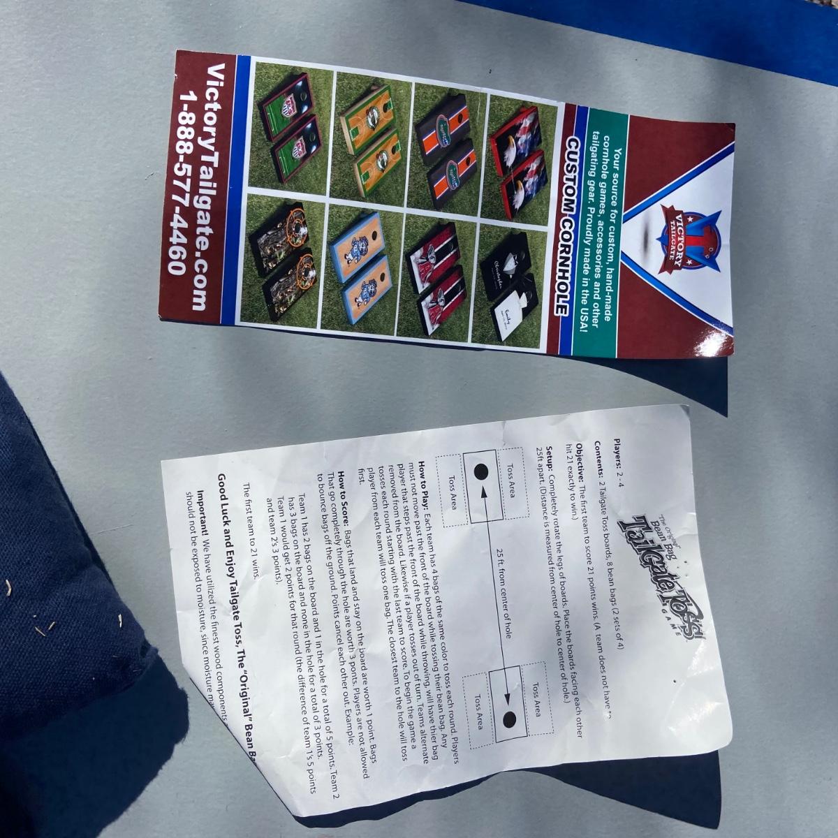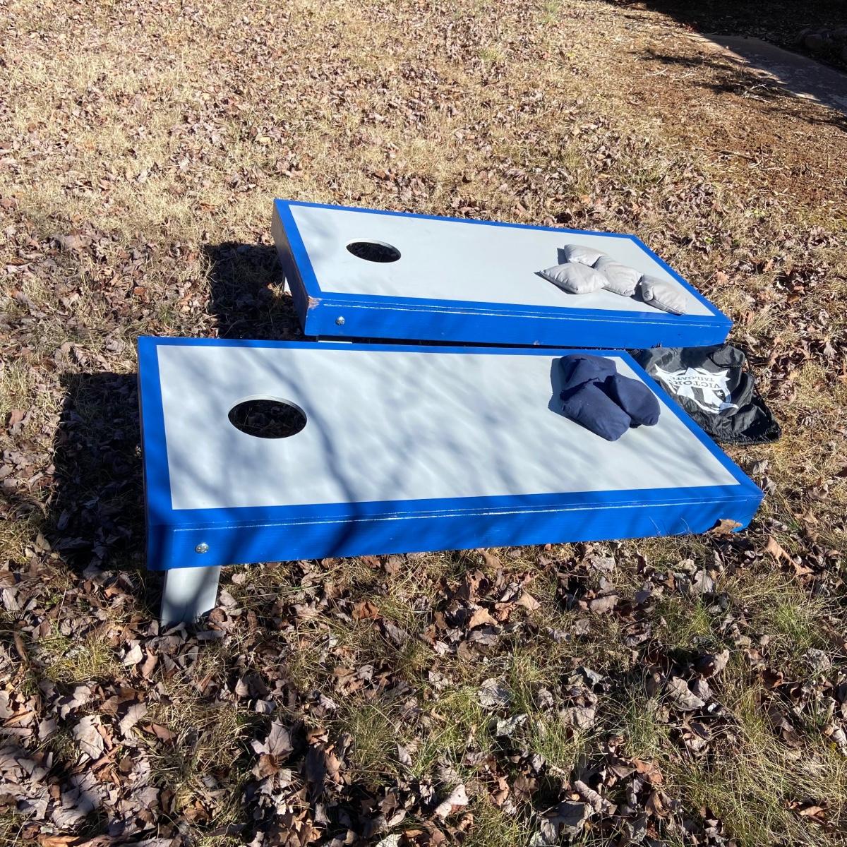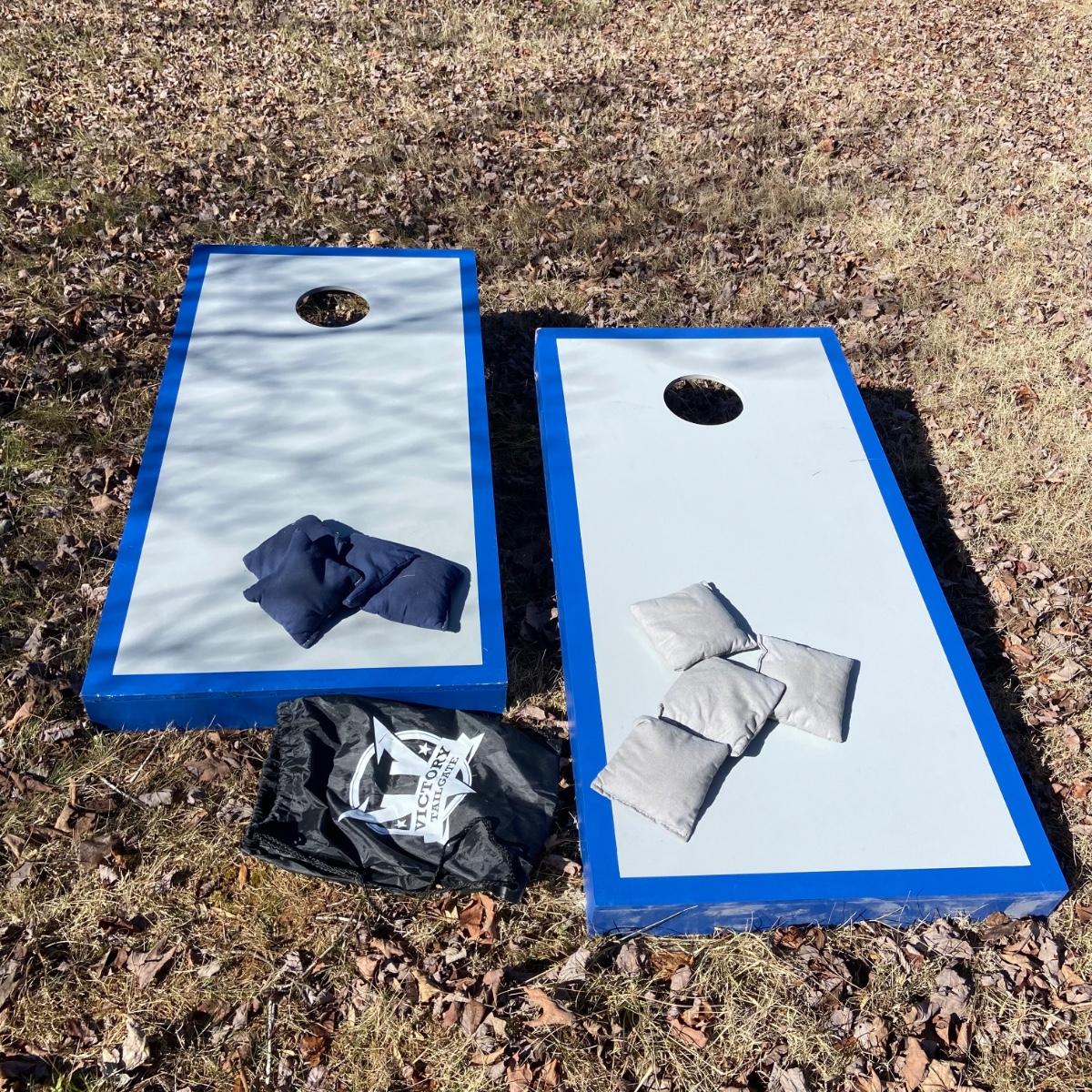 This lot is a cornhole board set with instructions and a total of eight bean bags, four grey and four navy and a bag to hold accessories. Local pick up only.