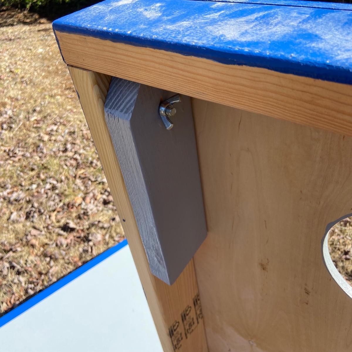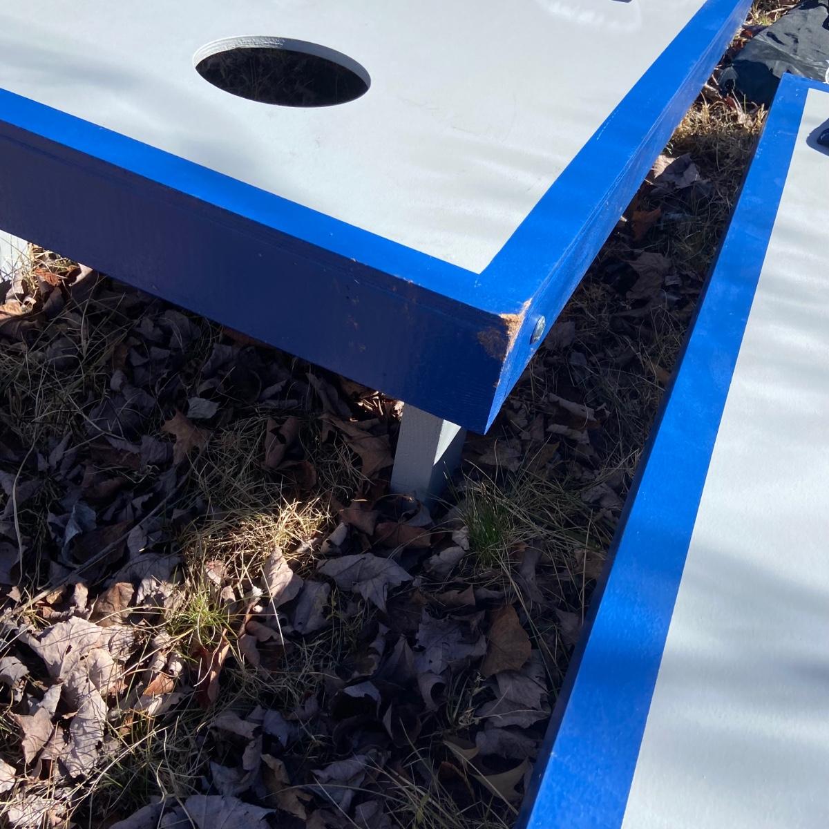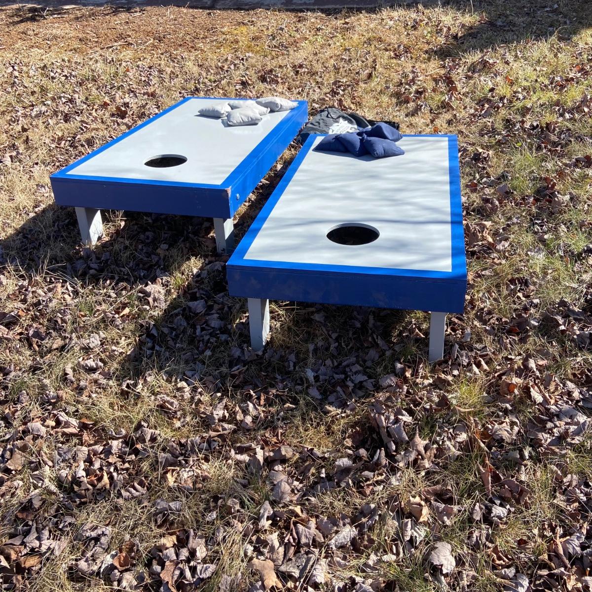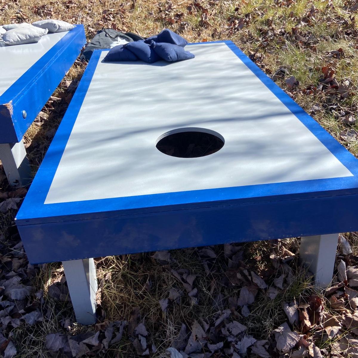 This lot is a cornhole board set with instructions and a total of eight bean bags, four grey and four navy and a bag to hold accessories. Local pick up only.