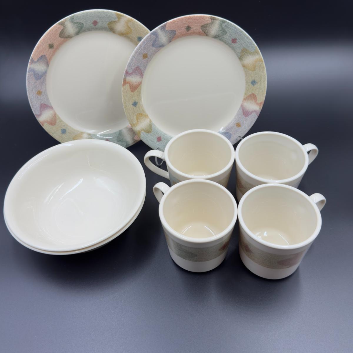 Includes 4 Corning cups, 2 cereal bowls, and 2 dessert plates measuring 7 1/4"