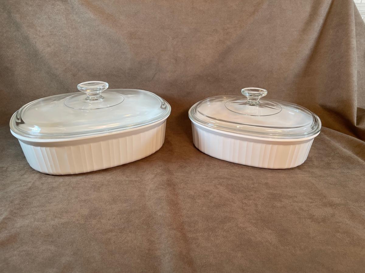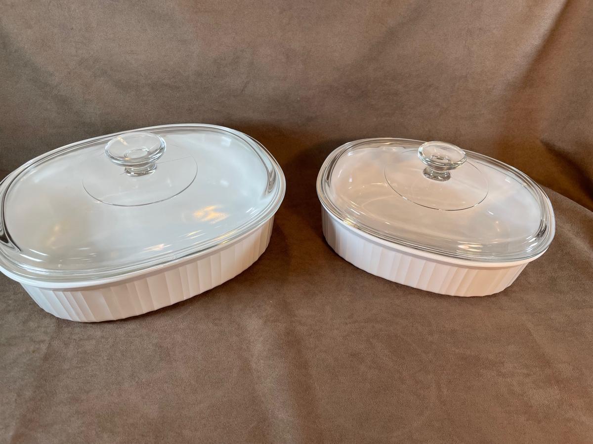 Corning French White pattern. Two oval covered baking dishes