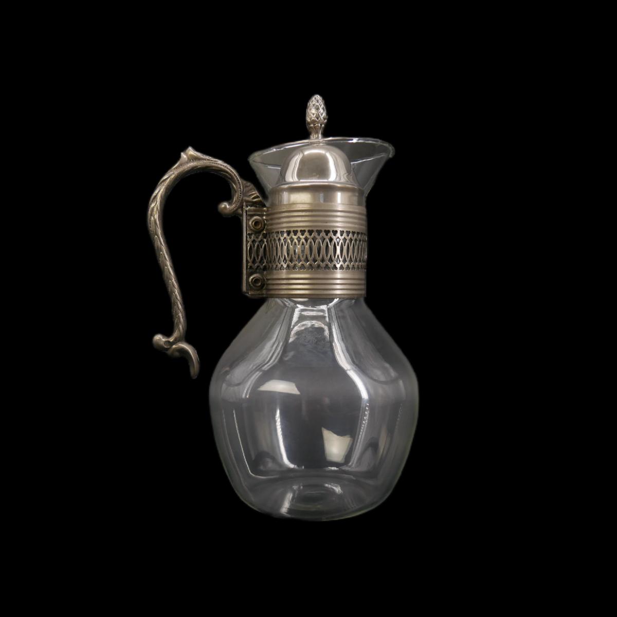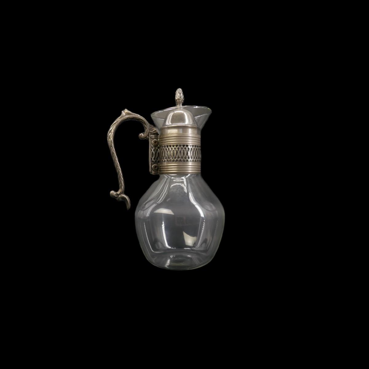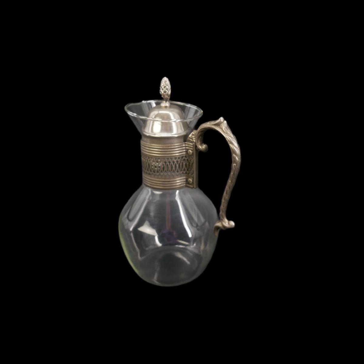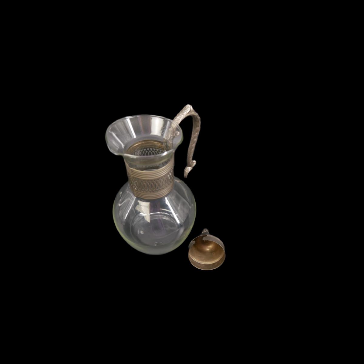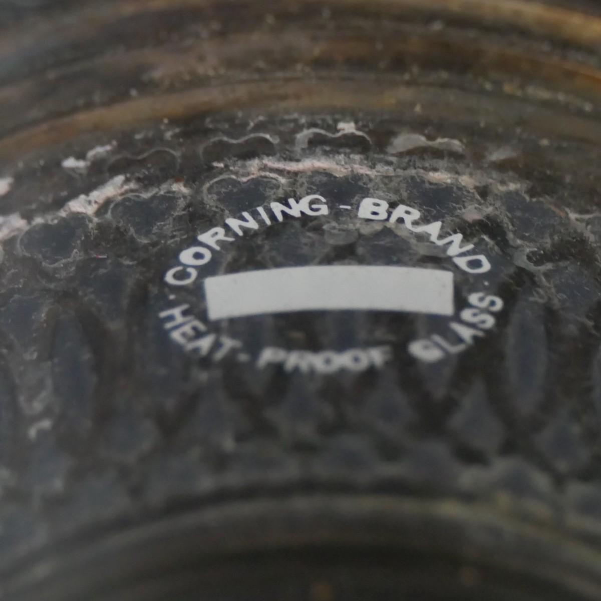 Large mid-century vintage glass and ornately designed metal pitcher. Sticker reads "Corning Brand, Heat Proof Glass". Great condition, minor rusting in cap (see photo). Measures L 7" x H 10.5", weighs 1 lb 5 oz. (D45)