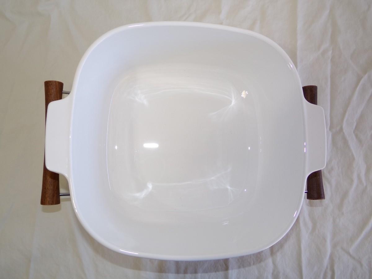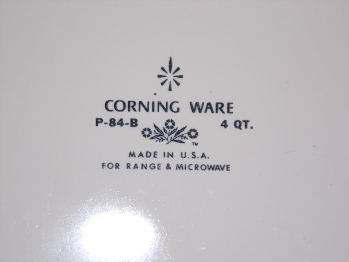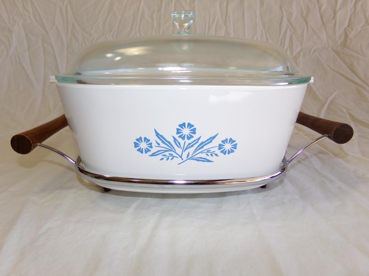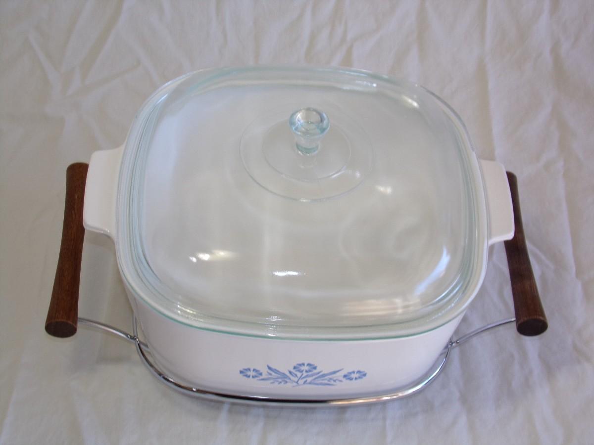 Corning Ware 4 Qt. casserole with matching lid and carrier/stand. Condition is excellent. Shiny bright and spotless inside and out. NO signs of use/wear. # P-84-B CG
