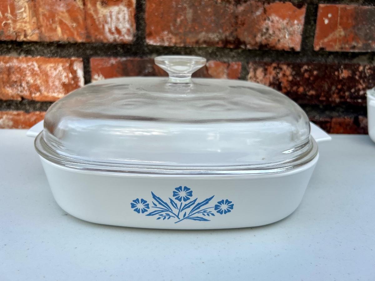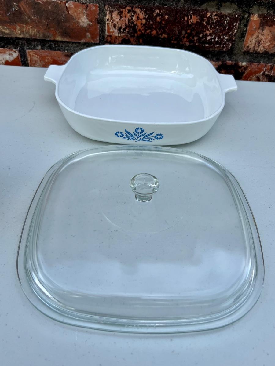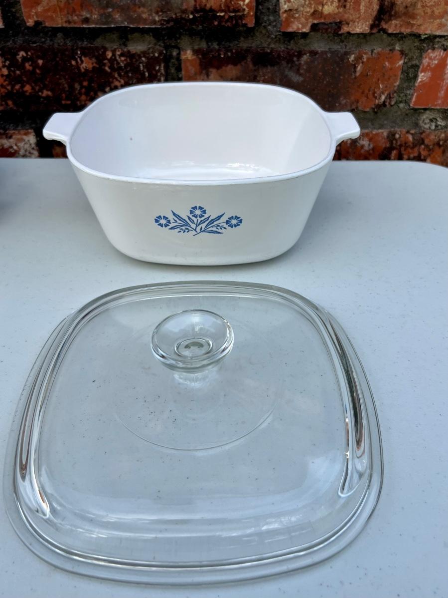 CORNING WARE set of 5 (set B) includes 2 1/2 Quart, 10 inch, 1/2 Quart, 9 3/4 X 9 3/4 and Loaf 9x5x3, All have lids except the loaf.