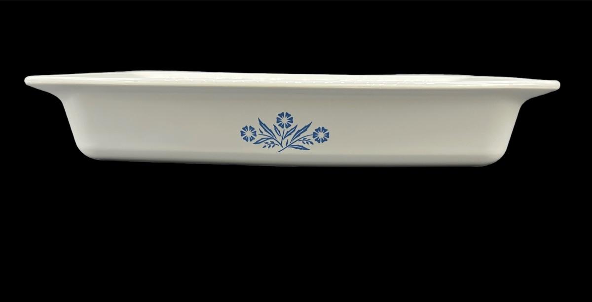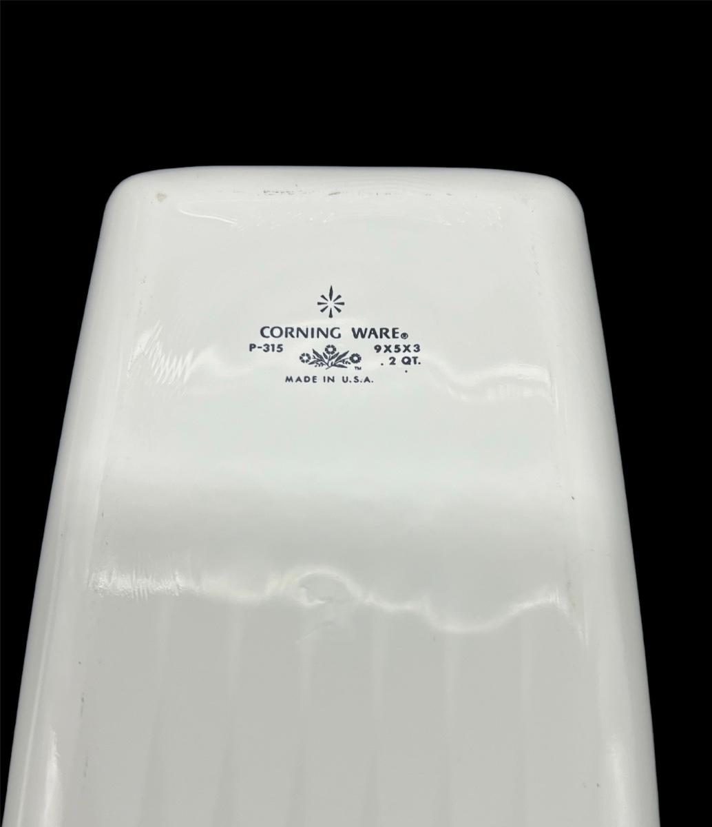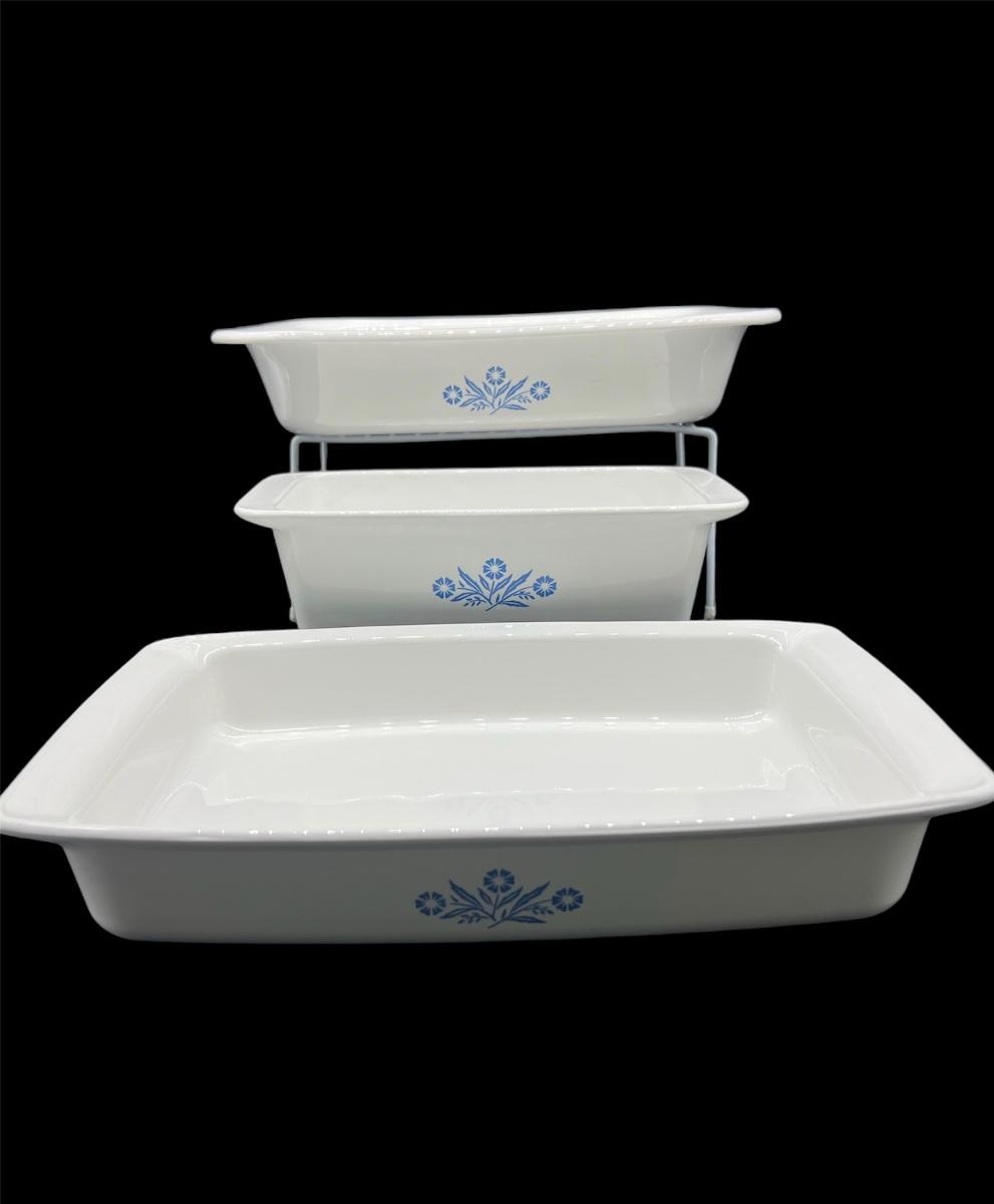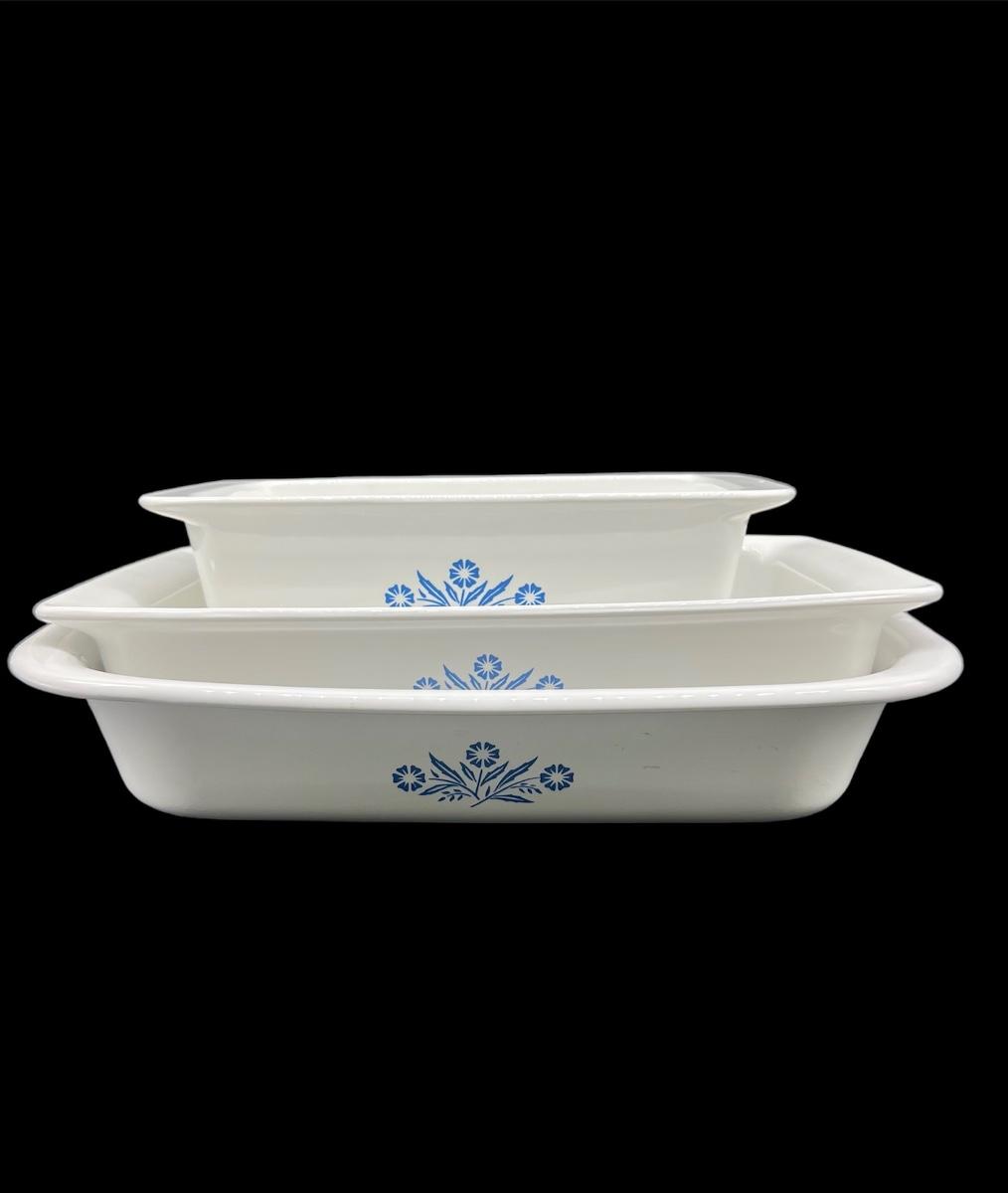 Three pieces of CORNING WARE large baking dishes. Largest - CORNING WARE ° - A-21 12 1/4X10 1/4X2 1/4 INCH. Middle size - CORNING WARE ° - P332 2 Quart 12 X7 1/2 x 2. Last is P315 2 Quart 9X5X3
