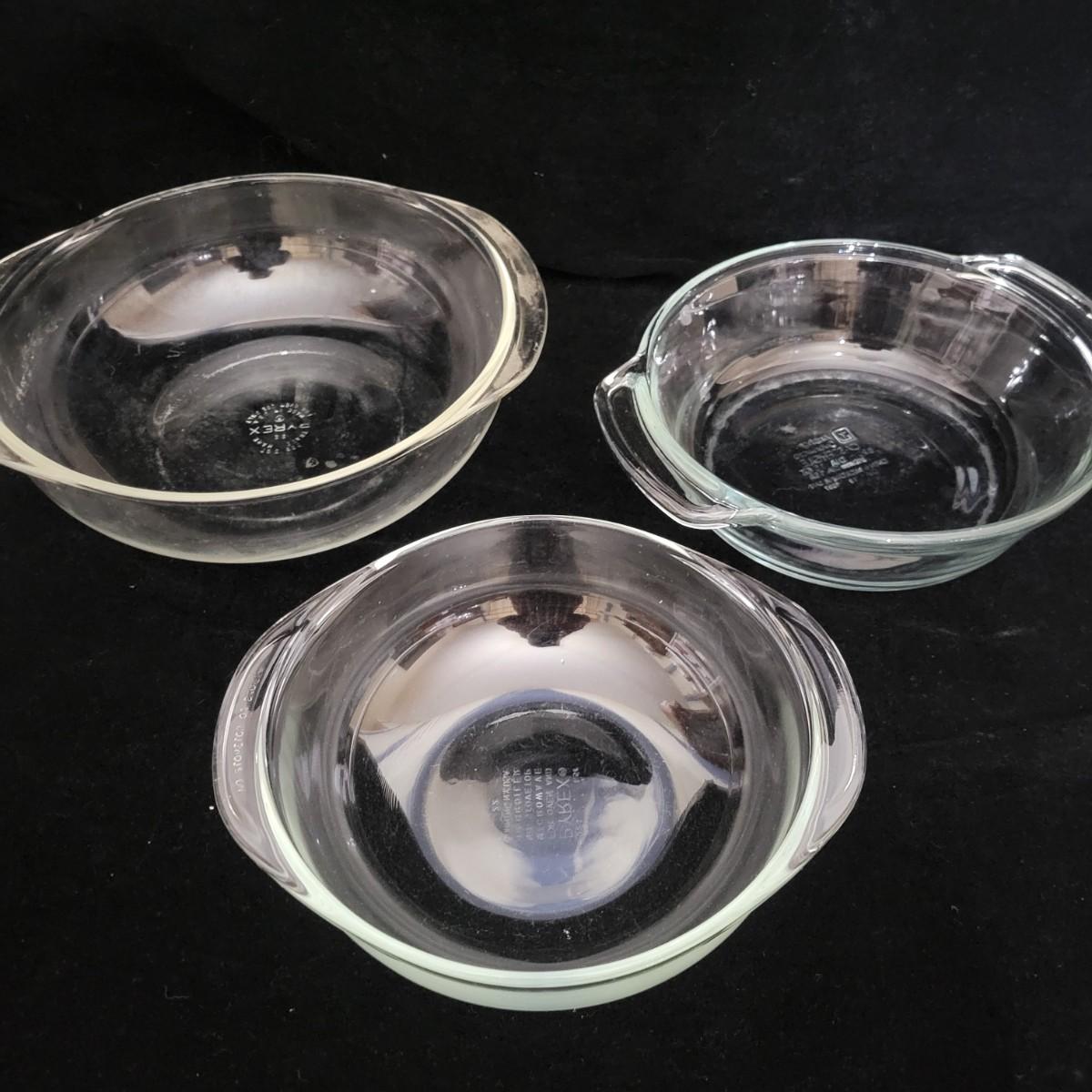An assortment of Corning Ware, Pyrex, and Anchor Hocking dishes in good condition with normal wear from use. Included is a collection of Pyrex dishes ranging from mixing bowls, casserole dishes, a butter dish and more. Also included is an assortment of Corning Ware. A Buenilum aluminum pie holder is also included. Largest Pyrex bowl measures approximately 11.5"D x 3"H. Local pickup only