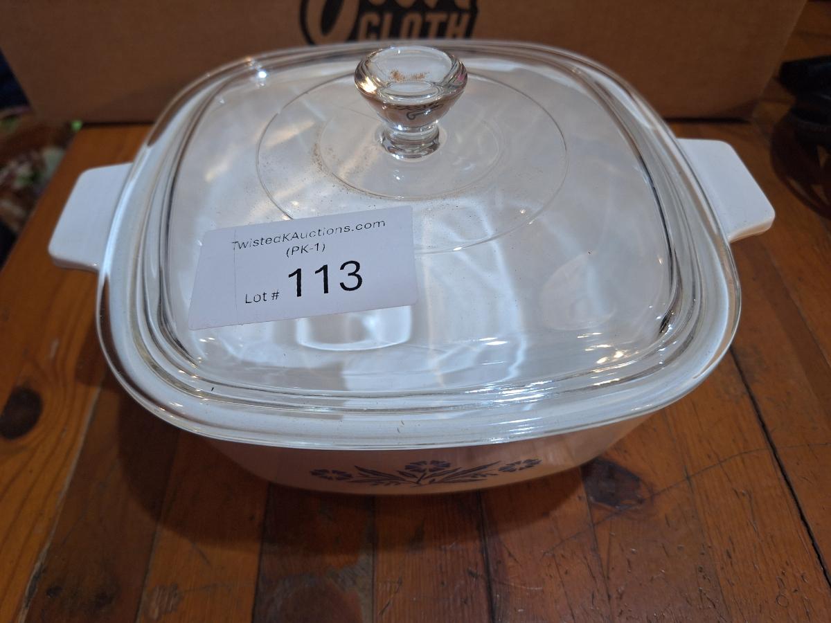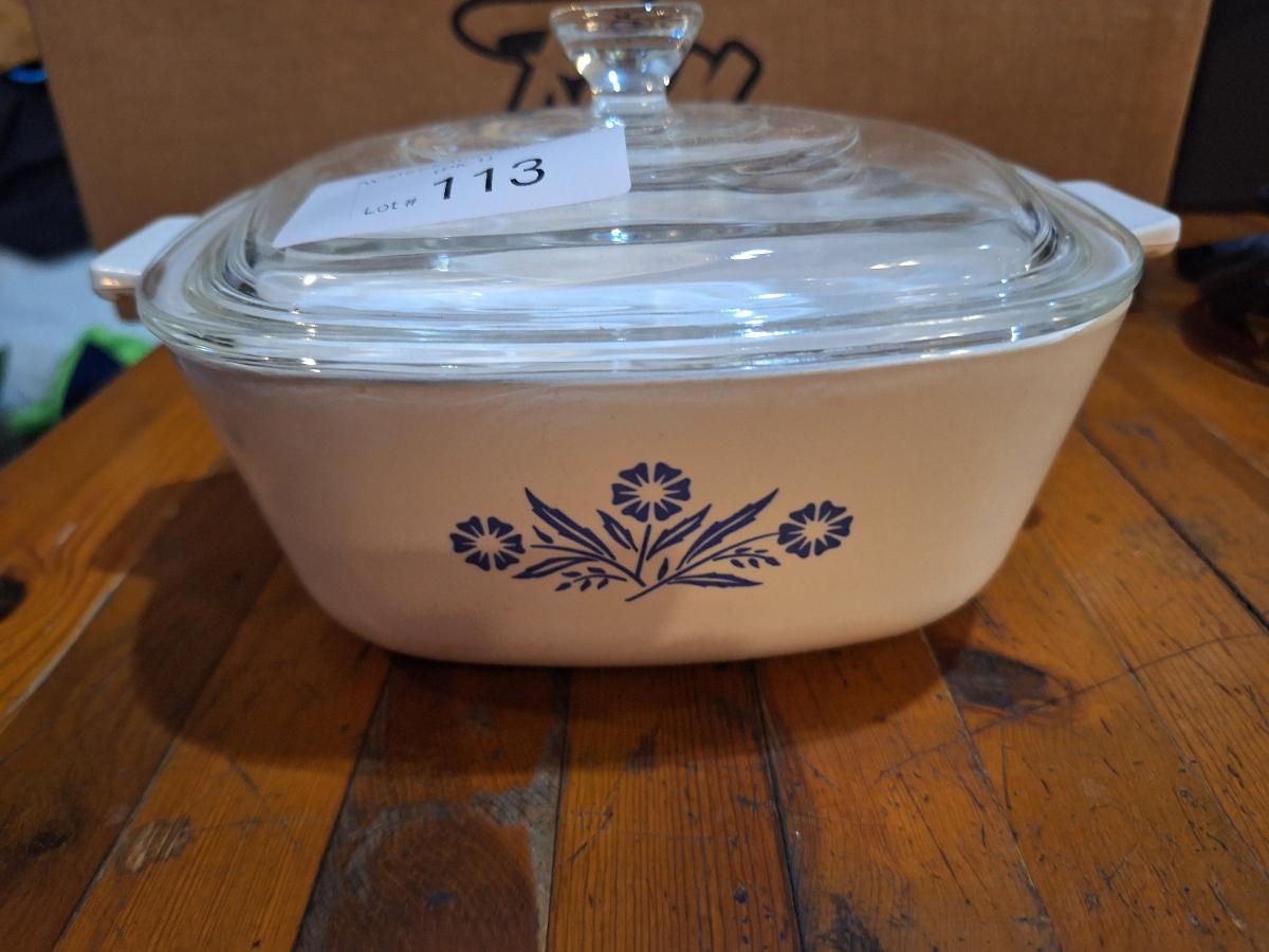 Corning Ware Blue Cornflower 1.5 qt casserole dish with a clear glass lid.