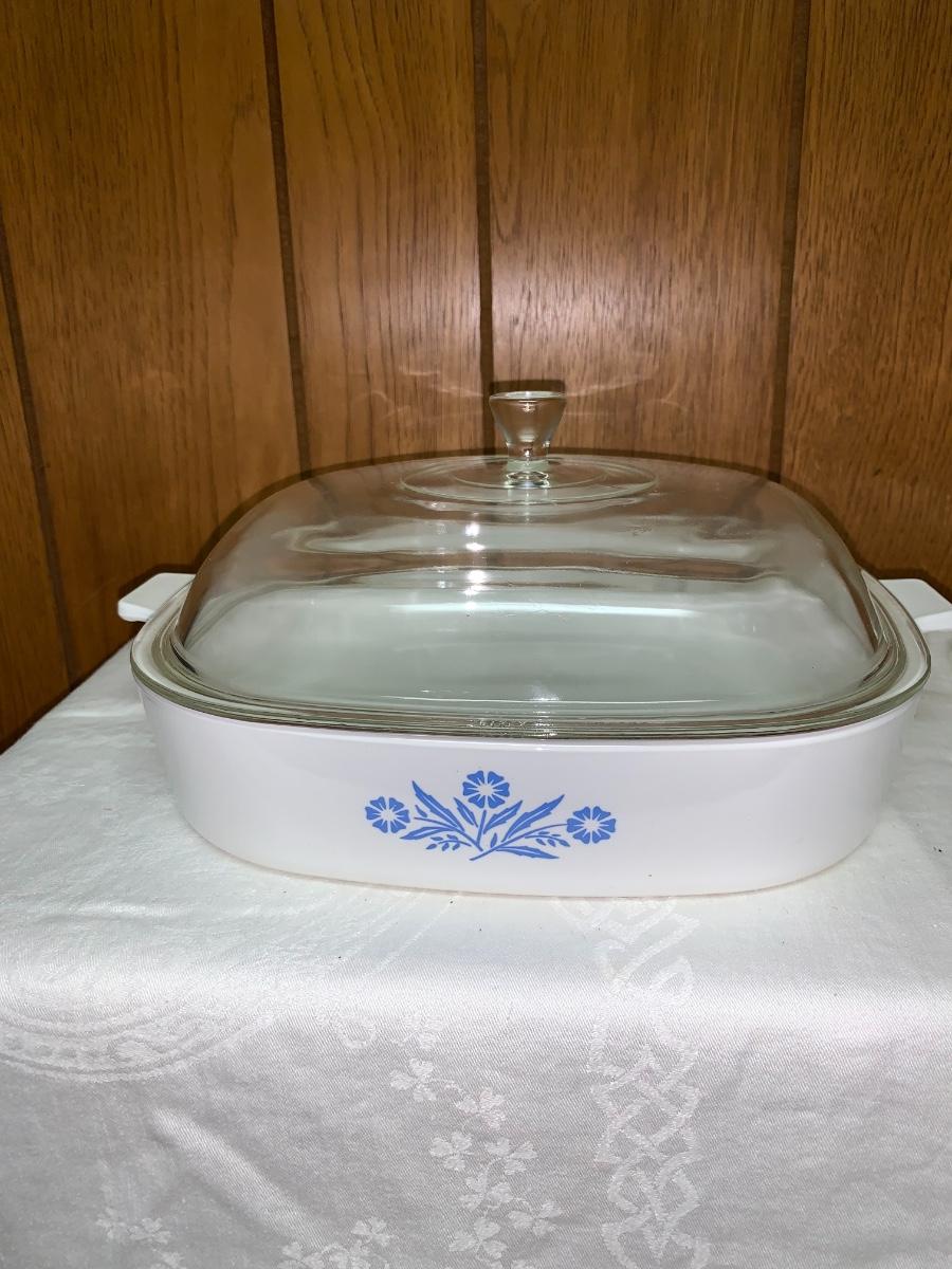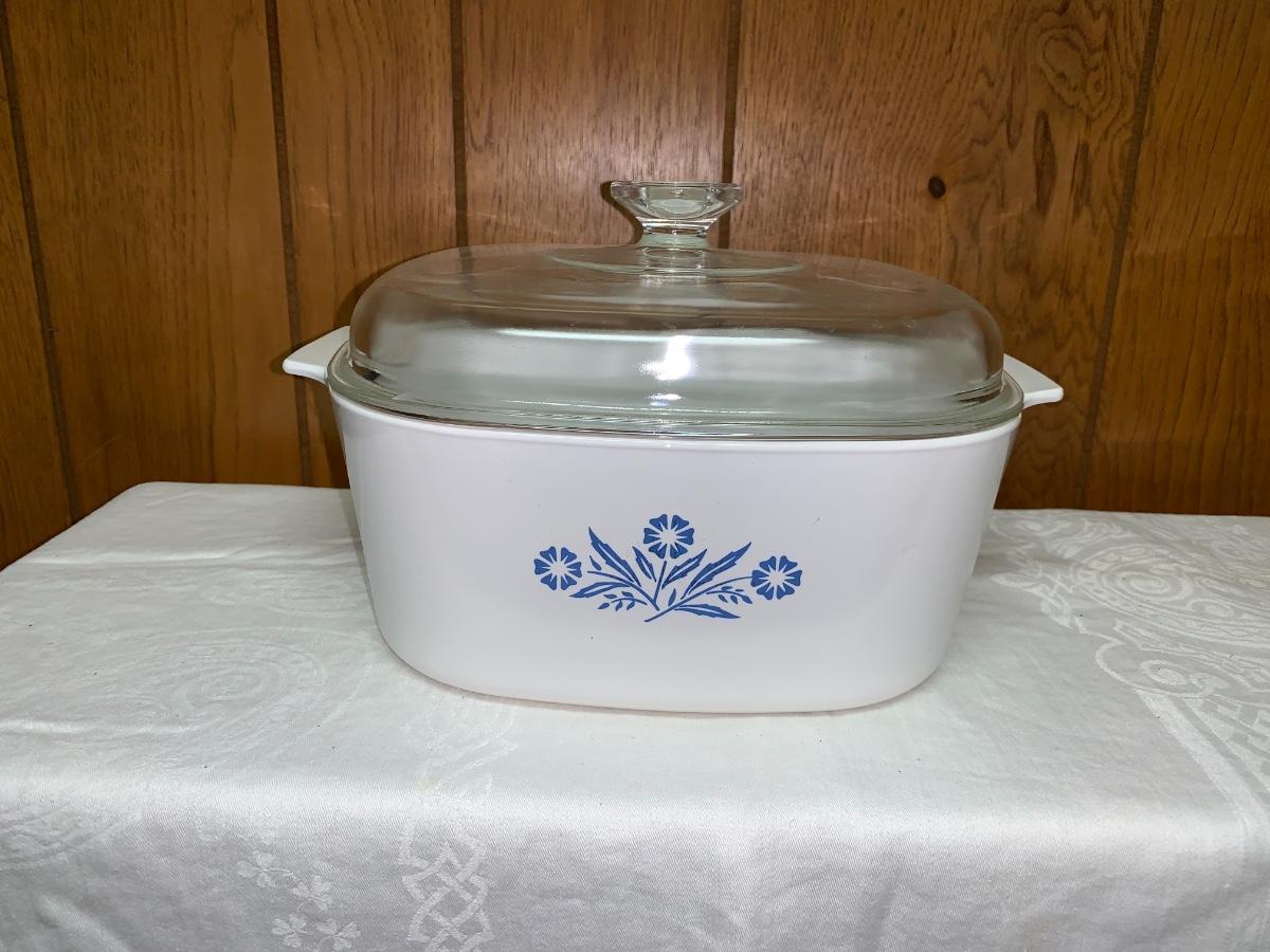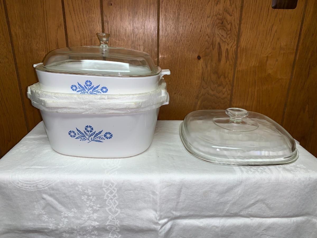 Set of 2 cornflower casseroles, each with it's own lid. Excellent condition. Larger one marked A-5-B 5 Qt.