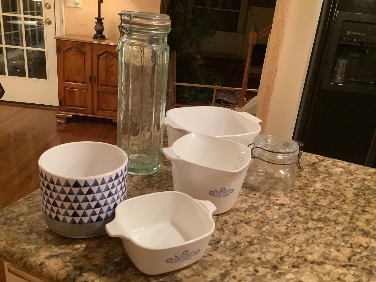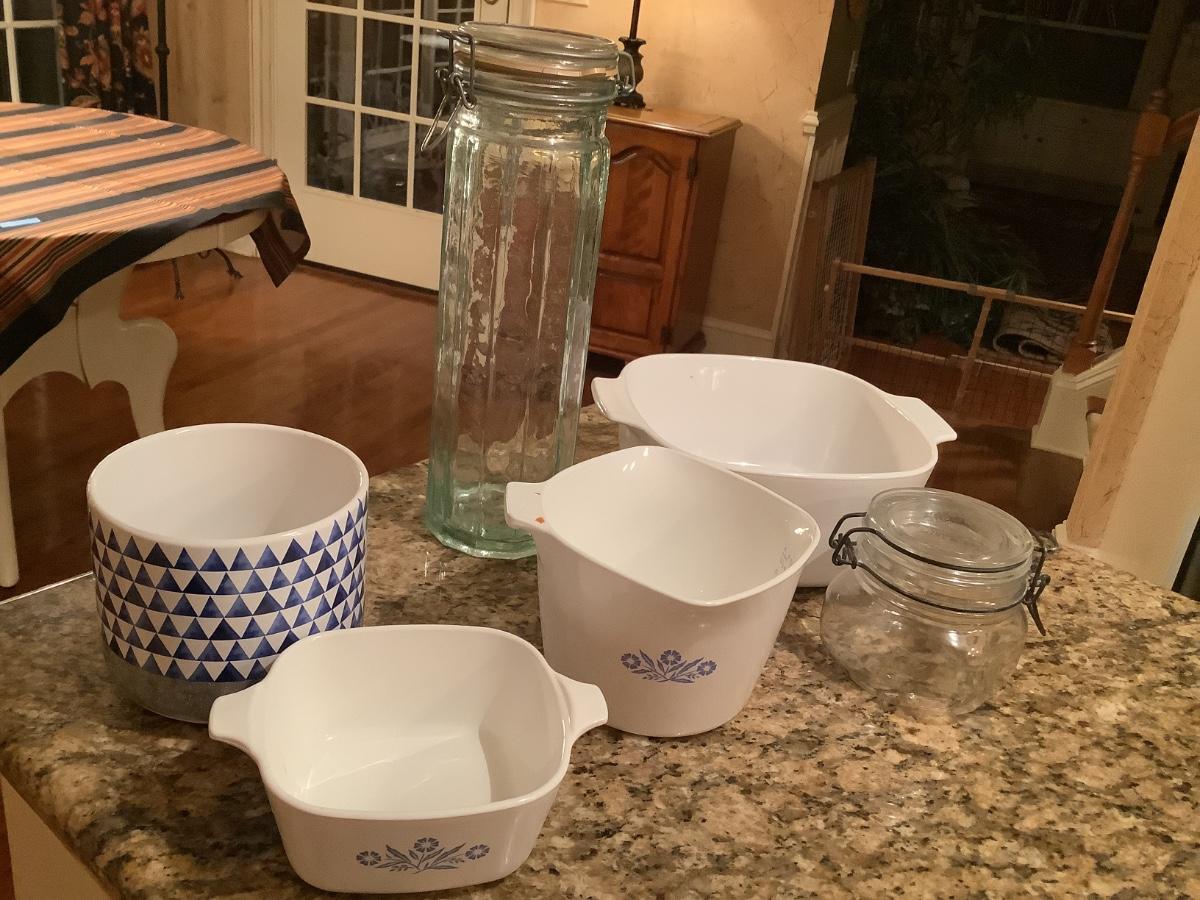 Corning ware pieces, blue/white pot, clamp lid jars