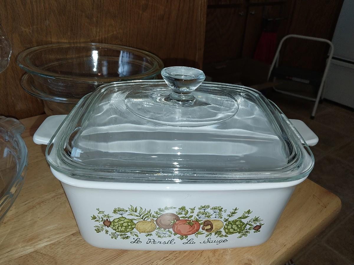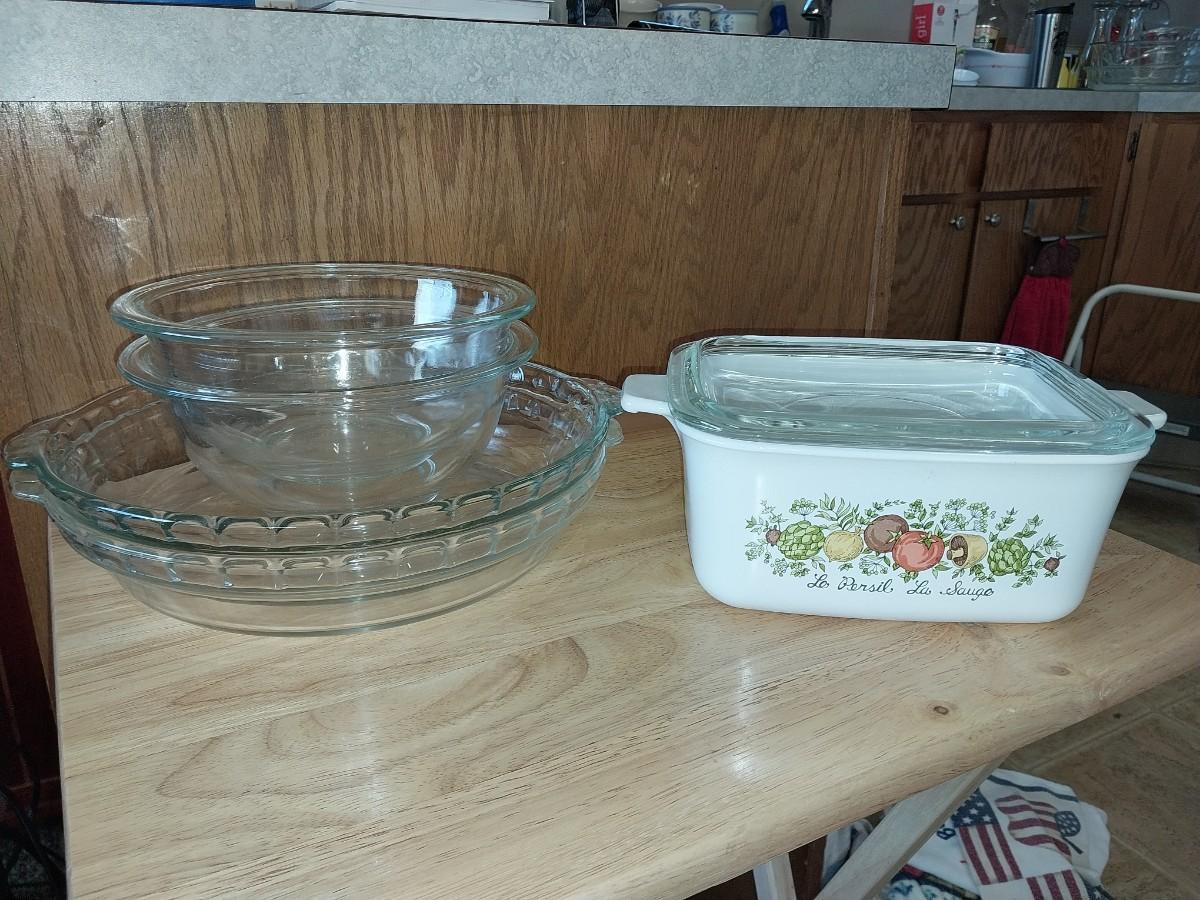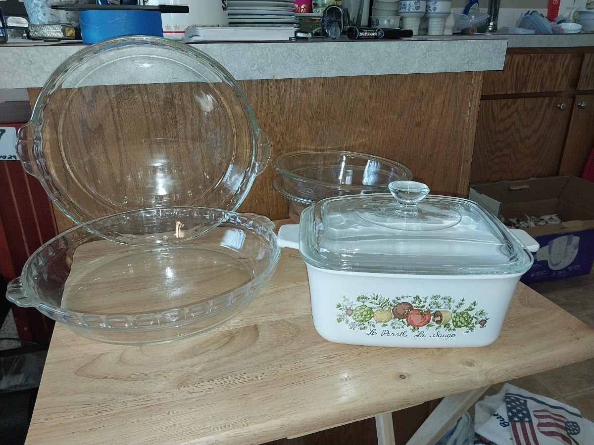 CORNING WARE CASSEROLE DISH, GLASS PIE PANS AND BOWLS