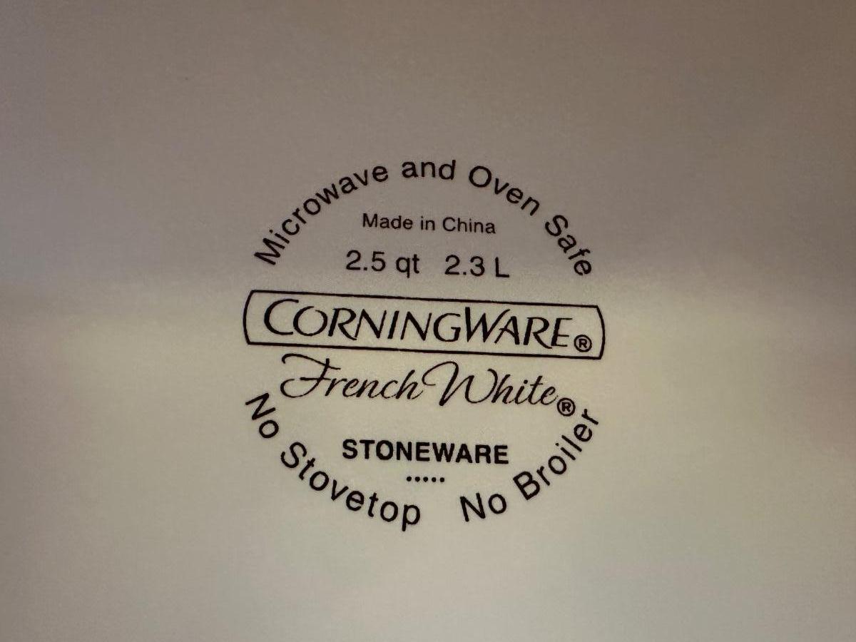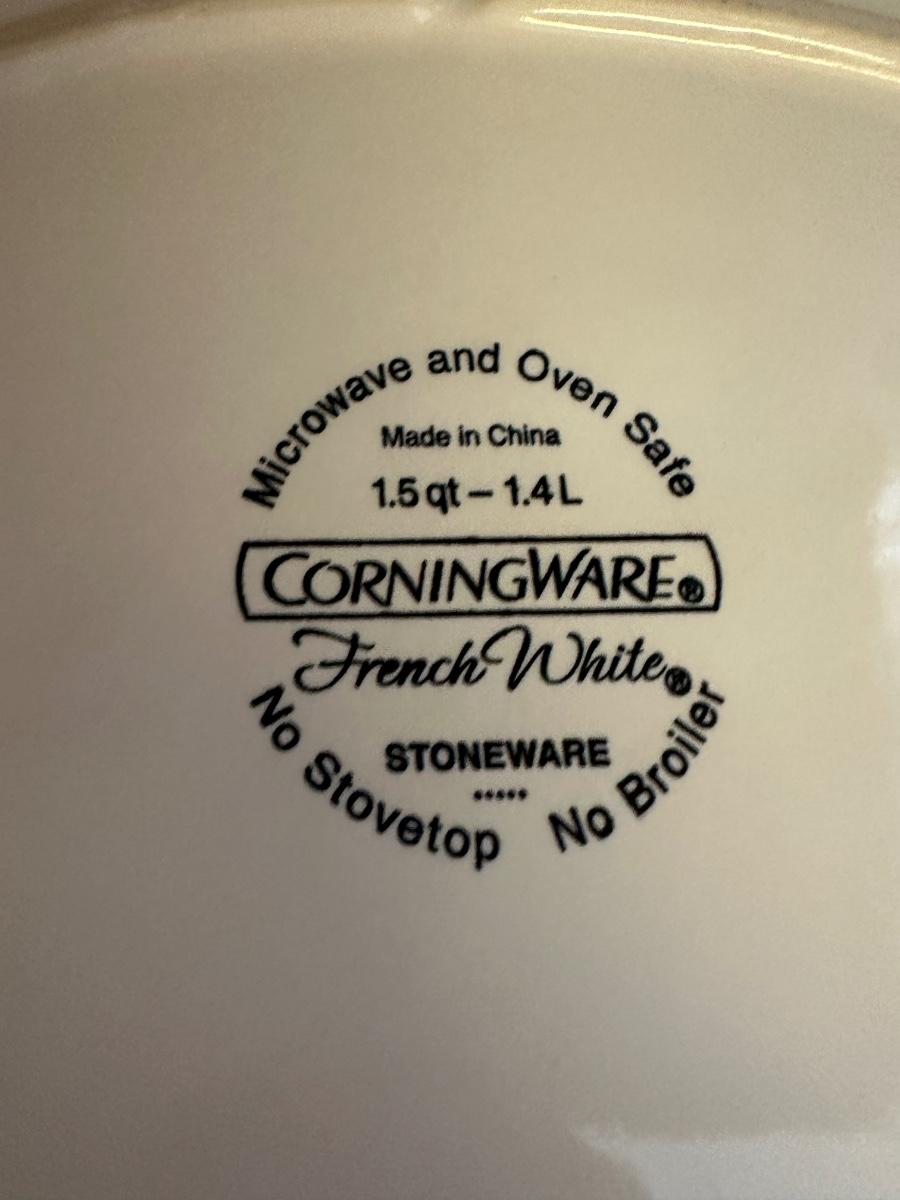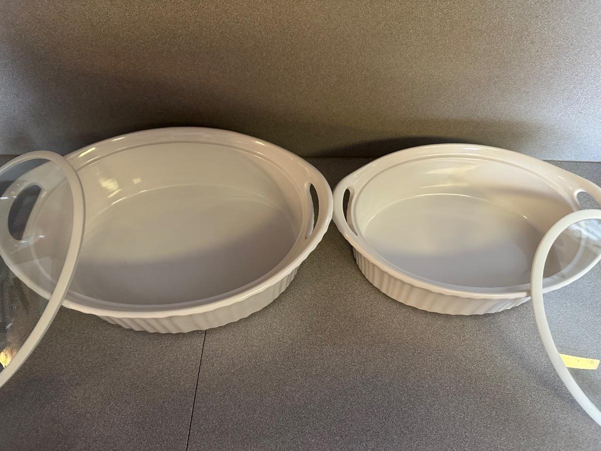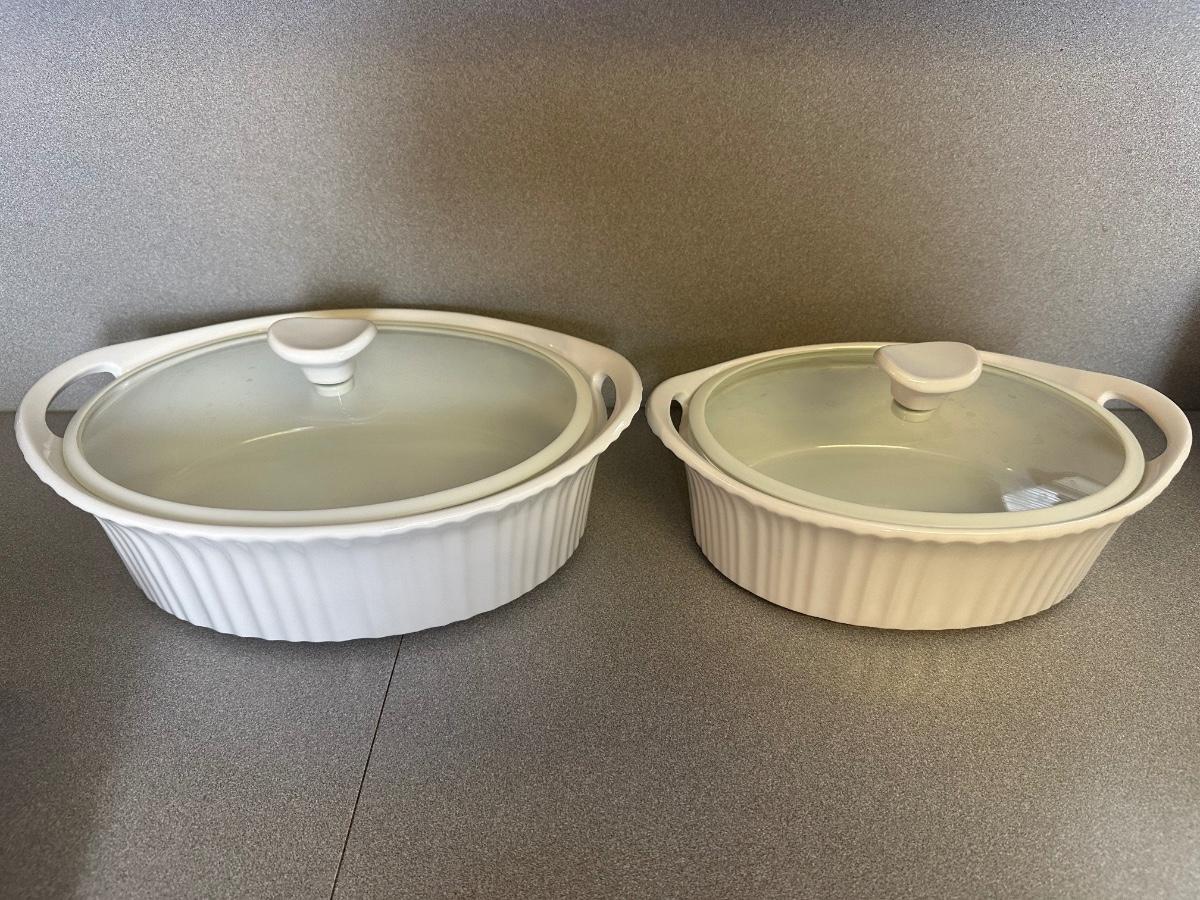 Stoneware Corning: 1.5 and 2.5 quarts. Lids are glass with silicone protective edge.