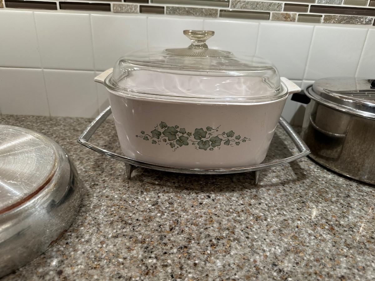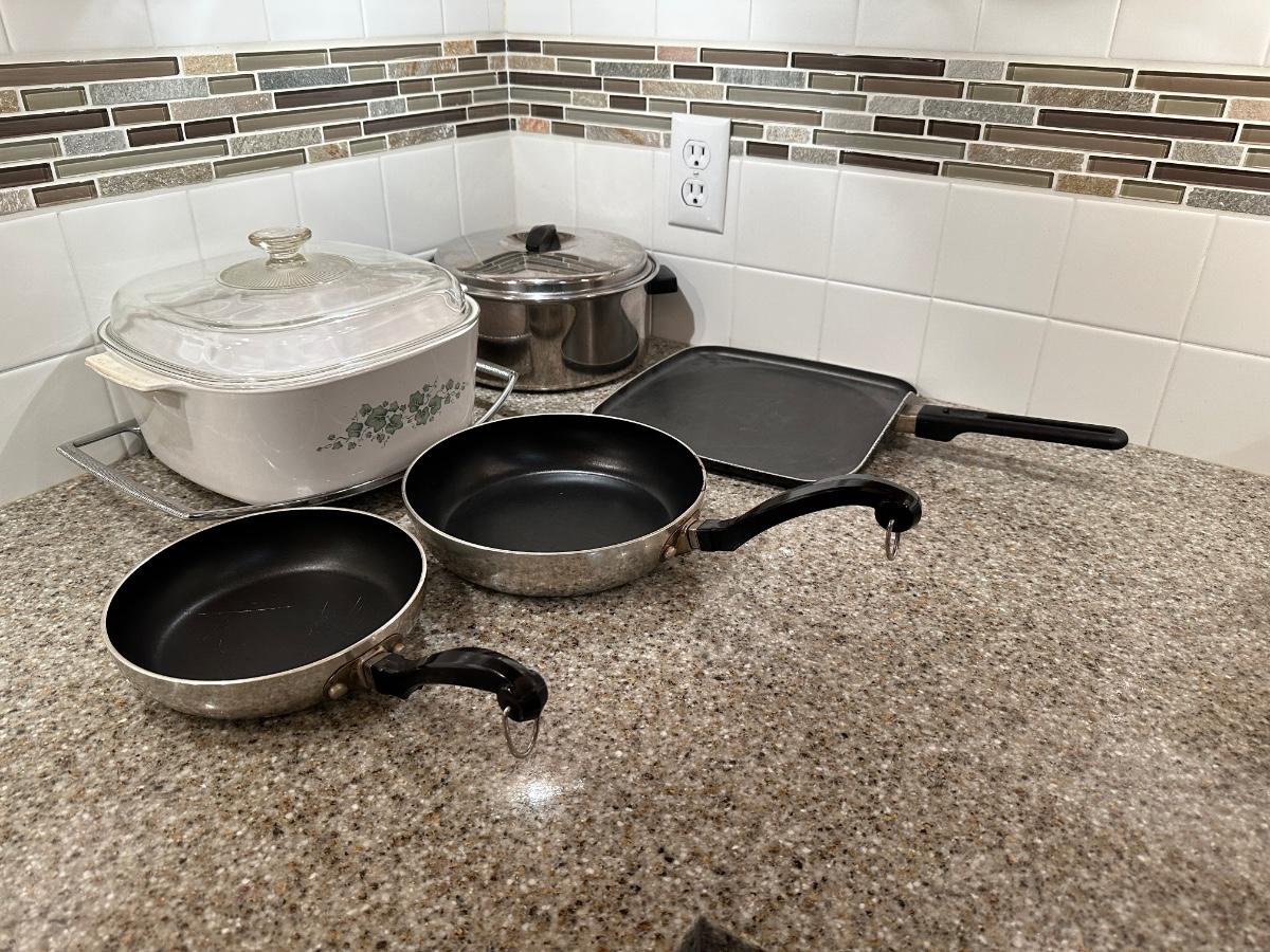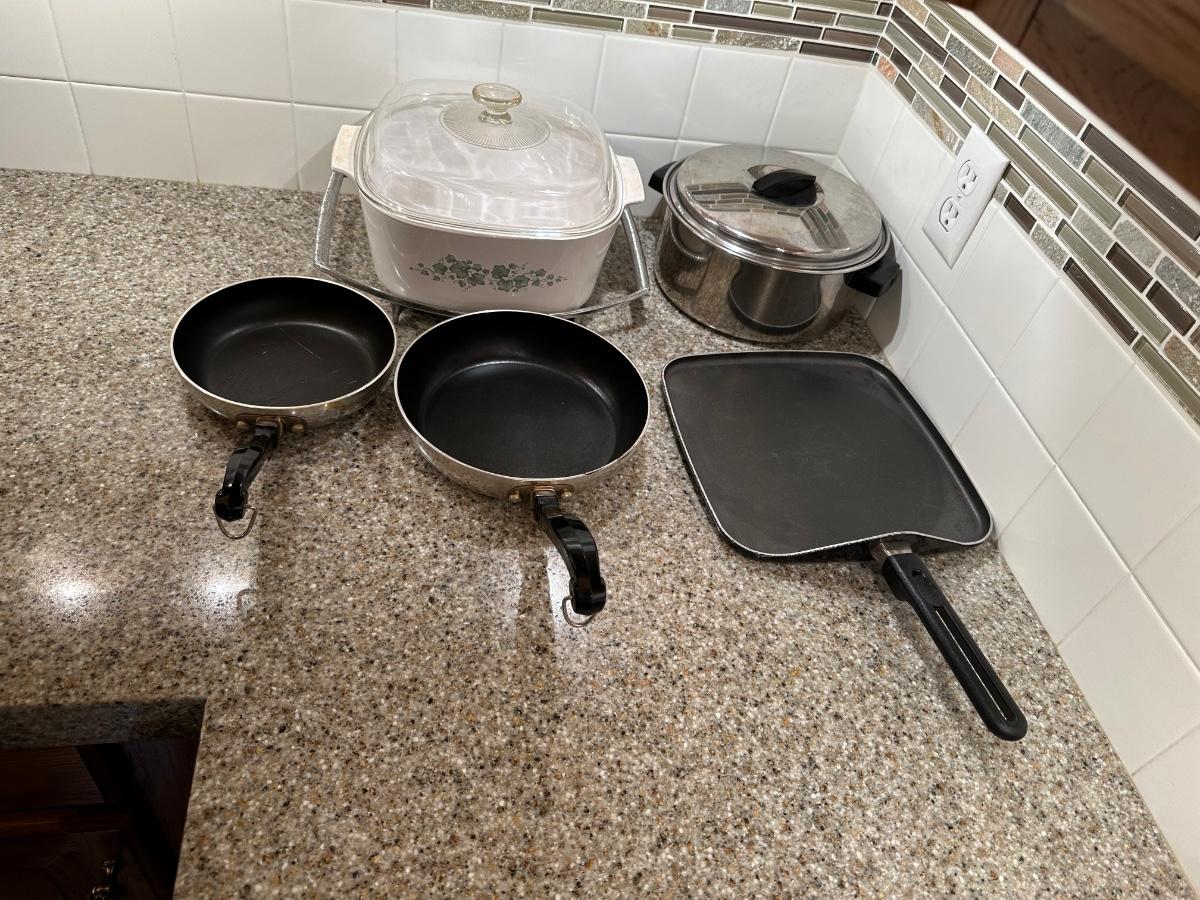 CORNING WARE DISH, SKILLETS AND SAUCE PAN