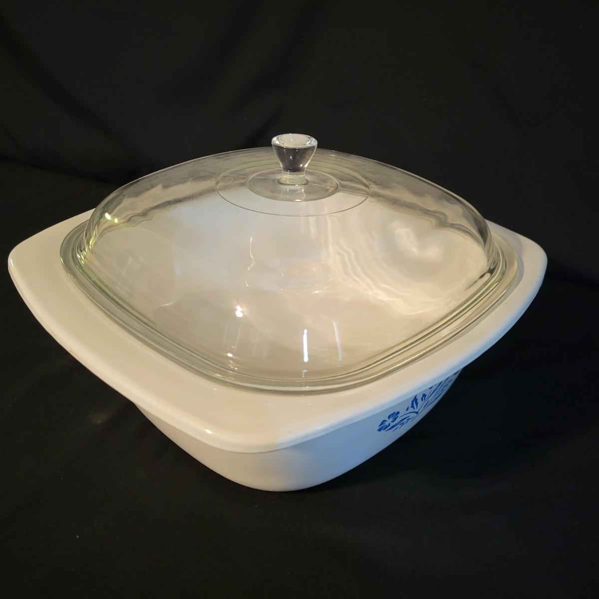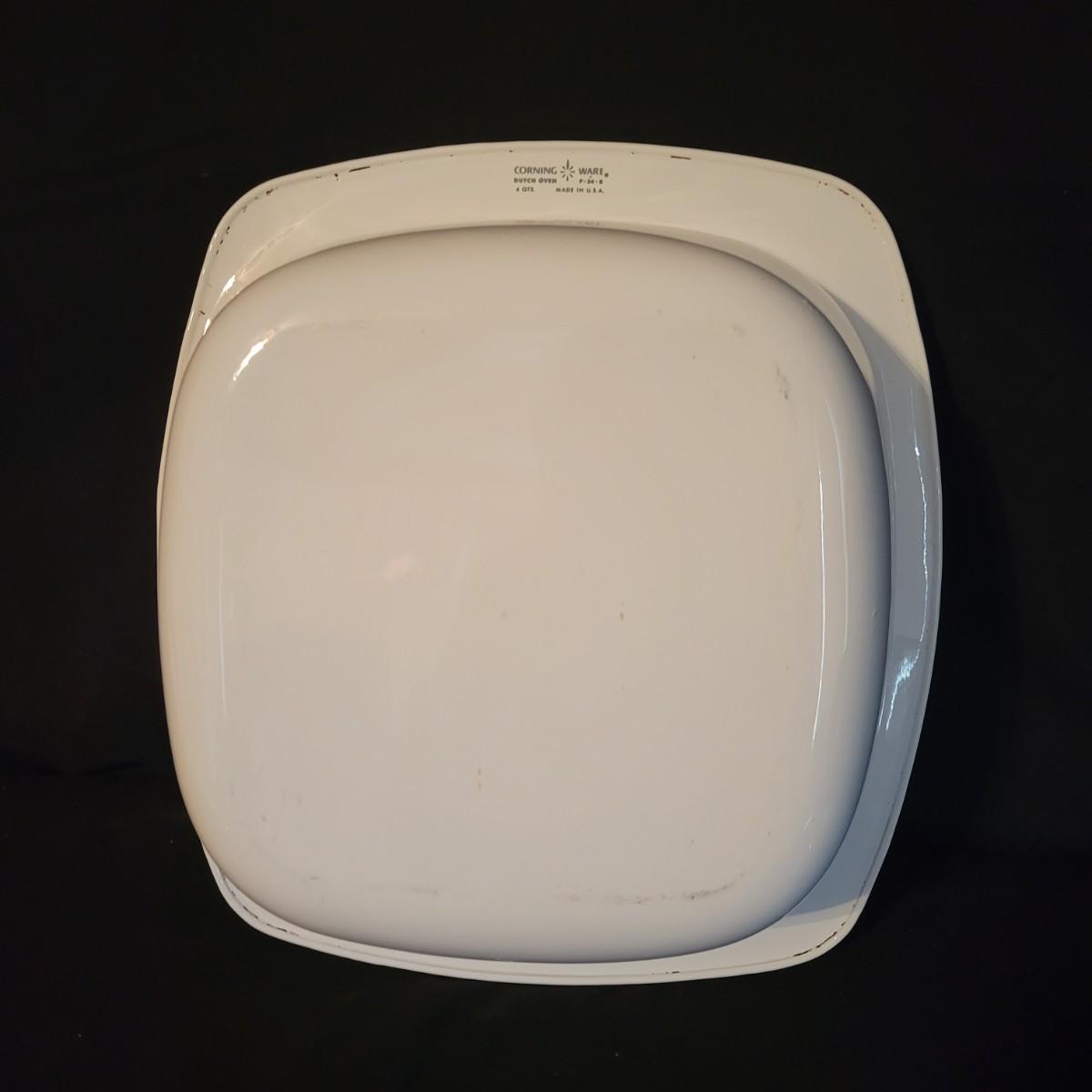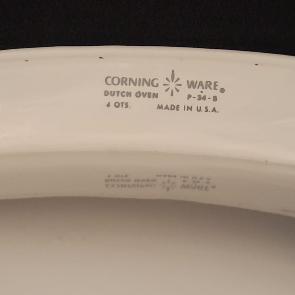 A vintage Corning Ware enameled Dutch over that is four quarts. It measures approximately 12" x 11.5" x 8"H and includes its lid. Shipping available