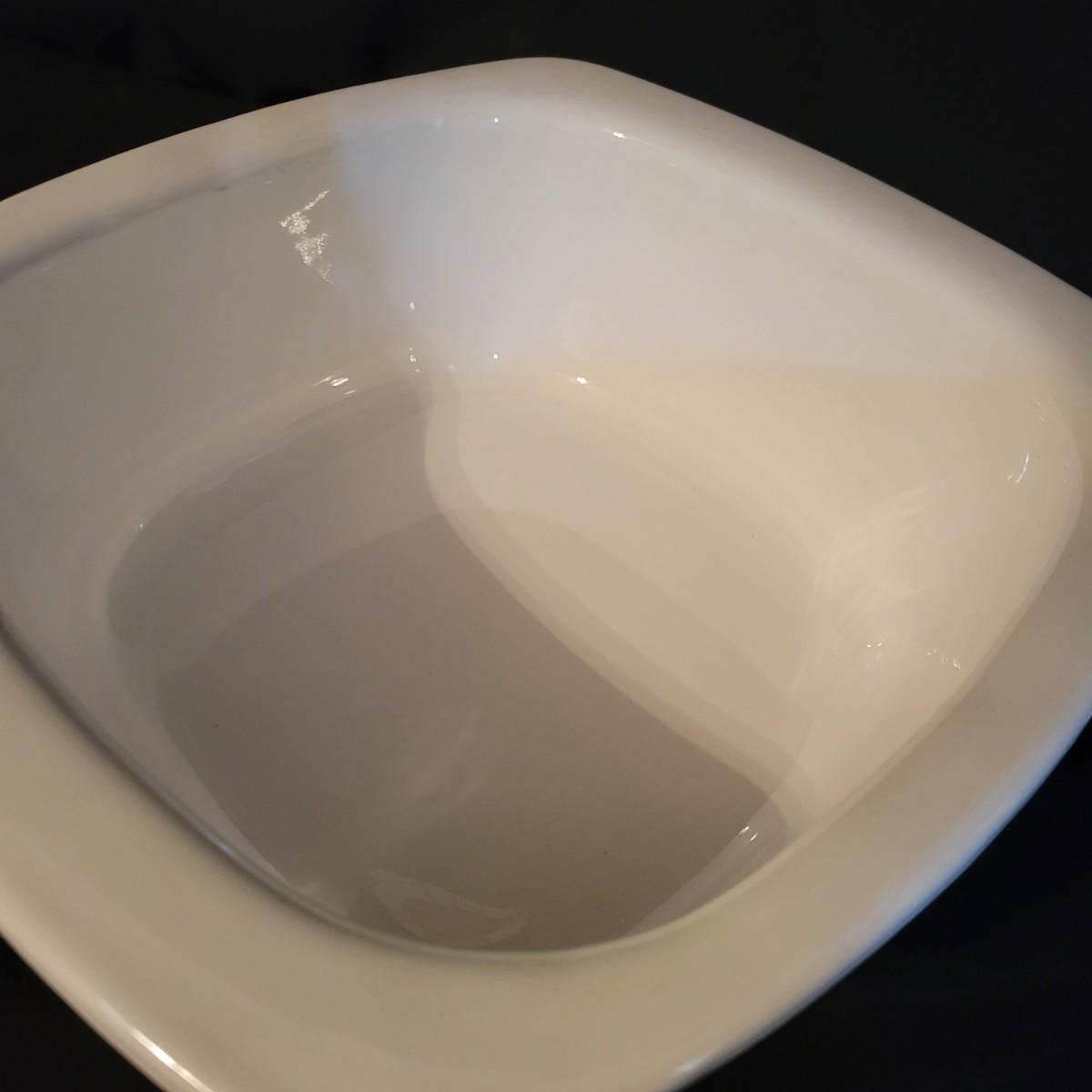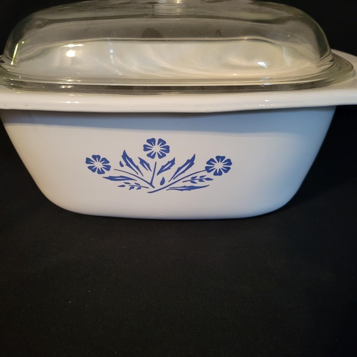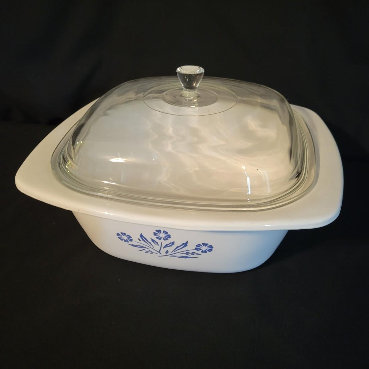 A vintage Corning Ware enameled Dutch over that is four quarts. It measures approximately 12" x 11.5" x 8"H and includes its lid. Shipping available